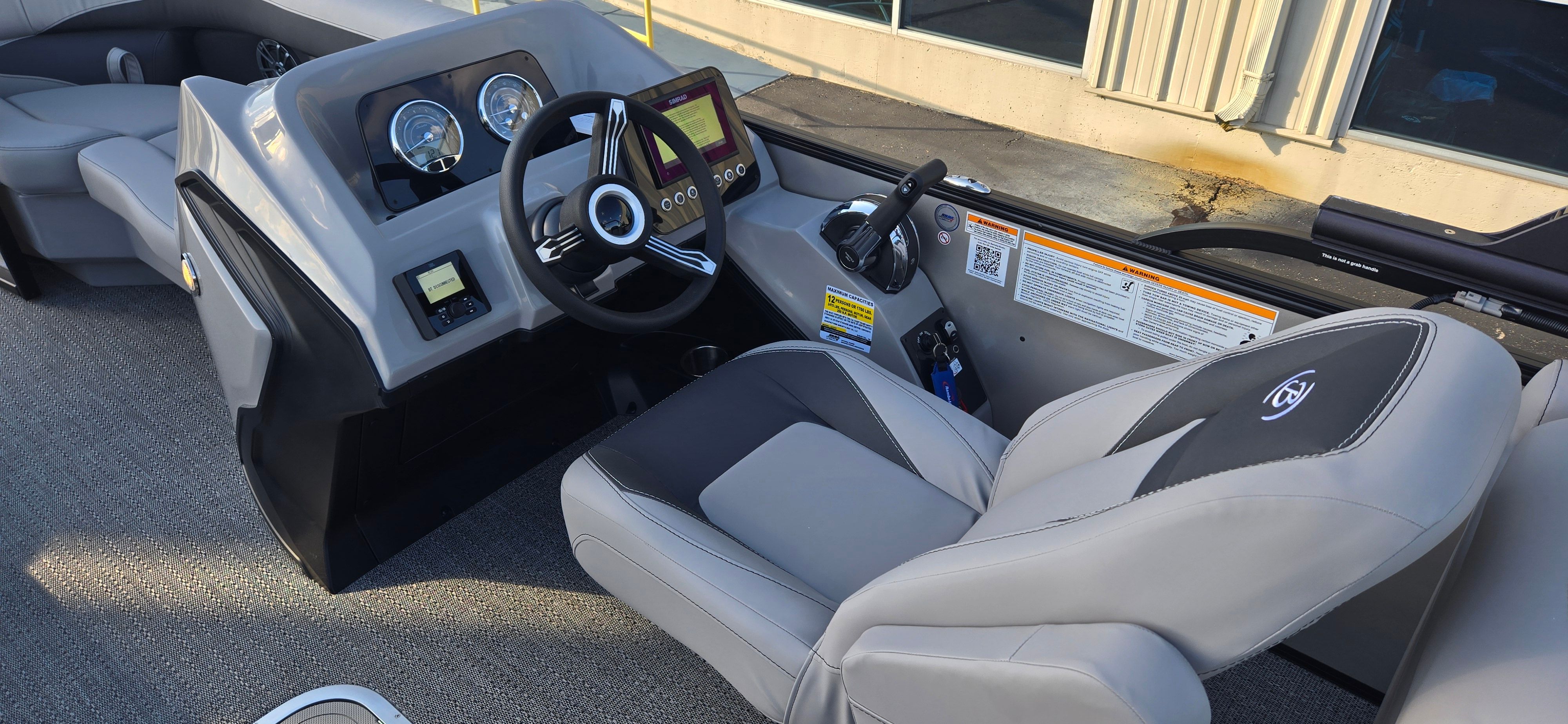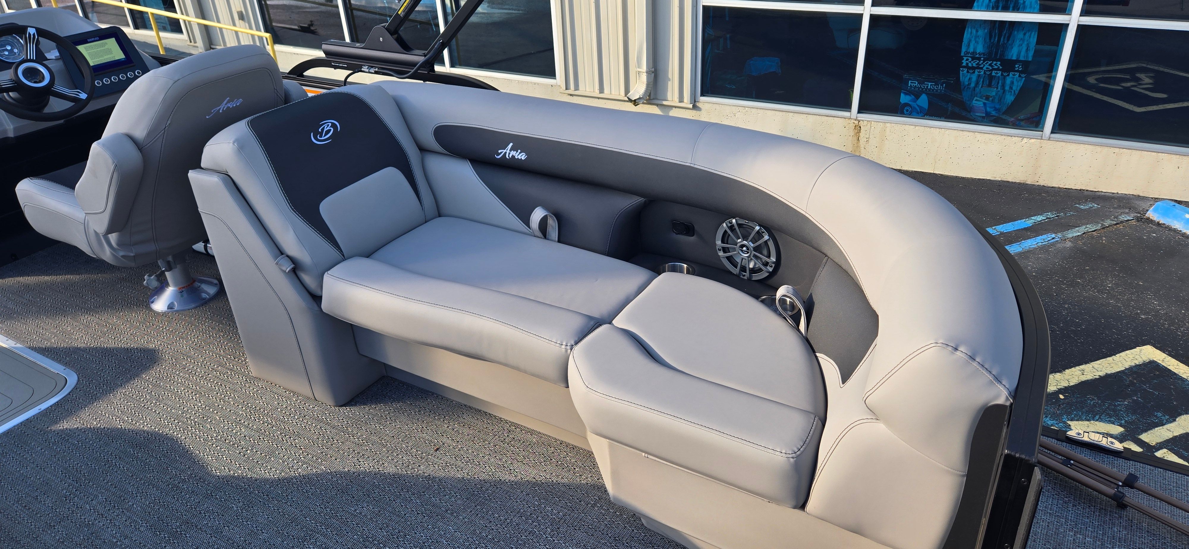 The Barletta Aria A22QC-Platinum is loaded with premium features that elevate your boating experience. The striking Railskin color in Champagne, paired with the Black Diamond accent and the Blackout Package Aria, creates a modern and sophisticated exterior that stands out from the crowd. Inside, the Tempest Gray furniture offers plush comfort and durability, while the Amore Gray flooring adds a touch of elegance and is easy to maintain. The Triple Toon Package Aria enhances stability and buoyancy, providing a smooth and secure ride even when the boat is fully loaded with family and friends. The exterior is further adorned with a stainless steel flag pole and an American flag, adding a patriotic flair to your on-the-water adventures.