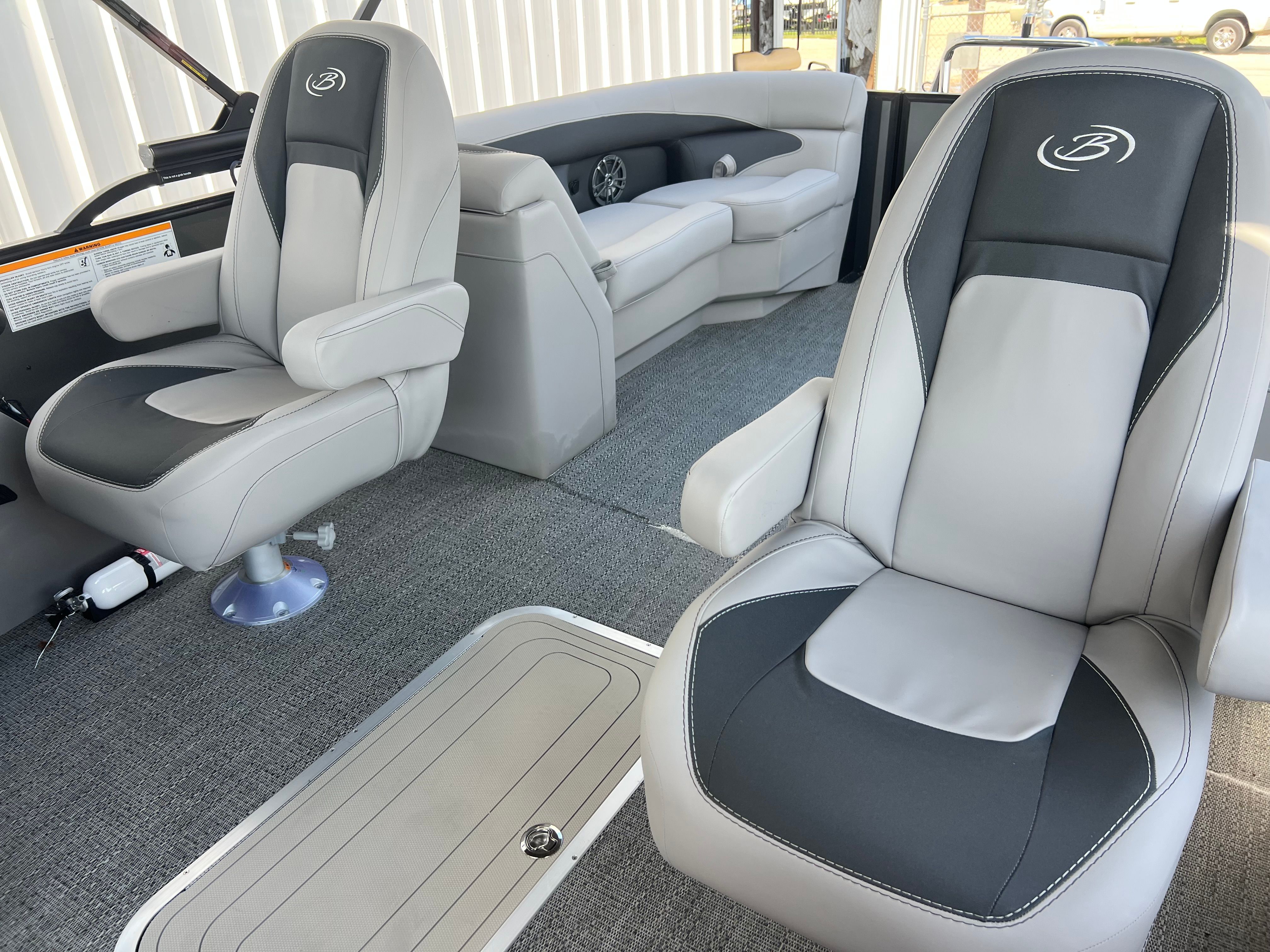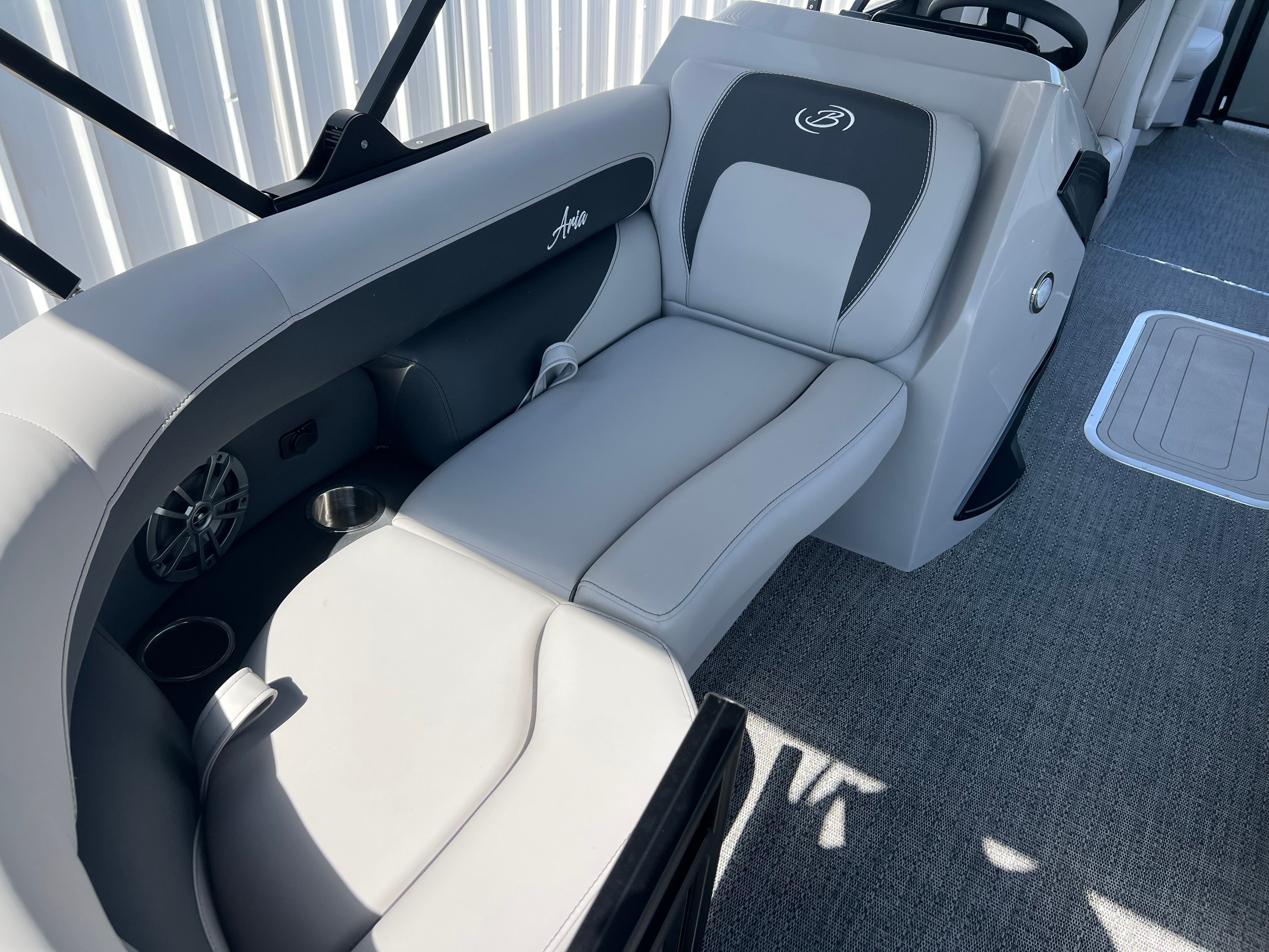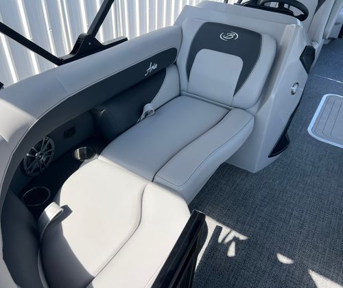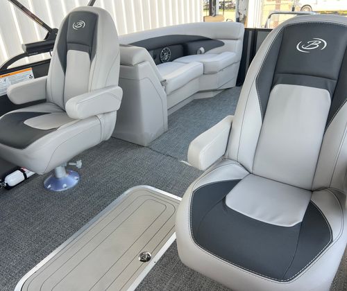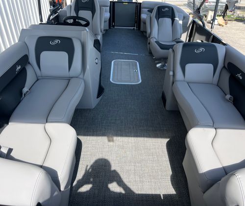 The Barletta Aria A22QC-Platinum is packed with special features that set it apart from other pontoon boats for sale. The Railskin Color Aria in Gray Moonstone gives the exterior a sophisticated and modern look, while the Blackout Package Aria adds a bold touch of elegance. Inside, the Tempest Gray furniture offers both comfort and style, creating a welcoming atmosphere for passengers. The Amore Gray flooring is not only visually appealing but also designed for durability and easy maintenance.One of the standout features is the Double Bimini canvas, providing ample shade and protection from the sun, so you can relax in comfort no matter the weather. The In Floor Midship Storage offers convenient space for stowing gear, water toys, and other essentials, keeping the deck clutter-free and organized. With the Triple Toon Package Aria, you’ll benefit from enhanced buoyancy and stability, making every ride smoother and more enjoyable.