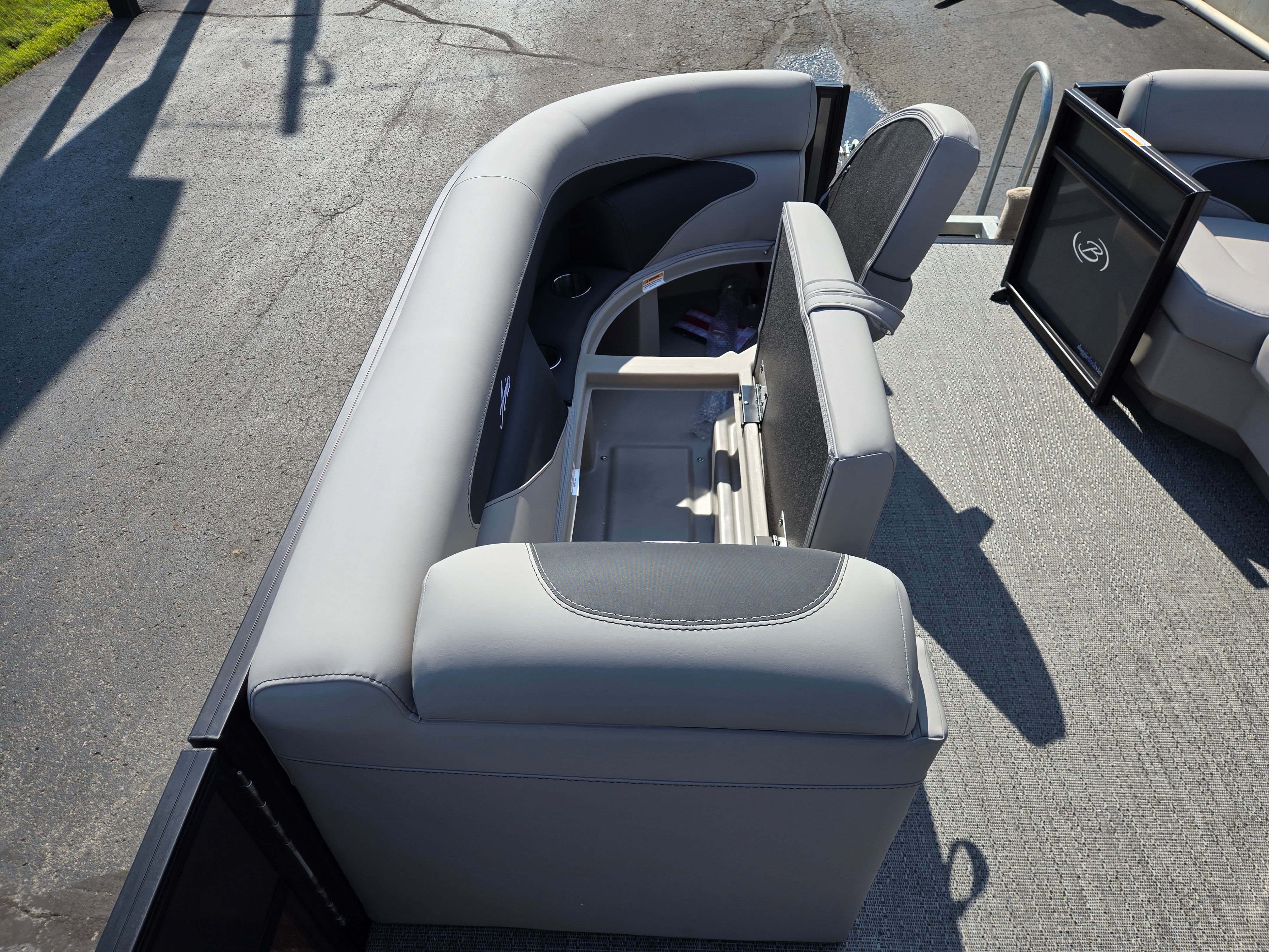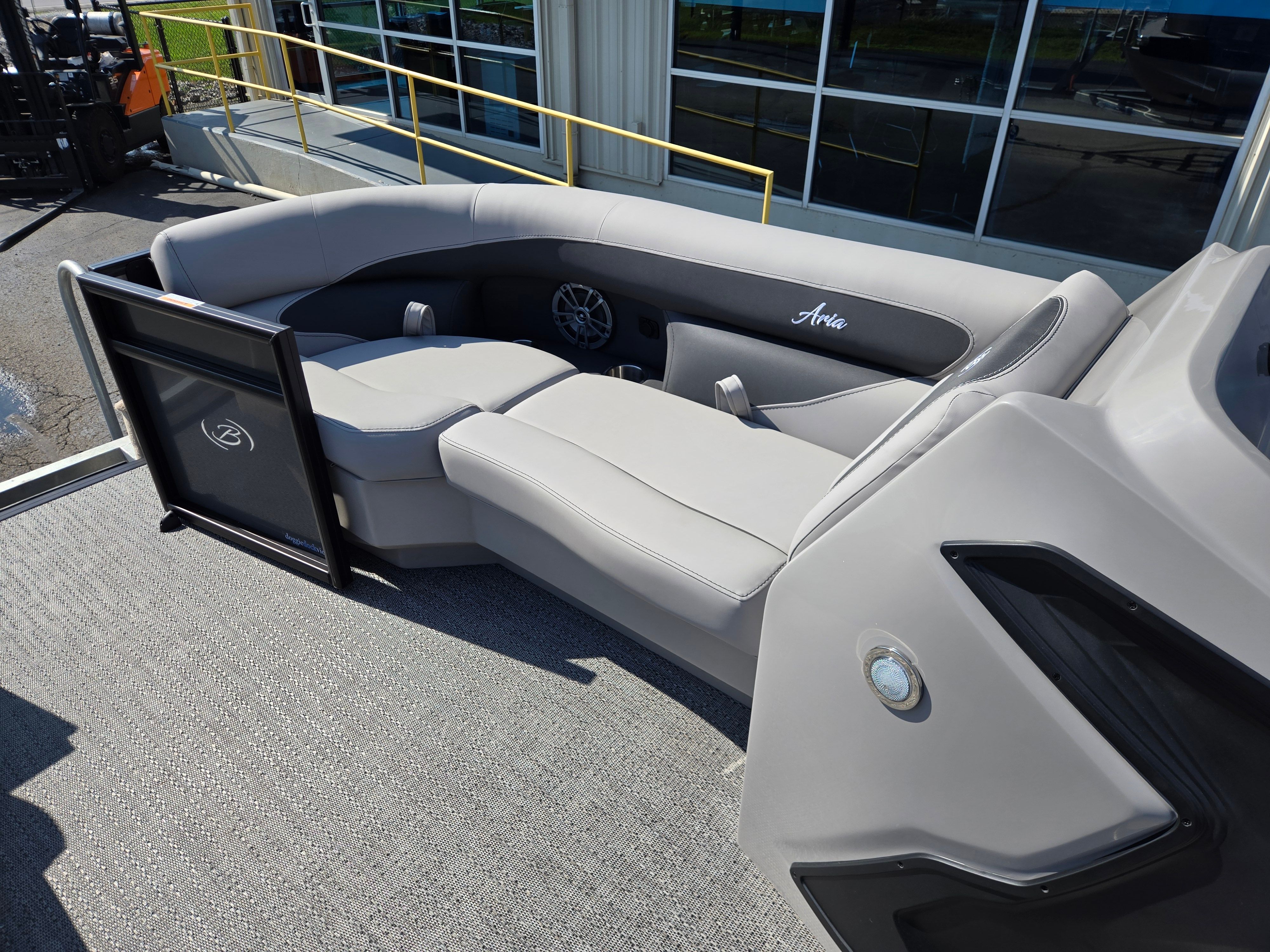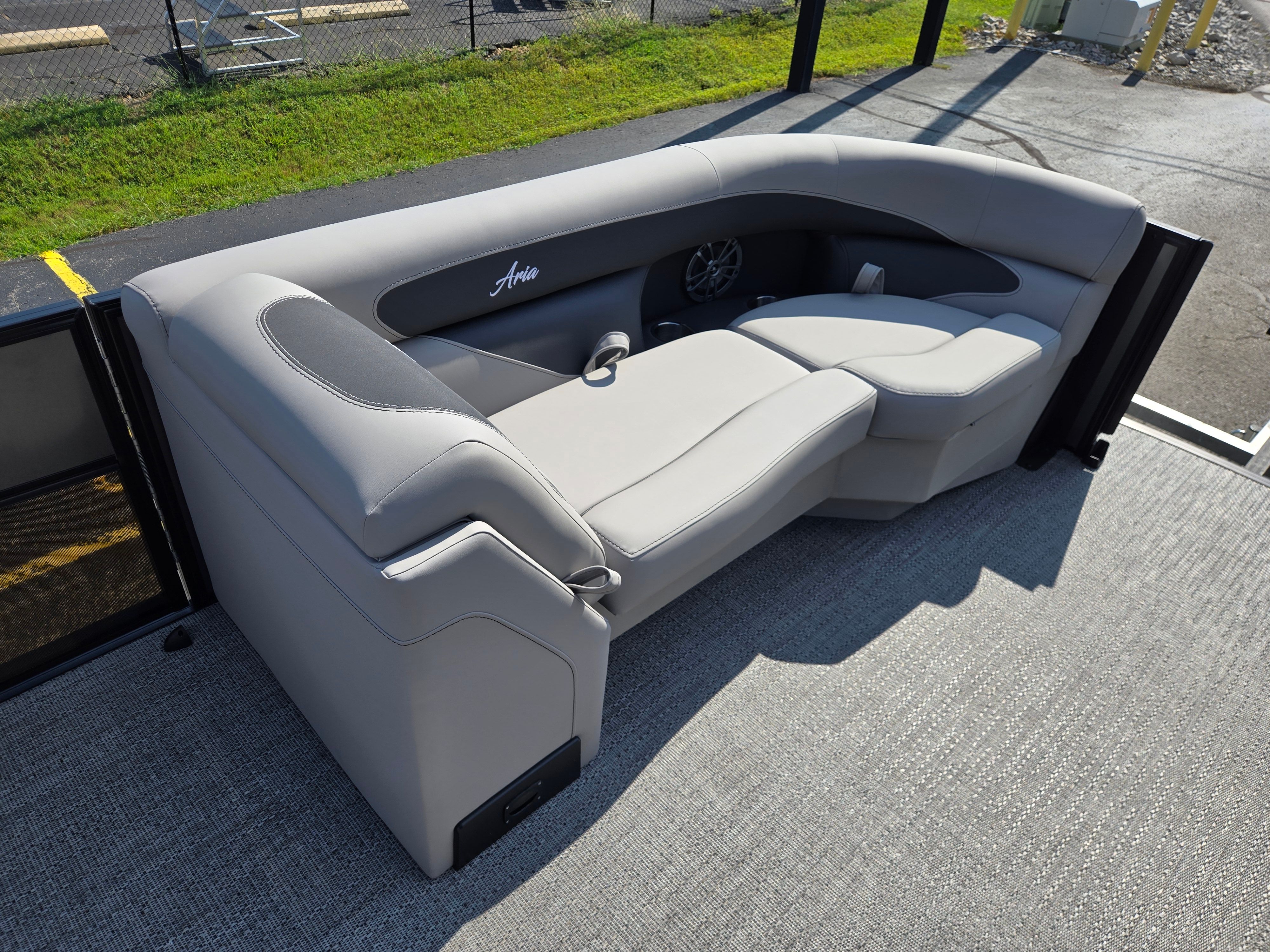 Step aboard the Barletta Aria A22QC-Platinum and discover a host of premium features designed to enhance your boating experience. The flooring is finished in Amore Gray, providing a stylish and comfortable surface that’s easy to maintain. The furniture, upholstered in Tempest Gray, offers plush seating and ergonomic support, ensuring every passenger enjoys maximum comfort throughout the day. The Triple Toon Package Aria adds stability and buoyancy, delivering a smooth and secure ride even in choppy waters.The railskin packages feature the Blackout Package Aria, complemented by the elegant Gray Moonstone railskin color, giving the boat a sophisticated and modern appearance. Navigation is made simple and intuitive with the Simrad 7" G07 XSE, a state-of-the-art display that provides real-time data and easy access to essential controls. Adding a touch of patriotism and style, the stainless steel flag pole with an American flag is a distinctive feature that sets this pontoon apart.