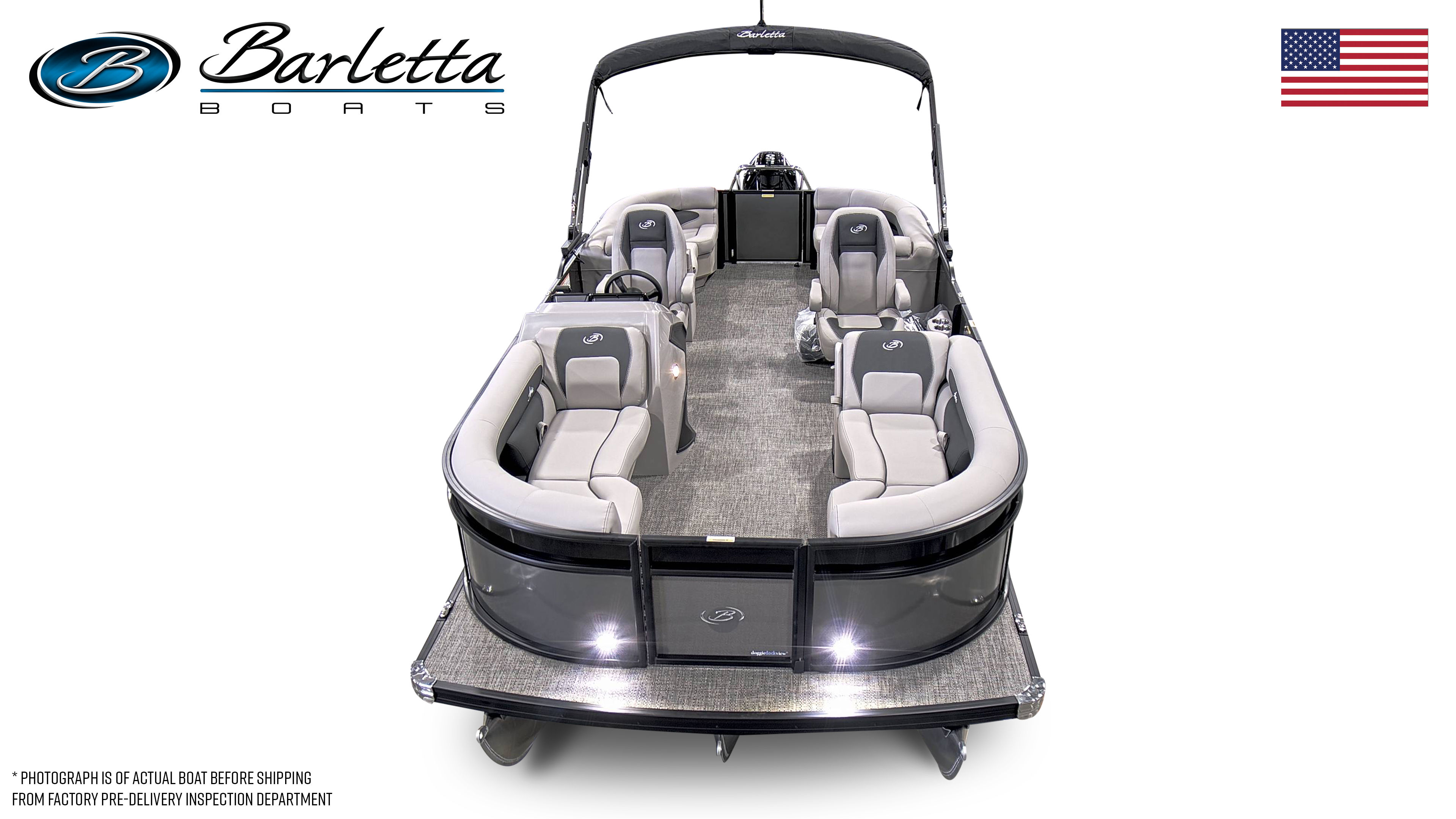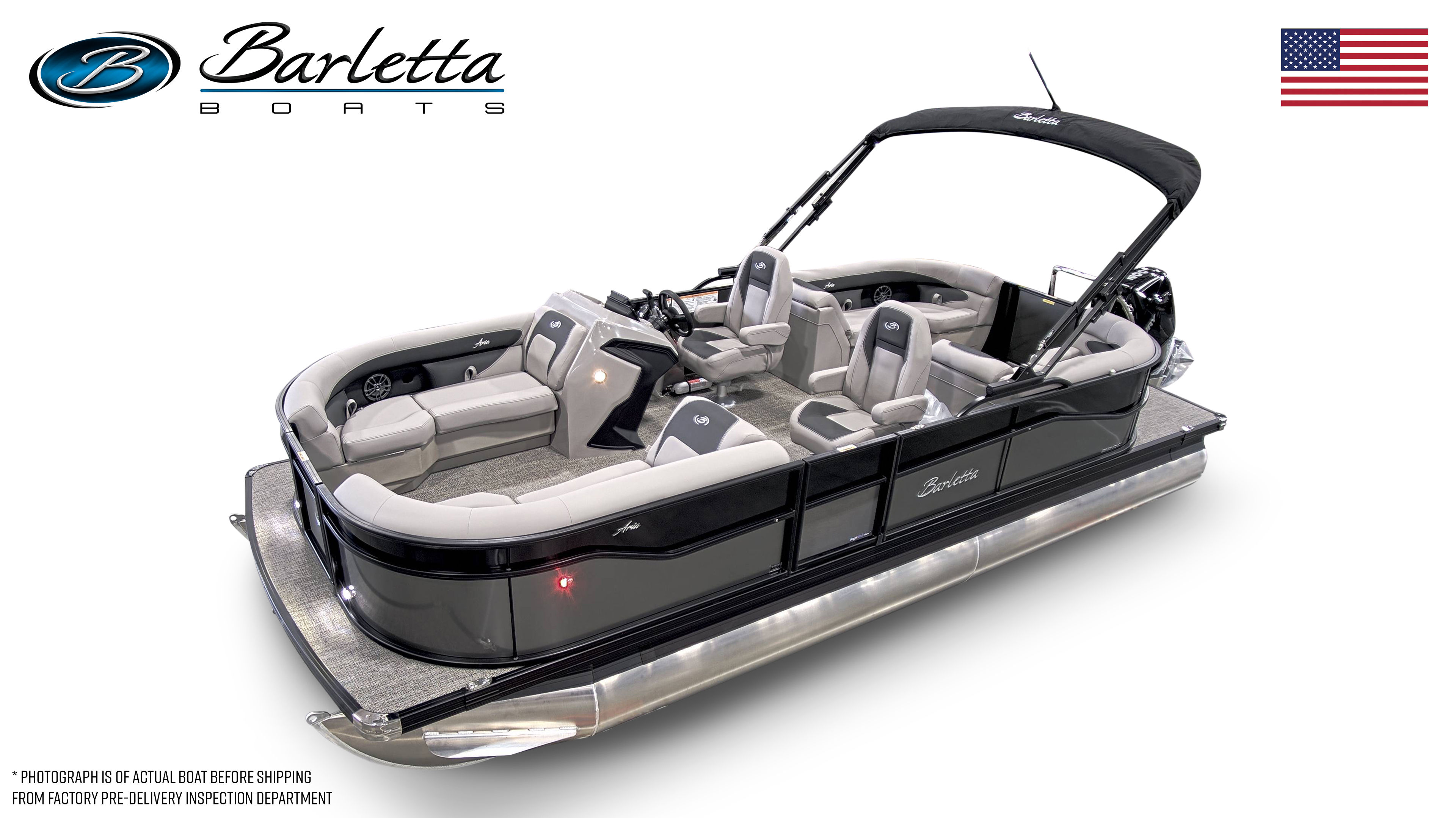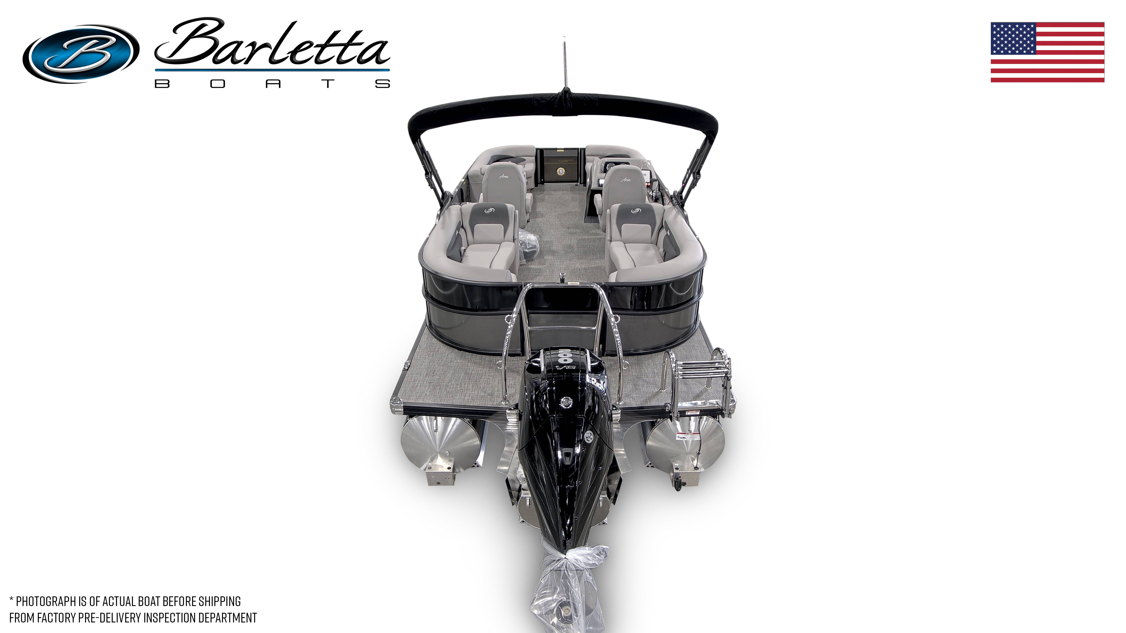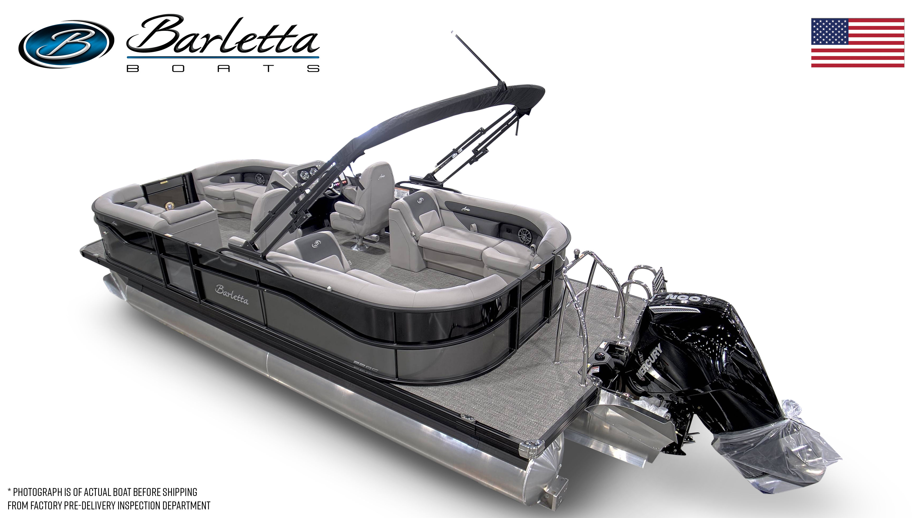 The Barletta Aria A22QC-Platinum is loaded with features designed to maximize comfort, style, and functionality. The Railskin Color Aria in Gray Moonstone, paired with the Black Diamond accent and Blackout Package Aria, gives the boat a sophisticated and modern look. Inside, the Tempest Gray furniture provides plush, supportive seating for all your guests, while the Amore Gray flooring adds a touch of elegance and is easy to clean after a day of fun on the water. The Triple Toon Package Aria ensures enhanced stability and performance, making every ride smooth and enjoyable. The boat is pre-rigged for Mercury engines with power assist, and the engine is expertly rigged with a stainless steel prop for maximum efficiency. As a finishing touch, the exterior features a stainless steel flag pole with an American flag, adding a patriotic flair to your boating experience.