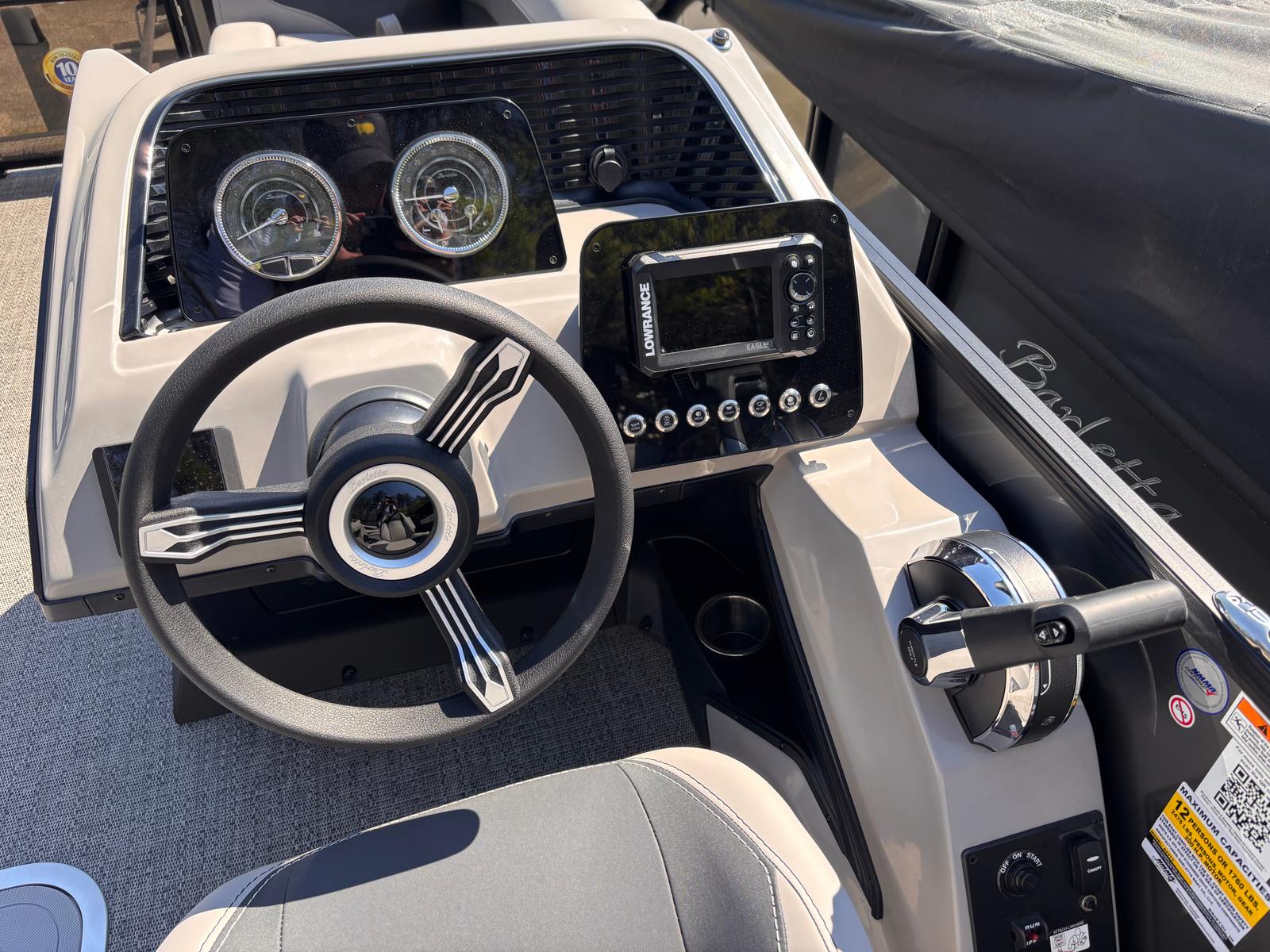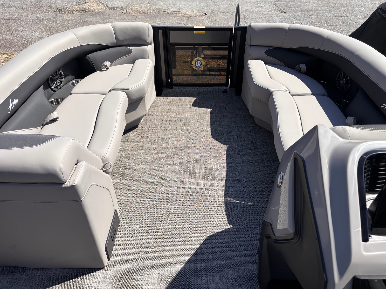 This Barletta pontoon boat is loaded with features that set it apart from the competition. The Railskin Color Aria in Gray Moonstone, accented by Champagne, creates a refined and modern exterior look, while the Blackout Package Aria adds a touch of bold sophistication. The Tempest Gray furniture offers plush, supportive seating, ensuring that every passenger enjoys maximum comfort during long days on the water. The Amore Gray flooring is both stylish and practical, providing a durable and easy-to-clean surface that stands up to the demands of active boating.The exterior of the Aria A22QC-Platinum is further enhanced by a stainless steel flag pole with an American flag, adding a patriotic flair and a touch of elegance to your boating experience. Every detail, from the rigged engine with stainless steel prop to the thoughtfully designed layout, reflects Barletta’s commitment to quality and innovation.