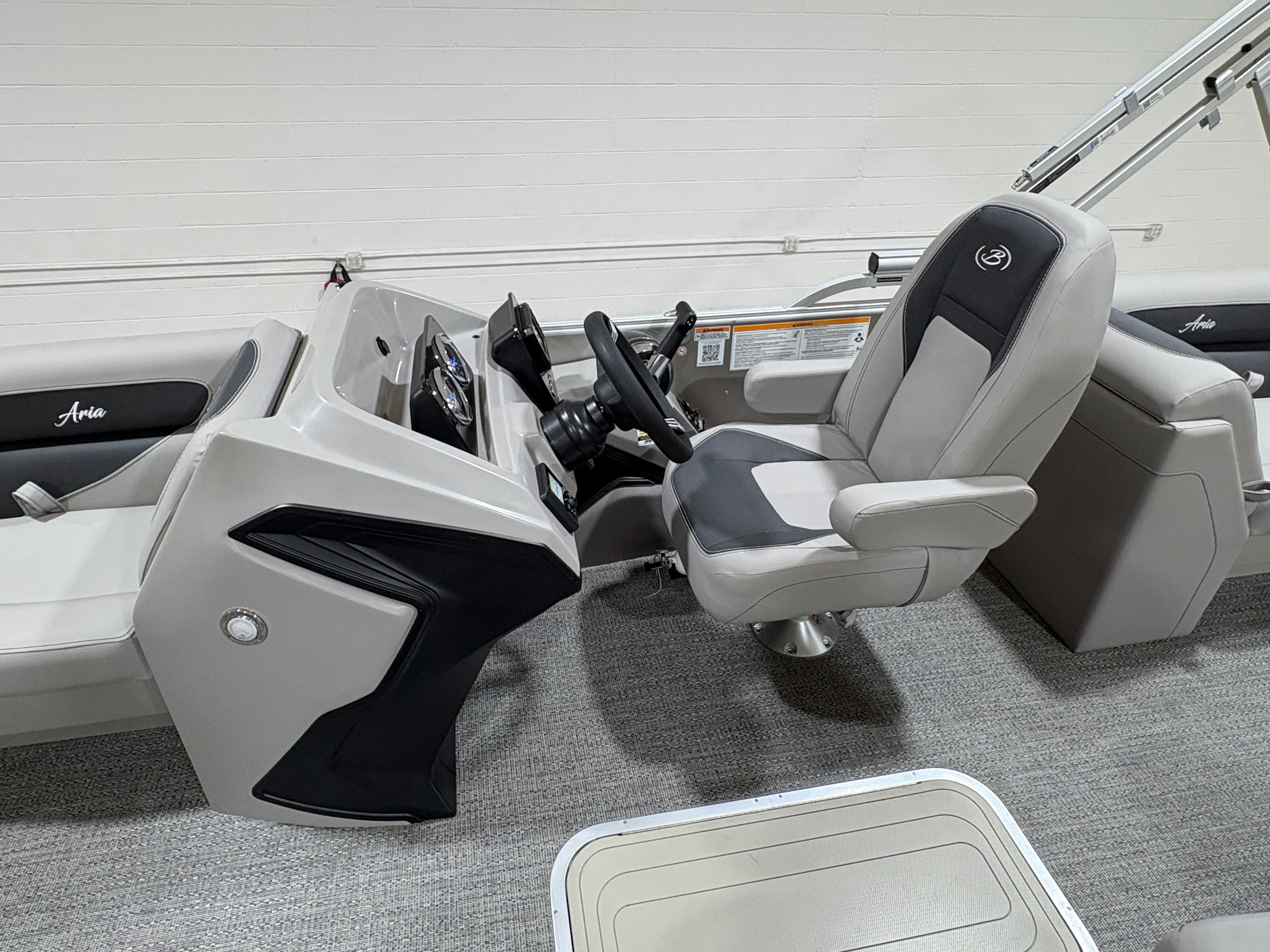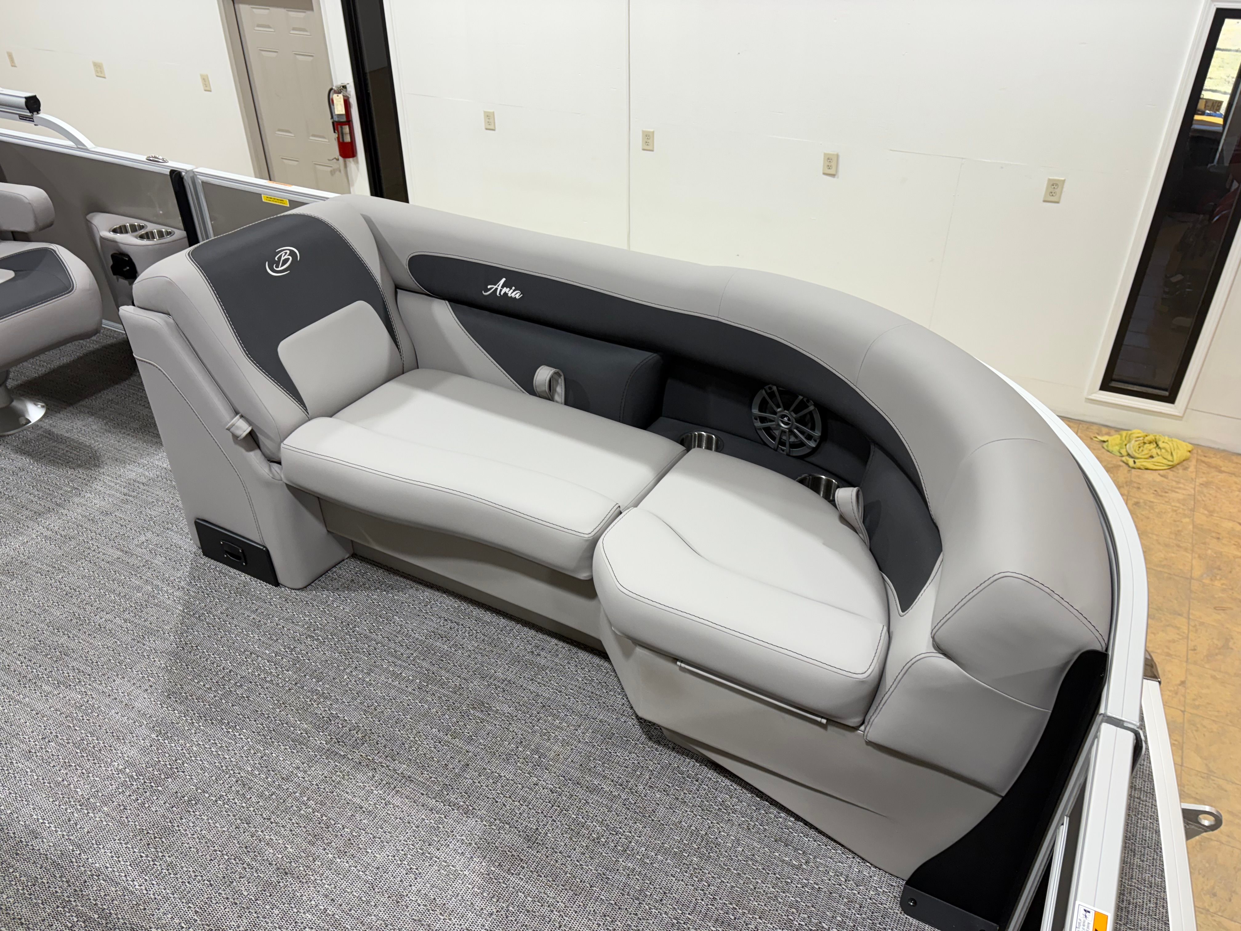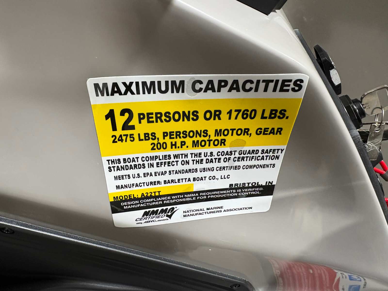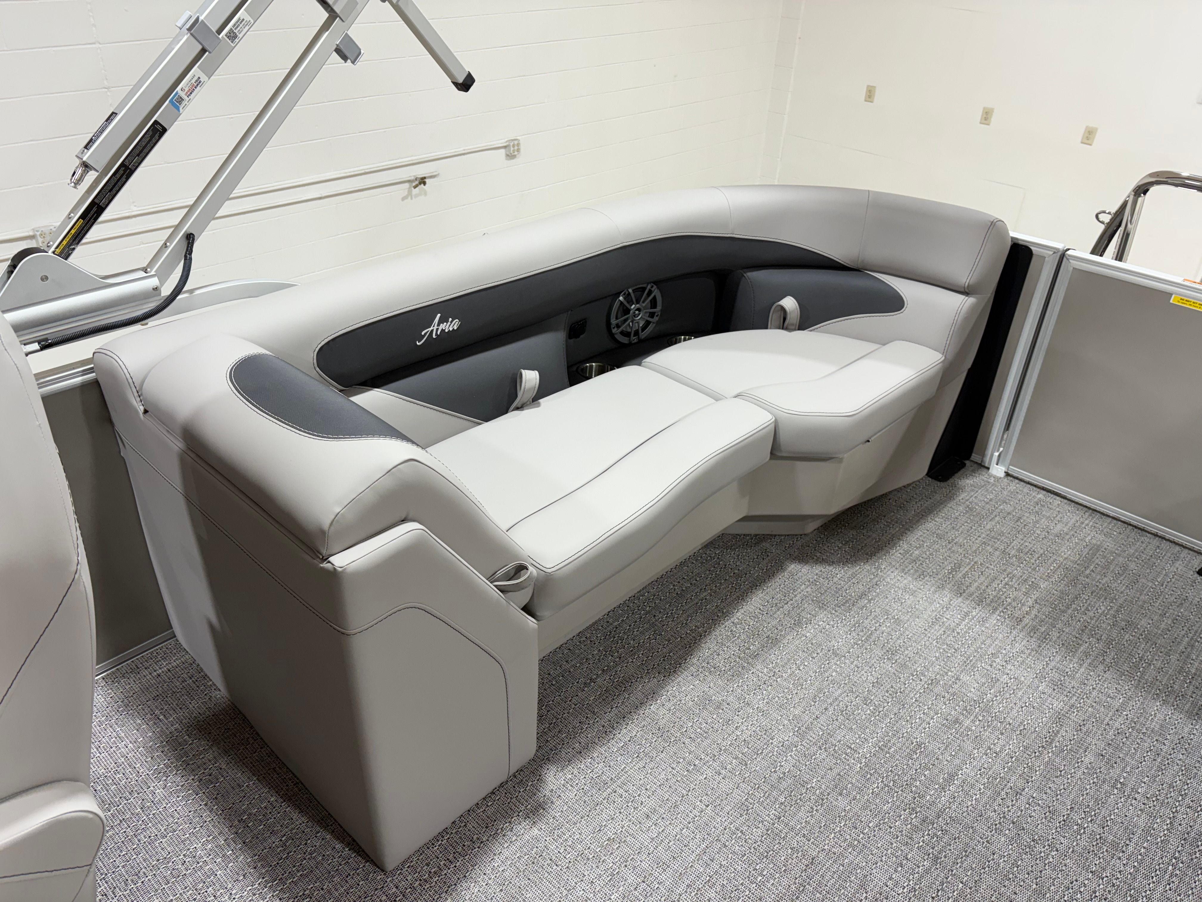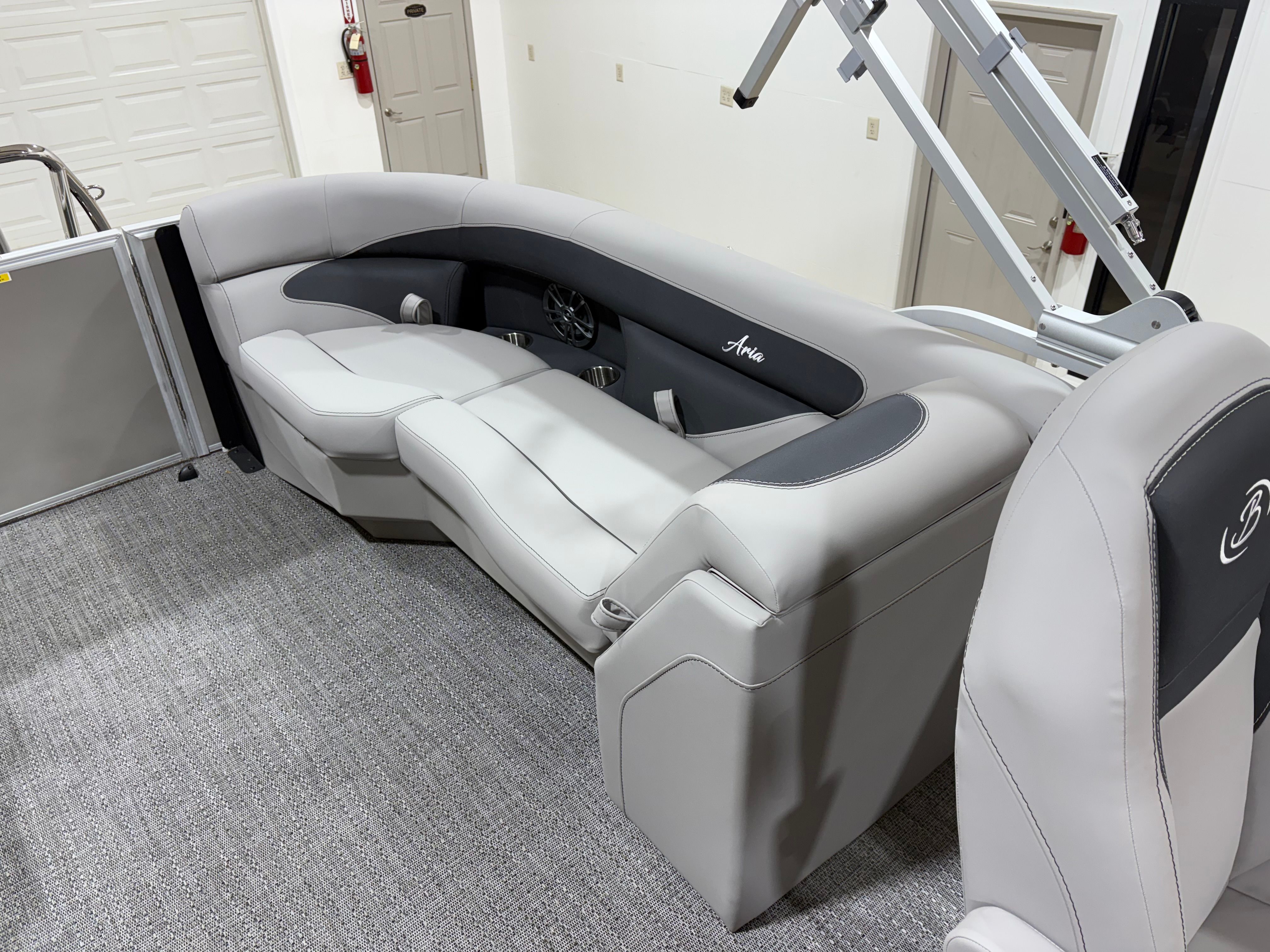 The Barletta Aria A22QC is loaded with special features that enhance both its functionality and aesthetic appeal. The Railskin Color Aria in Champagne, paired with the Gray Moonstone accent, creates a striking exterior that is sure to turn heads. Inside, the Tempest Gray furniture provides a plush and inviting atmosphere, while the Amore Gray flooring adds a touch of elegance and durability underfoot.One of the standout features of this pontoon is the Triple Toon Package Aria, which not only improves performance but also allows for the inclusion of in-floor midship storage. This innovative storage solution is perfect for stowing away gear, water toys, or personal items, keeping the deck clutter-free and organized. The stainless steel flag pole with an American flag adds a patriotic touch to your boating experience, making every outing feel like a celebration.The Barletta Aria A22QC comes pre-rigged for Mercury with mechanical controls, ensuring seamless integration and easy operation. Every detail, from the rigging of the engine with a standard prop to the thoughtful layout of the interior, is designed to maximize your enjoyment and convenience on the water.