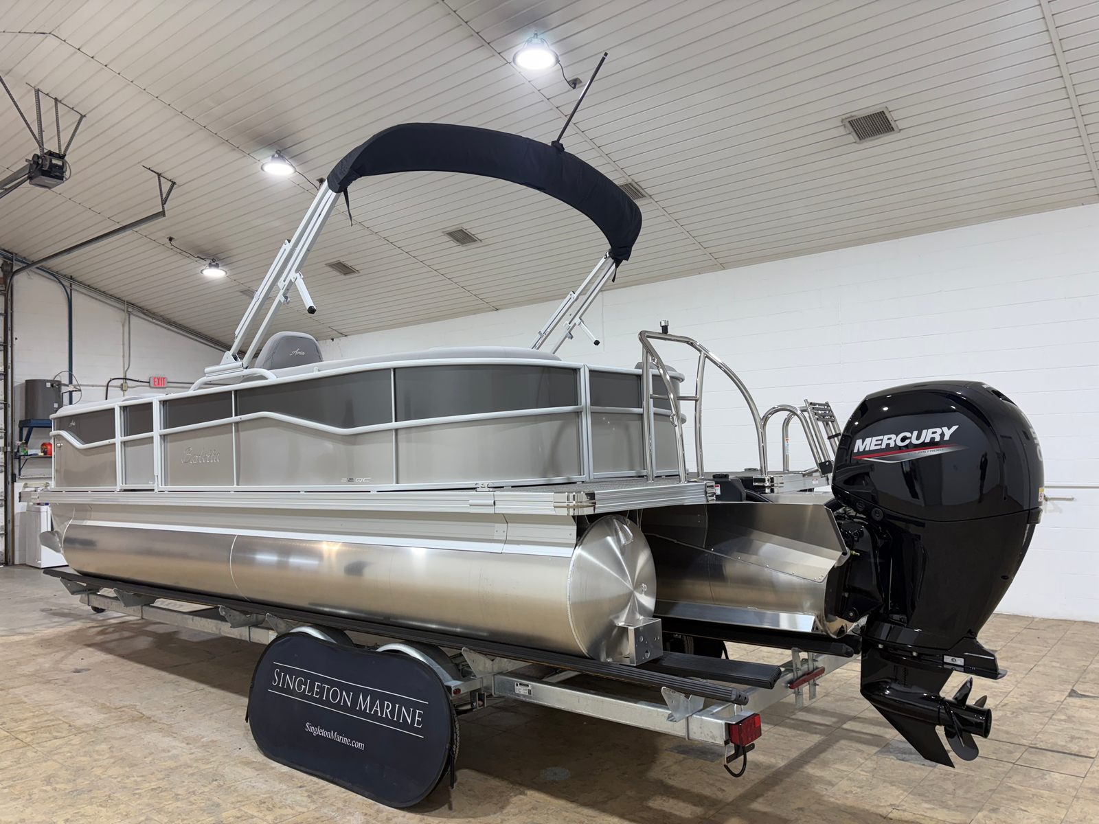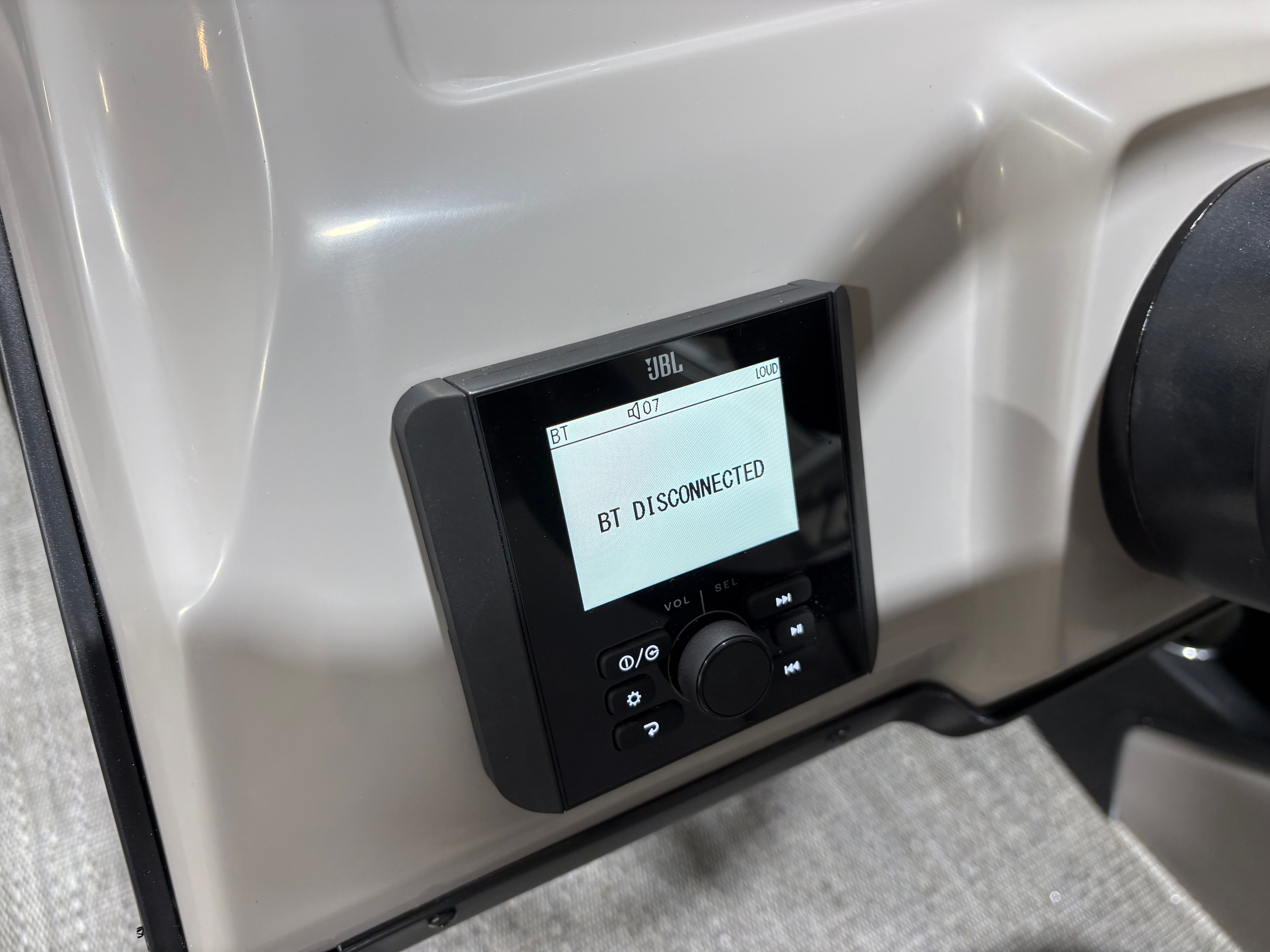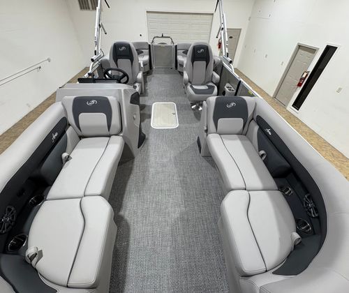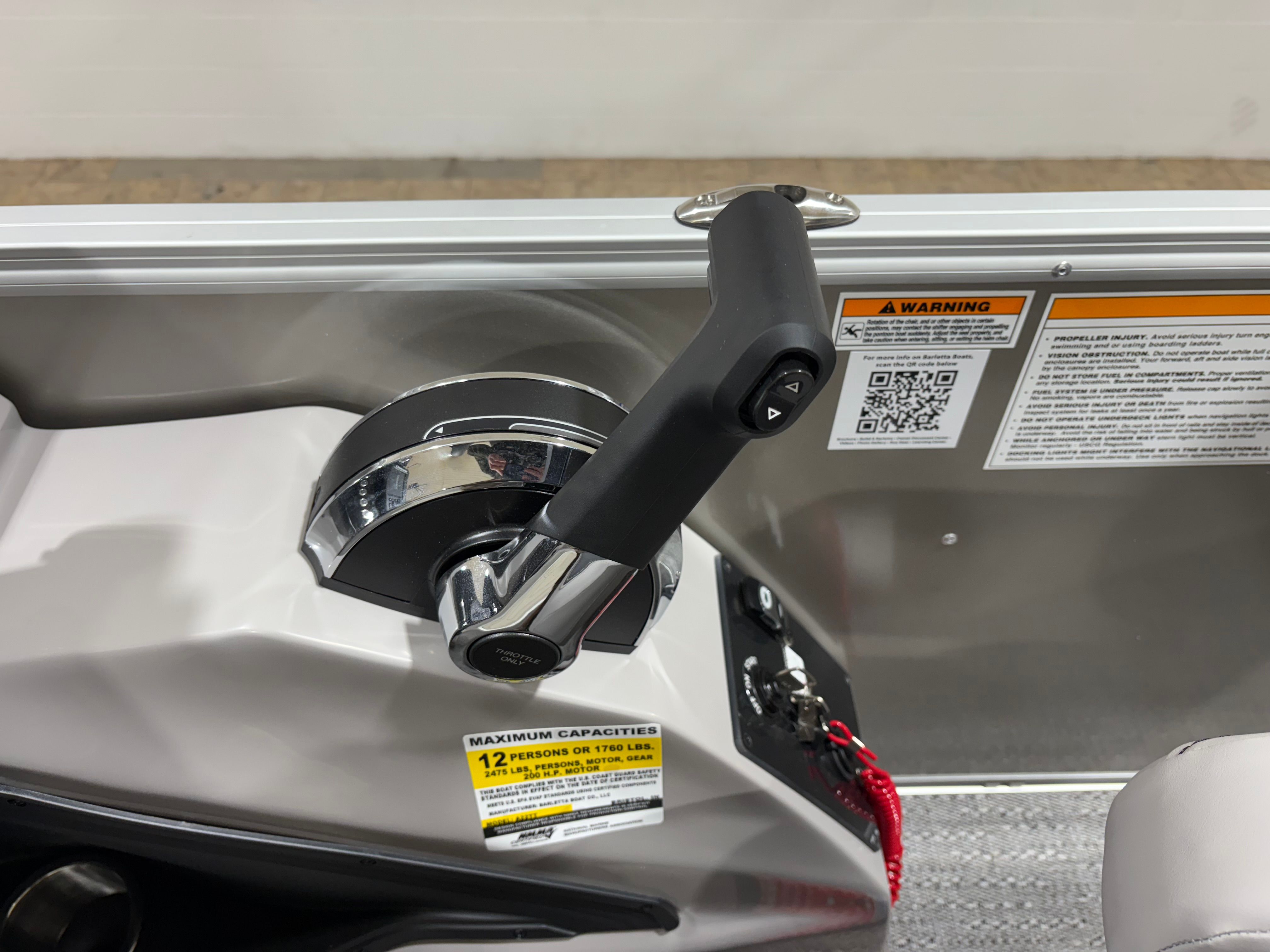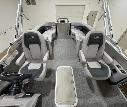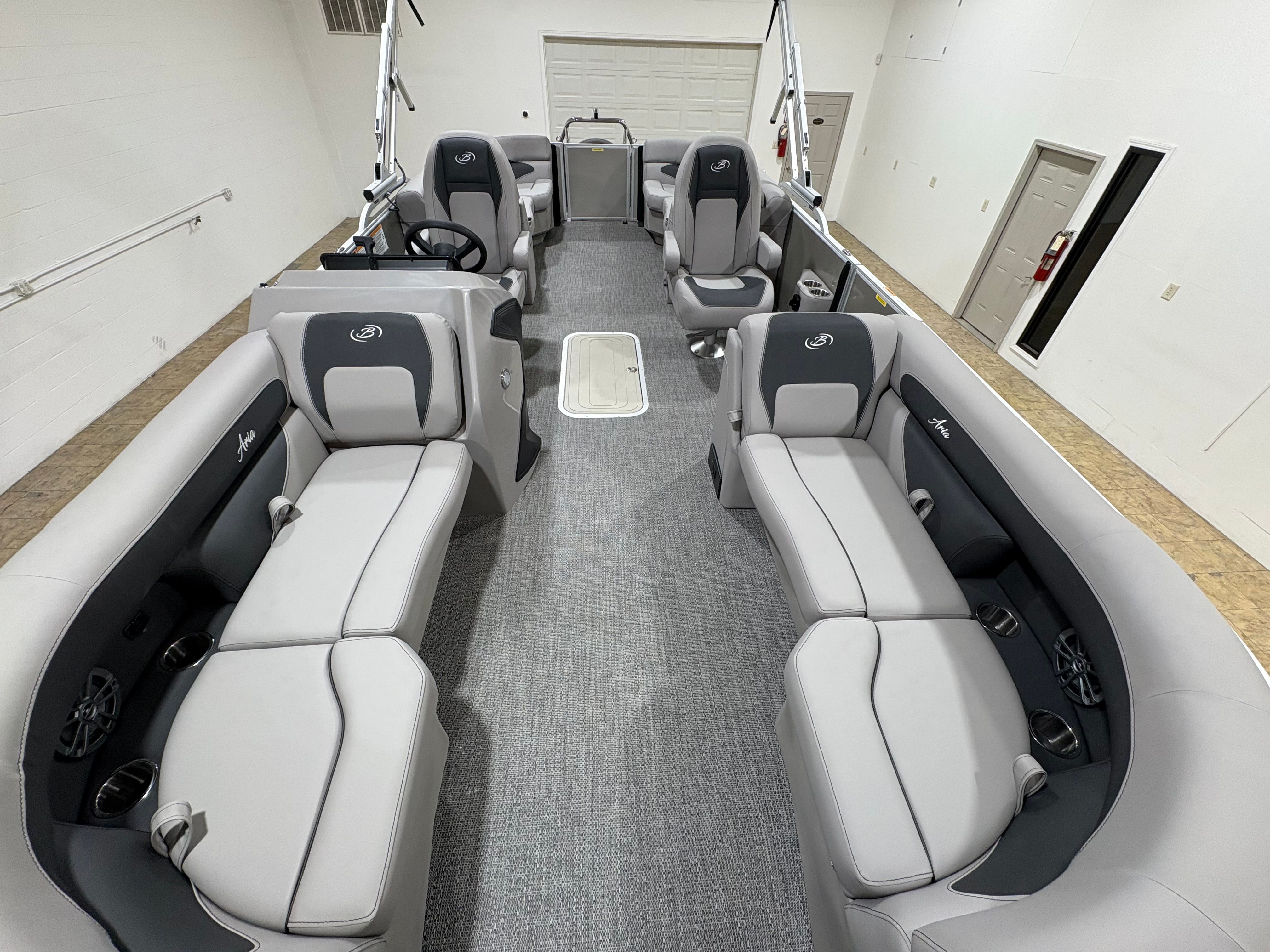 The Barletta Aria A22QC is loaded with special features that enhance both its functionality and aesthetic appeal. The Railskin Color Aria in Champagne, paired with the Gray Moonstone accent, creates a striking exterior that is sure to turn heads. Inside, the Tempest Gray furniture provides a plush and inviting atmosphere, while the Amore Gray flooring adds a touch of elegance and durability underfoot.One of the standout features of this pontoon is the Triple Toon Package Aria, which not only improves performance but also allows for the inclusion of in-floor midship storage. This innovative storage solution is perfect for stowing away gear, water toys, or personal items, keeping the deck clutter-free and organized. The stainless steel flag pole with an American flag adds a patriotic touch to your boating experience, making every outing feel like a celebration.The Barletta Aria A22QC comes pre-rigged for Mercury with mechanical controls, ensuring seamless integration and easy operation. Every detail, from the rigging of the engine with a standard prop to the thoughtful layout of the interior, is designed to maximize your enjoyment and convenience on the water.