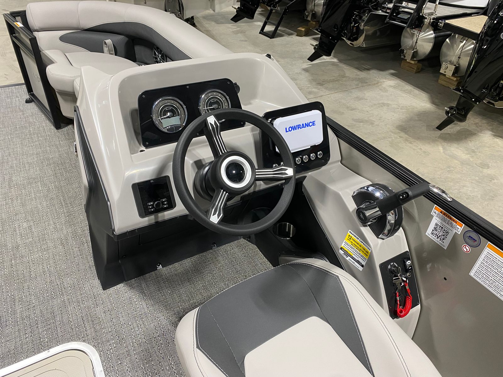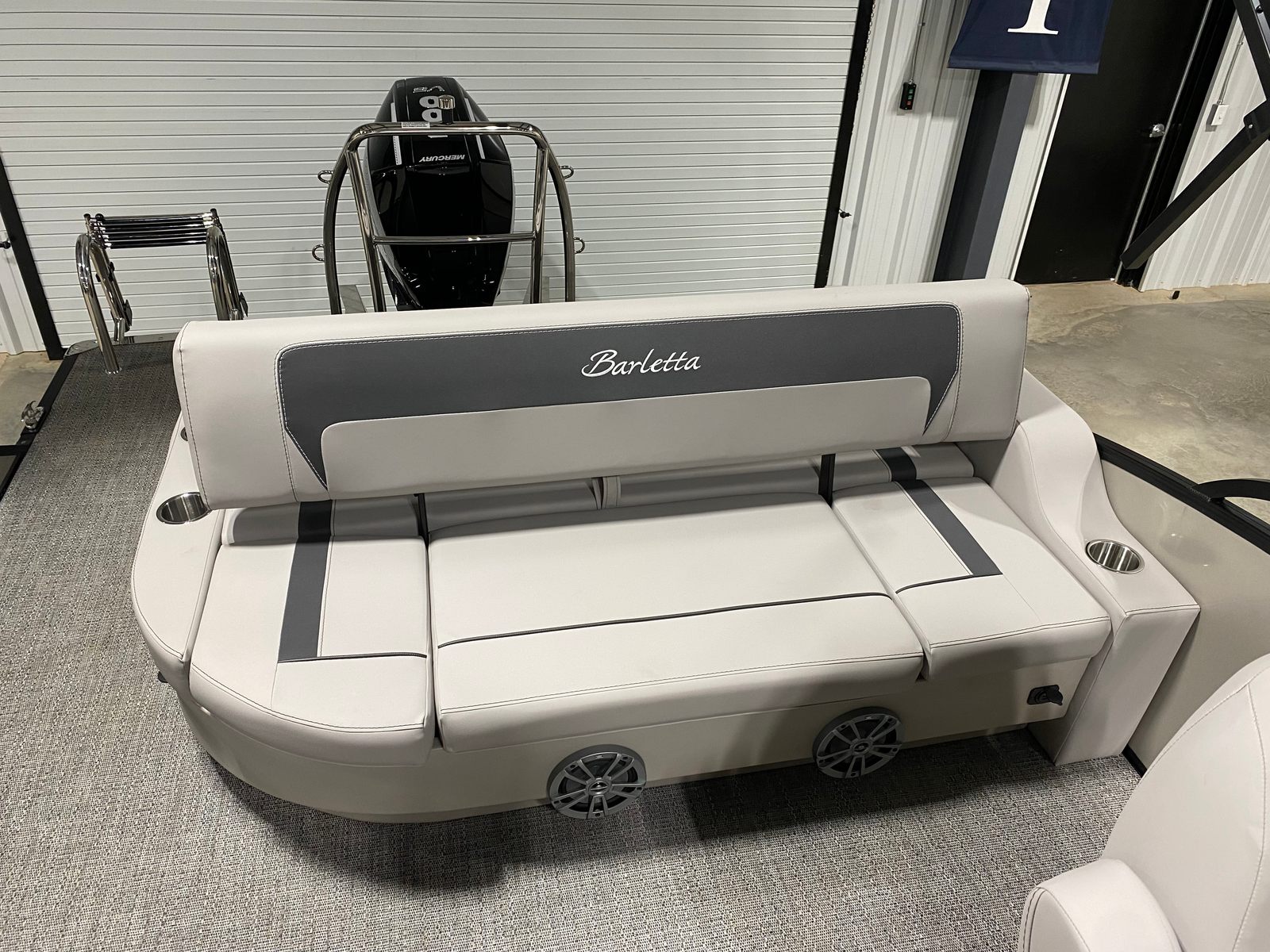 The Barletta Aria A22UC-Platinum is packed with features designed to elevate your time on the water. The Champagne Railskin color and Blackout Package Aria create a striking visual impression, while the Tempest Gray furniture provides plush, comfortable seating for you and your guests. The Amore Gray flooring is not only stylish but also durable and easy to maintain, ensuring your pontoon boat looks great season after season.One of the standout features of this model is the In Floor Midship Storage, offering ample space to stow away gear, water toys, and personal belongings. This thoughtful addition keeps the deck clutter-free and maximizes usable space for relaxation and entertainment. The Eagle 5 GPS system provides advanced navigation capabilities, helping you explore new waters with confidence and ease.The Triple Toon Package Aria enhances the boat’s stability and ride quality, making it perfect for both leisurely cruises and more spirited outings. The Drop Ship Engine - NO PROP configuration allows for customization and ensures you get the exact performance you desire.