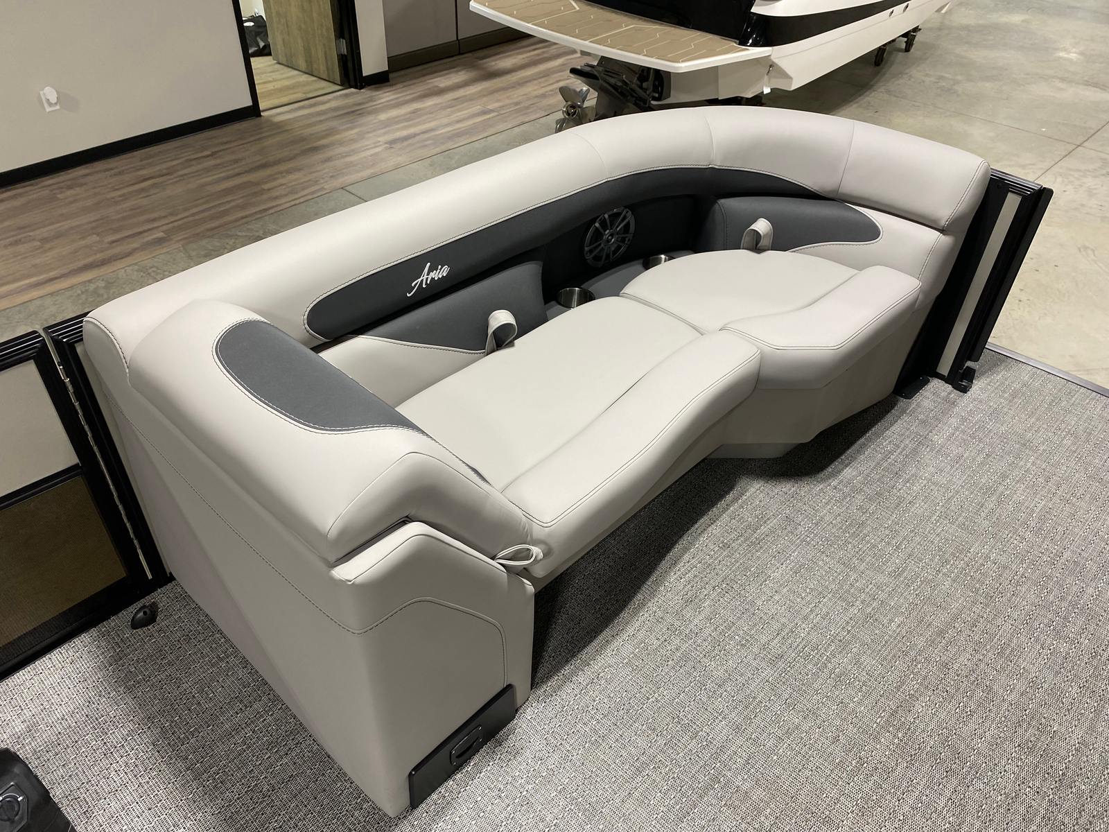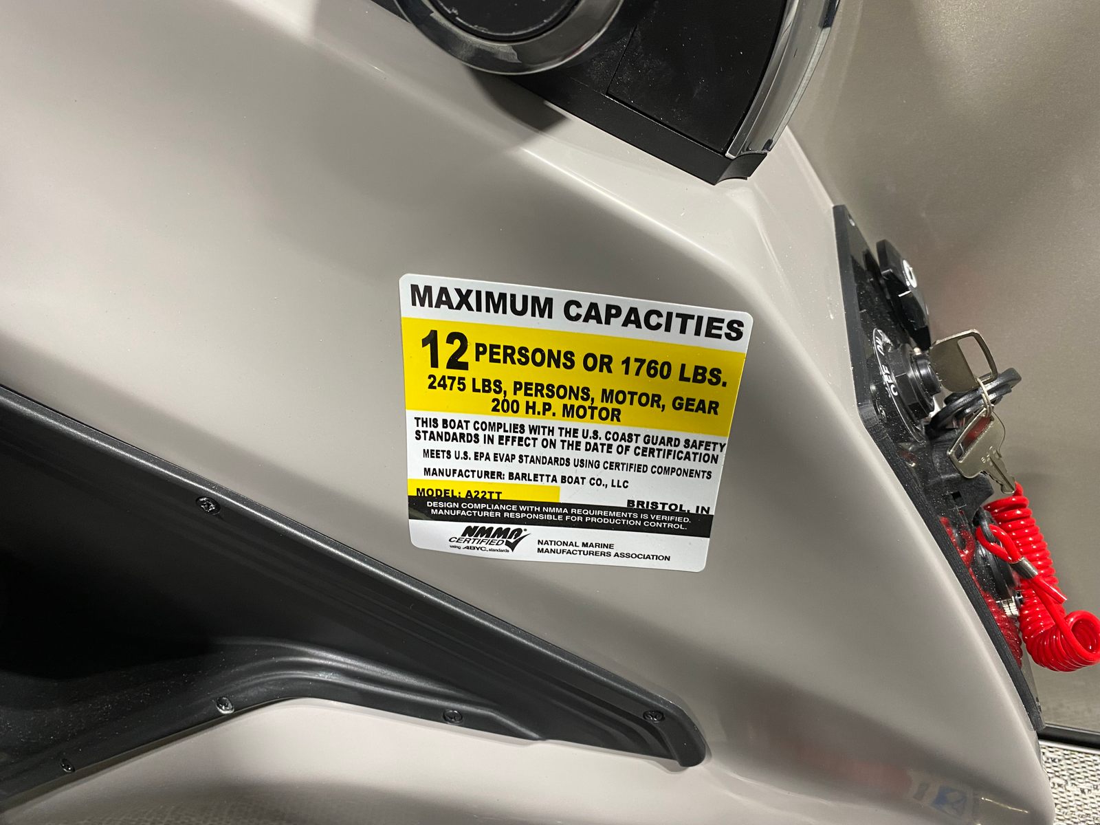 The 2026 Barletta Aria A22UC-Platinum is a brand-new pontoon boat measuring just over 21 feet in length, making it an ideal size for a variety of water activities. With its sleek lines and modern design, this Barletta boat for sale is sure to turn heads at the marina or out on the open water. The combination of the Champagne Railskin color and the Blackout Package Aria gives this pontoon a sophisticated, contemporary look that perfectly complements its luxurious Tempest Gray furniture and Amore Gray flooring. Every detail of the Aria A22UC-Platinum has been thoughtfully crafted to provide a premium boating experience, whether you are cruising with friends or enjoying a peaceful day on the lake.