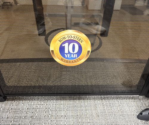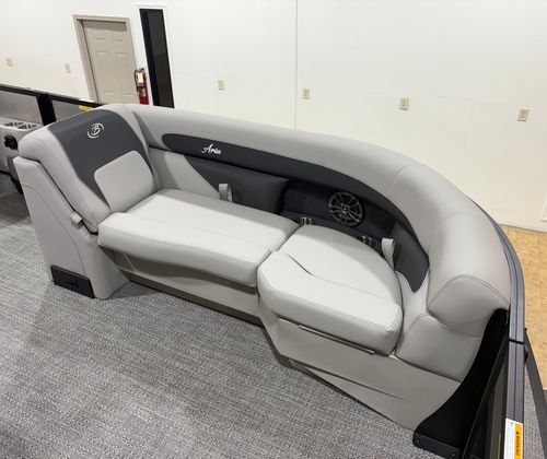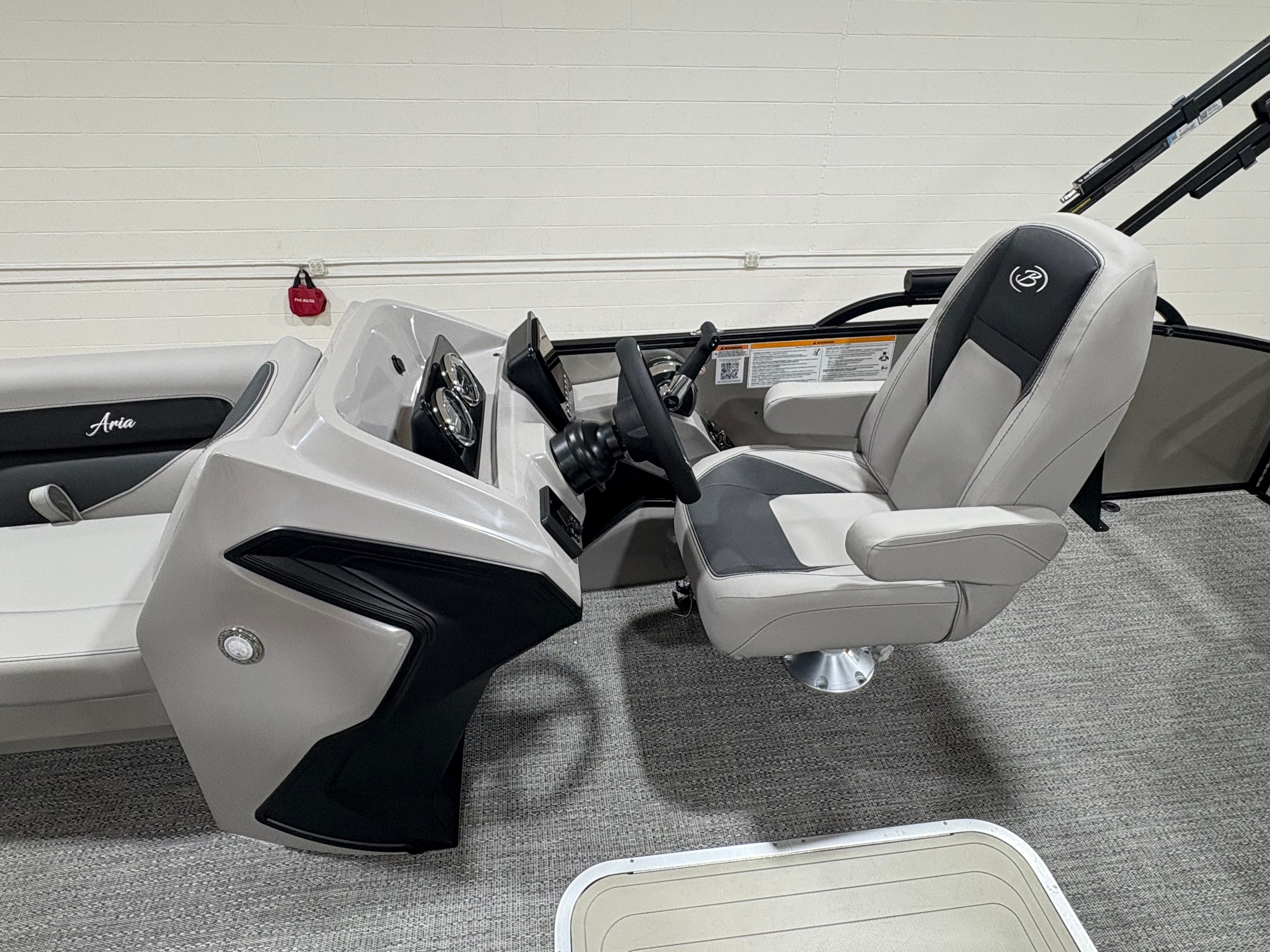 The Barletta Aria A22UC-Platinum is packed with special features that set it apart from other pontoon boats for sale. The Railskin Color Aria in Champagne and the Blackout Package Aria create a striking exterior, complemented by the stainless steel flag pole with an American flag for a touch of patriotic flair. Inside, the Tempest Gray furniture and Amore Gray flooring provide both comfort and style, while the triple toon package enhances stability and ride quality. The in-floor midship storage (available with the triple toon package) offers convenient space for stowing gear, keeping the deck clutter-free and organized. The rigging includes a stainless steel prop for superior performance and longevity, ensuring that every outing is smooth and enjoyable.