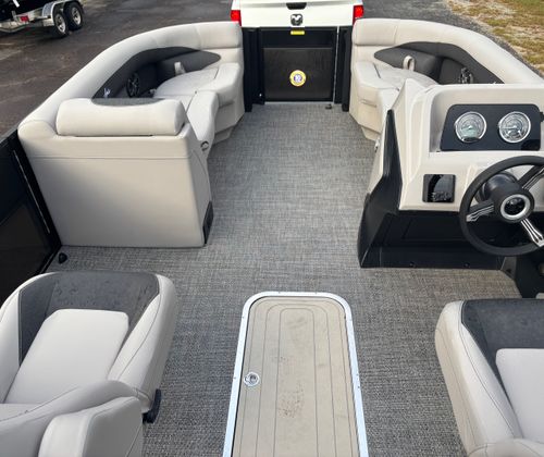 Step aboard the Barletta Aria A22UC-Platinum and discover a host of premium features designed to elevate your boating experience. The Tempest Gray furniture offers both comfort and sophistication, creating an inviting atmosphere for relaxing or socializing. The Blackout Package Aria railskin adds a bold, modern touch to the exterior, while the Black Diamond railskin color further enhances the boat’s sleek appearance. Stainless steel accents, including the flag pole with an American flag, provide a touch of elegance and pride.Inside, you’ll find Amore Gray flooring that’s both stylish and practical, offering durability and easy maintenance. The in-floor midship storage (available with the Triple Toon configuration) provides ample space for stowing gear, water toys, or picnic supplies, keeping the deck clutter-free and organized. At the helm, the Simrad 7" G07 XSE display puts navigation and system controls at your fingertips, making it easy to monitor your route, engine performance, and more.