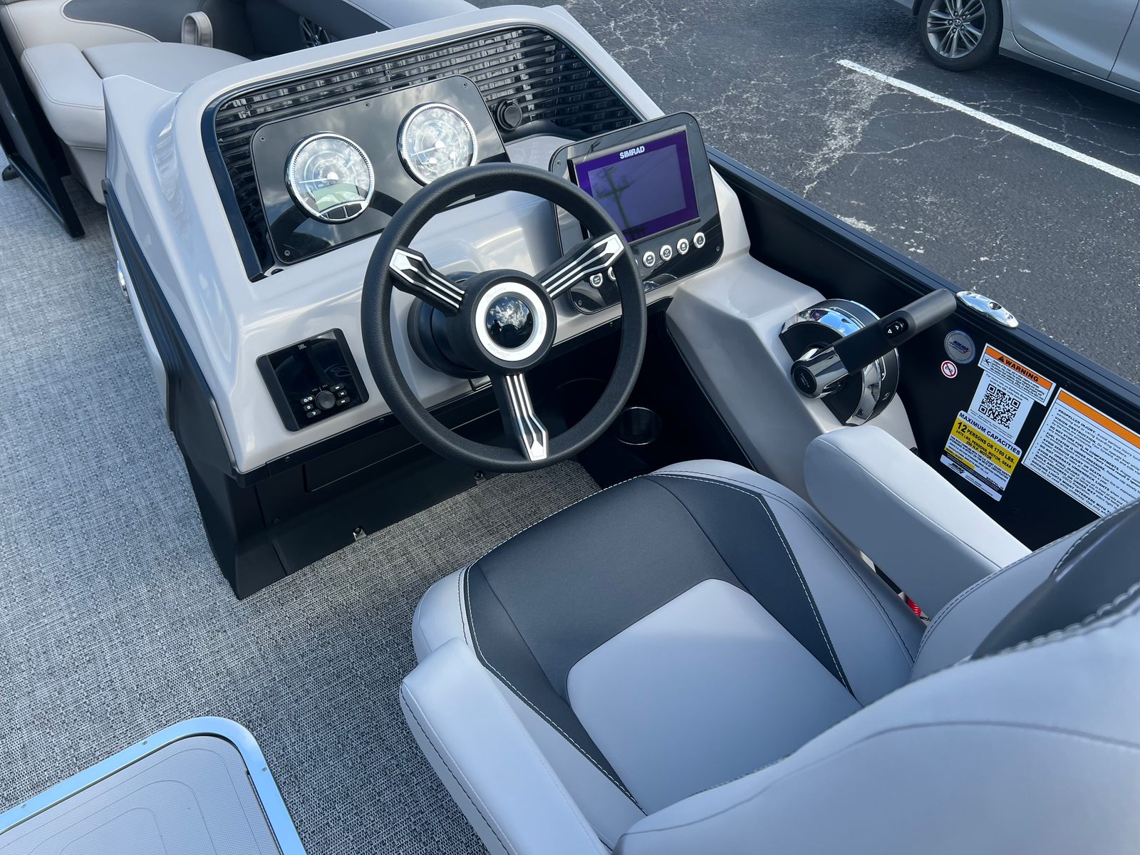 The Barletta Aria A22UC-Platinum is packed with special features that elevate your boating experience. The Railskin Color Aria in Matte Black, complemented by the Railskin Accent Aria in Winter White, creates a striking visual contrast that’s both modern and timeless. The Blackout Package Aria adds an extra touch of sophistication, ensuring your pontoon stands out from the crowd.Inside, the furniture is finished in Tempest Gray, offering plush seating and ample space for relaxation. The Amore Gray flooring is not only stylish but also practical, providing a comfortable and easy-to-clean surface. The Triple Toon Package Aria enhances stability and performance, making this pontoon boat ideal for a variety of water activities.A stainless steel flag pole with an American flag adds a patriotic flair, perfect for celebrating special occasions or simply showing your pride. Every detail is thoughtfully designed to maximize comfort, convenience, and enjoyment.