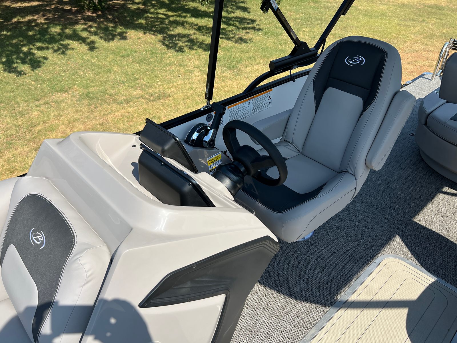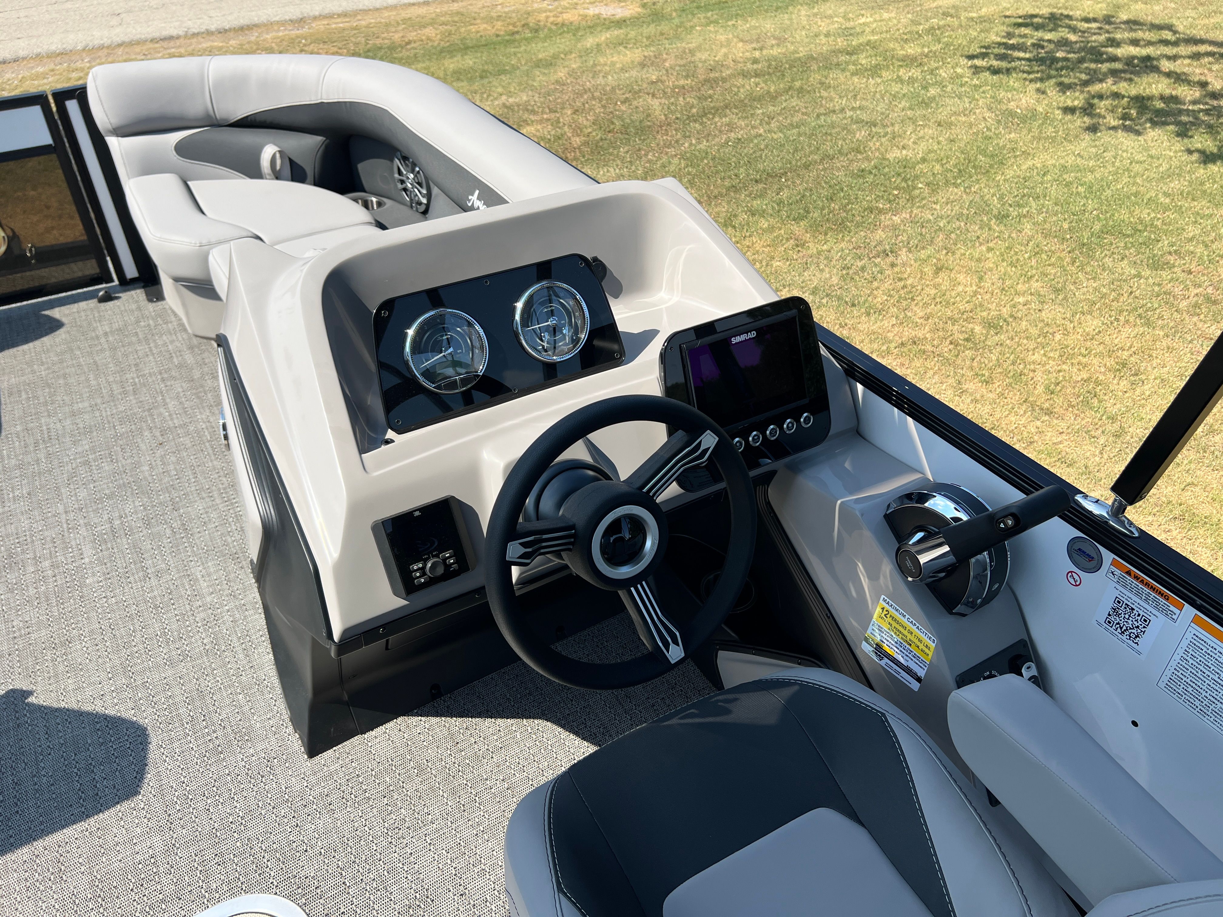 The Barletta Aria A22UC-Platinum is packed with features that set it apart from other pontoon boats for sale. The Railskin Color Aria in Winter White, combined with the Blackout Package Aria, creates a striking and sophisticated exterior that turns heads at every marina. Inside, the Tempest Gray furniture offers plush seating and a modern look, while the Amore Gray flooring adds a touch of elegance and is easy to maintain.The Triple Toon Package Aria provides enhanced stability and buoyancy, making this pontoon ideal for larger groups and ensuring a smooth ride even in choppier waters. The in-floor midship storage offers ample space for all your gear, keeping the deck clutter-free and organized. A stainless steel flag pole with an American flag adds a patriotic touch and a sense of pride to every outing.
