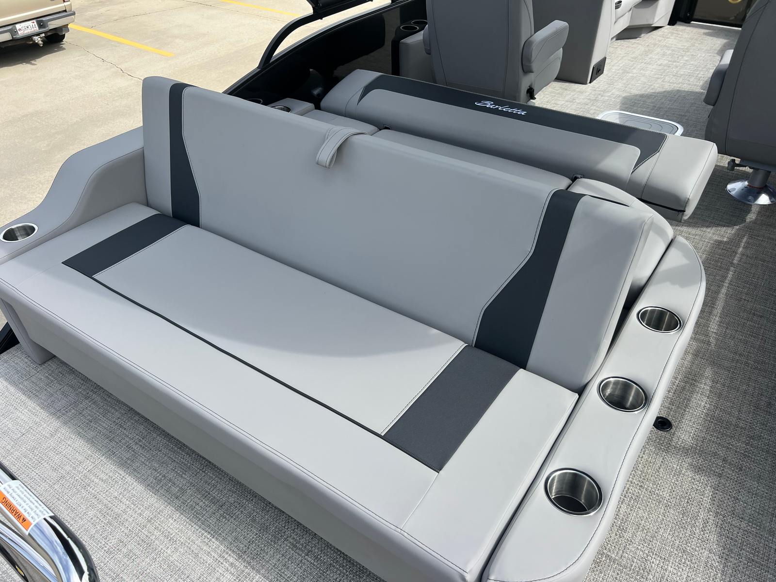 The 2026 Barletta Aria A22UC-Platinum is loaded with features designed to elevate your time on the water. The Aria Blackout Package adds a touch of elegance and exclusivity, while the Black Diamond Railskin color provides a bold, contemporary aesthetic. Inside, the Tempest Gray furniture offers plush seating for you and your guests, complemented by Alpine Gray flooring that is both stylish and easy to maintain. The in-floor midship storage compartment provides a convenient place to stow gear, water toys, or picnic supplies, keeping the deck clutter-free and organized. The clipped playpen cover with poles offers protection from the elements, ensuring your pontoon stays in pristine condition when not in use. Every detail, from the rigged engine with stainless steel prop to the Mercury mechanical pre-rig with power assist, is designed to enhance your boating experience.