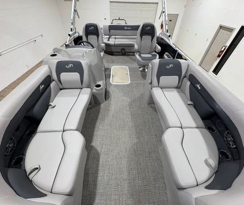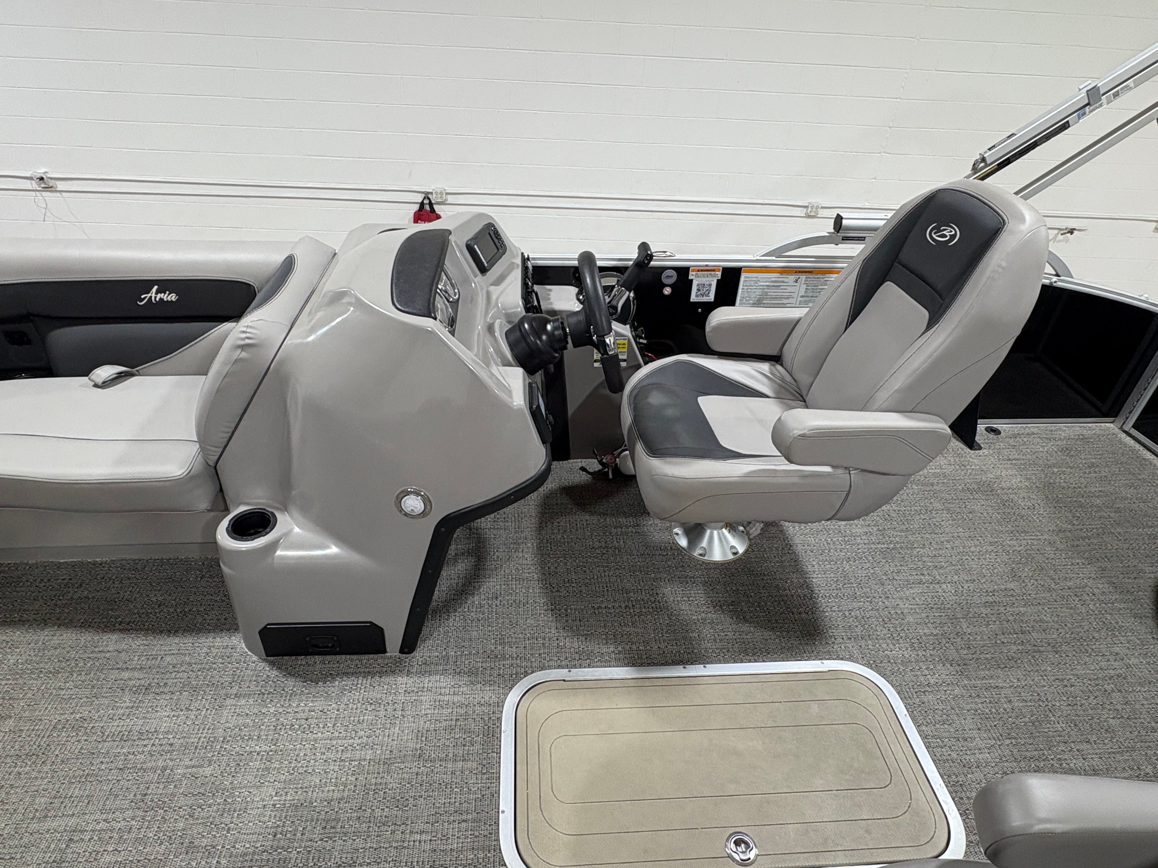 The Barletta A22UC is loaded with features designed to enhance your boating experience. The flooring is finished in elegant Amore Gray, providing a modern and easy-to-clean surface that complements the overall aesthetic. The furniture is upholstered in Tempest Gray, offering both comfort and style for all passengers. One of the standout features is the in-floor midship storage, which provides convenient space for stowing gear, water toys, and personal items, keeping the deck clutter-free and organized.The boat’s exterior is highlighted by the Railskin Color Aria in Black Diamond, giving it a sophisticated and eye-catching appearance. The Triple Toon Package Aria adds to the boat’s stability and performance, ensuring a smooth ride even in choppier waters. With the rig engine and standard prop, you can expect reliable propulsion and easy maneuverability, making docking and navigating tight spaces a breeze.