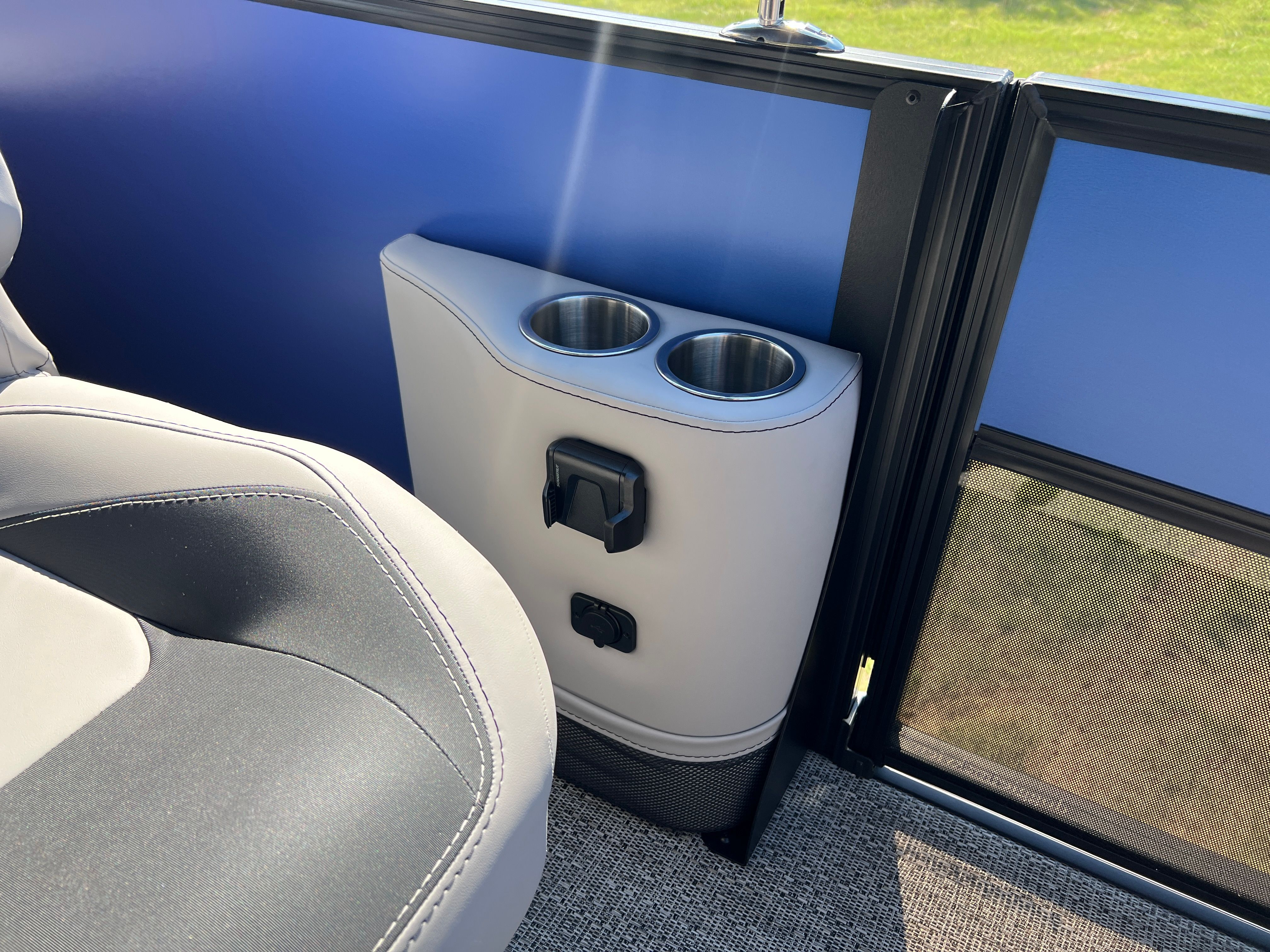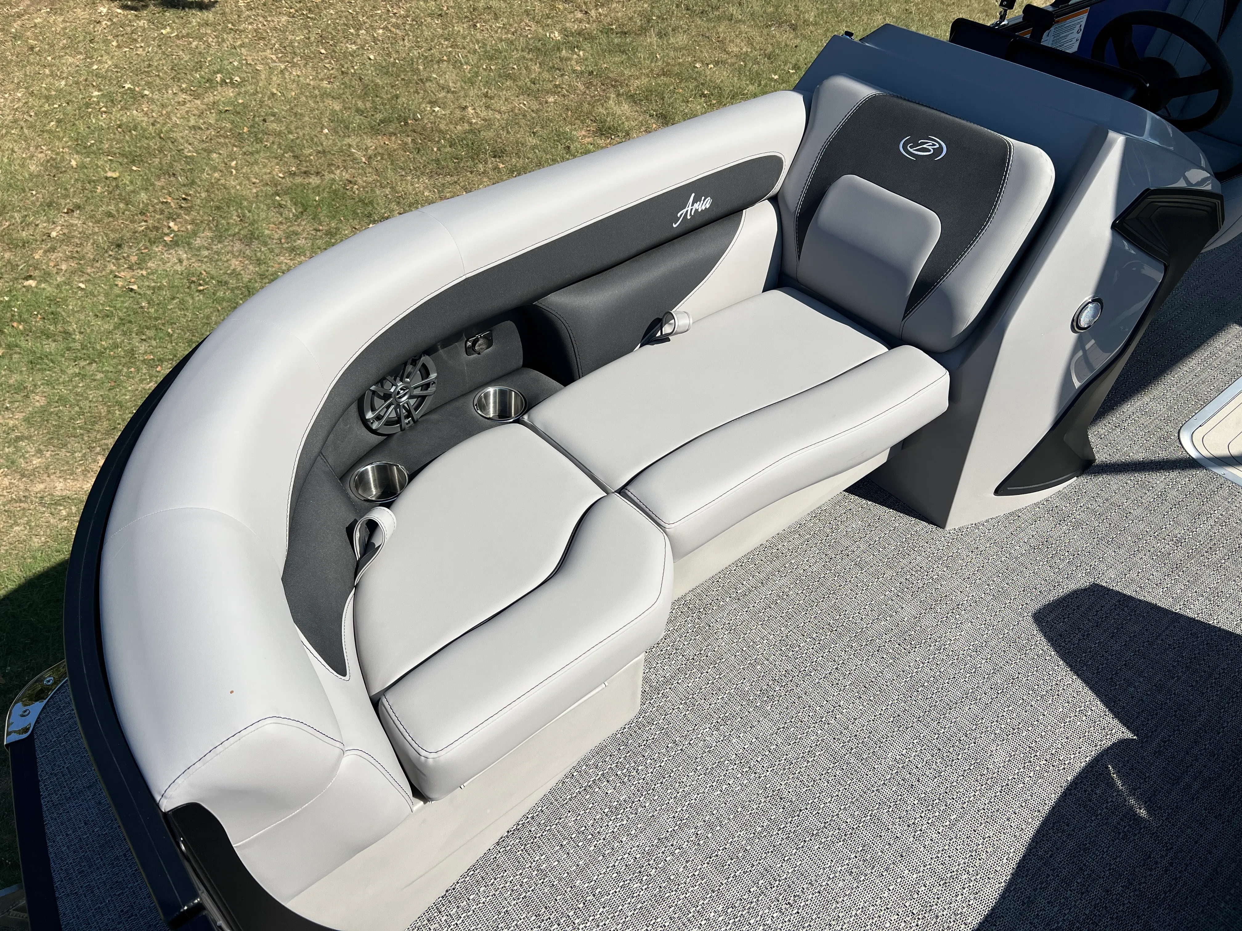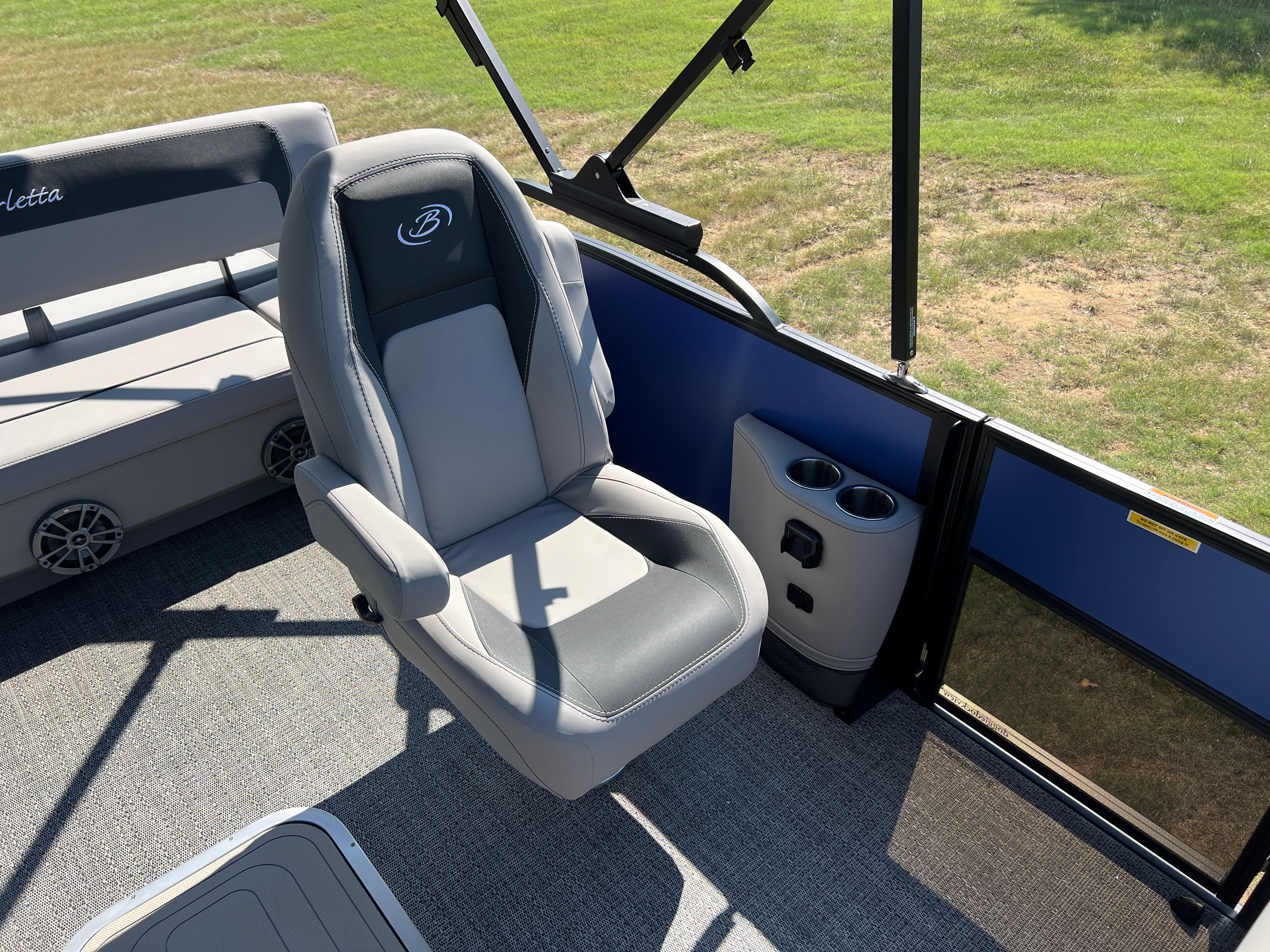 The Barletta Aria A22UC is packed with features designed to elevate your boating experience. The Pacific Matte Blue Railskin, complemented by Black Diamond accents and the Blackout Package Aria, creates a striking visual impression. Inside, the Tempest Gray furniture offers a plush, inviting atmosphere, while the Amore Gray flooring is both stylish and easy to maintain. The Triple Toon Package Aria enhances buoyancy and stability, making this pontoon perfect for larger groups or those who want extra peace of mind on the water. The Mercury 150L Four Stroke engine, paired with a stainless steel prop, ensures reliable performance and longevity. A stainless steel flag pole with an American flag adds a patriotic touch, making this boat a true standout.