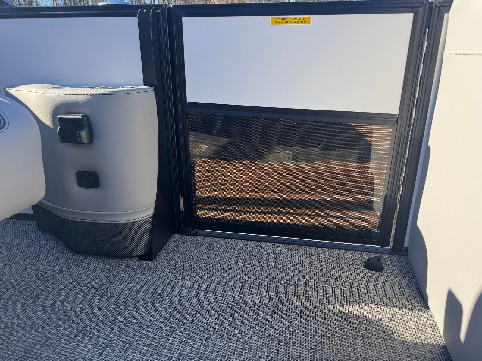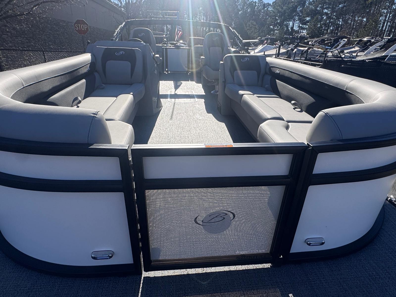 The Barletta Aria A24QC pontoon boat for sale is packed with premium features designed to maximize your enjoyment and convenience. The Blackout Package Aria adds a bold and modern touch to the exterior, while the Winter White Railskin provides a clean and timeless appeal. Inside, the Tempest Gray furniture offers plush seating and ergonomic design, perfect for relaxing or socializing with guests. The Amore Gray flooring is both stylish and practical, providing a comfortable surface that’s easy to maintain.One of the standout features is the in-floor midship storage, offering ample space to stow your gear, water toys, and essentials without cluttering the deck. The stainless steel flag pole with an American flag adds a patriotic flair and a touch of elegance to the boat’s exterior. The Triple Toon Package Aria not only boosts performance but also increases passenger capacity and stability, making it ideal for larger groups and active days on the water.