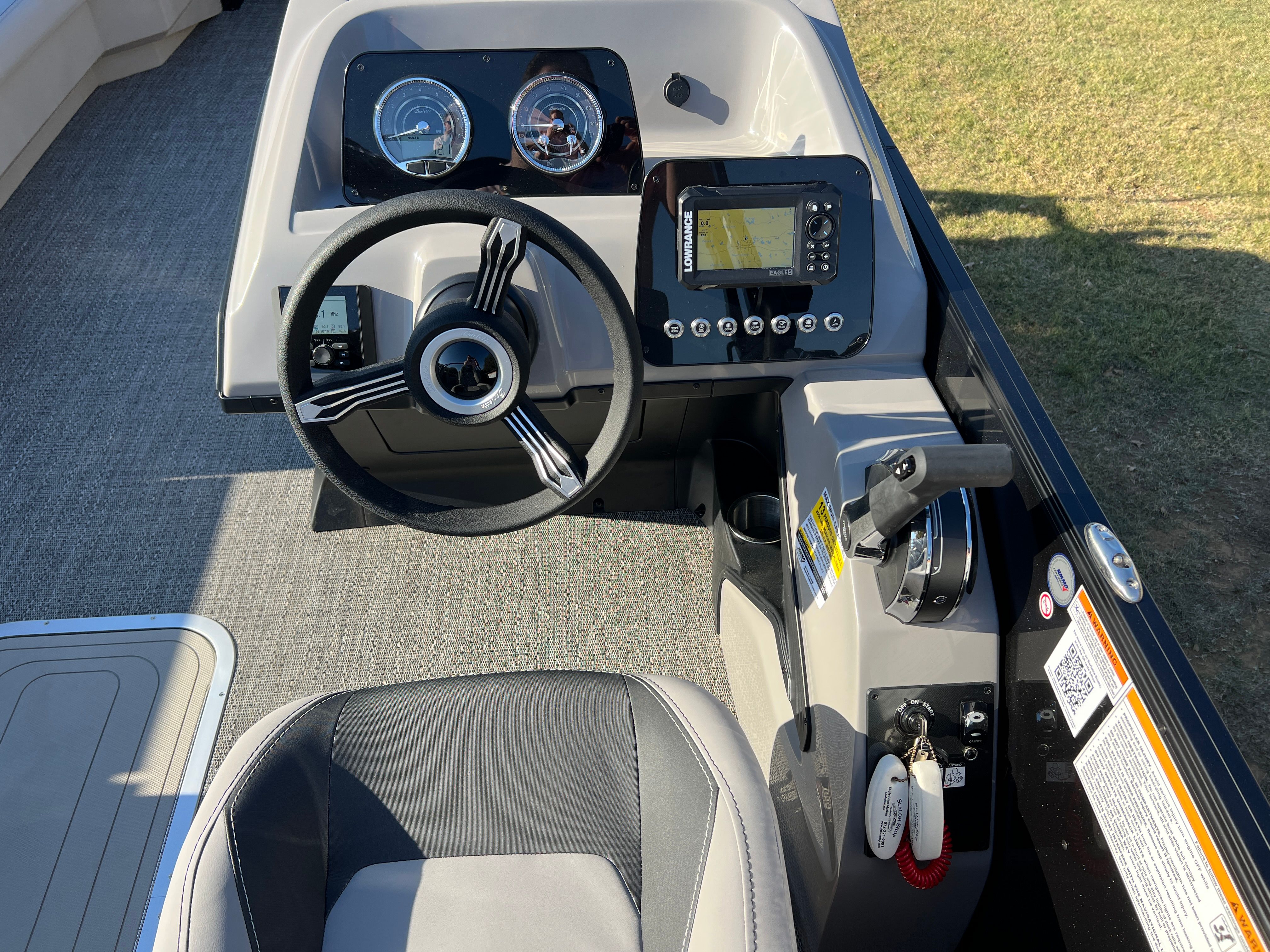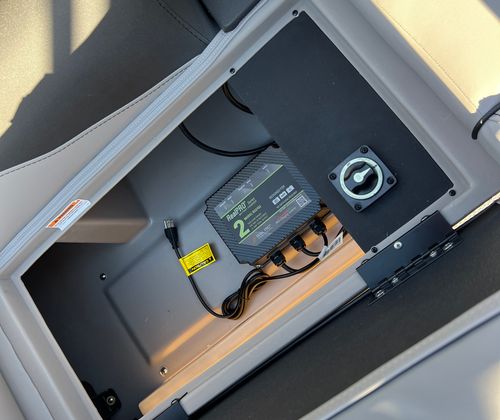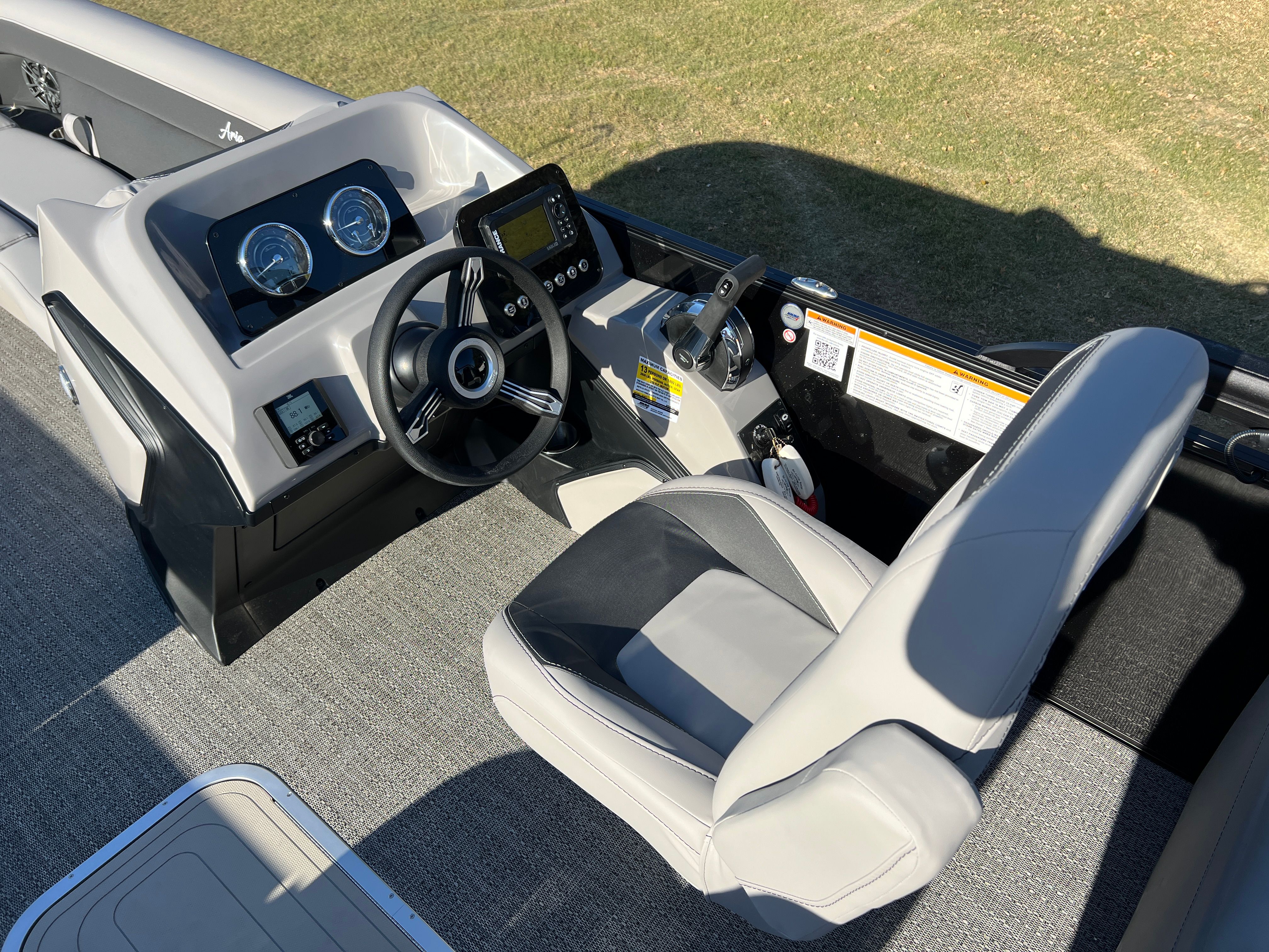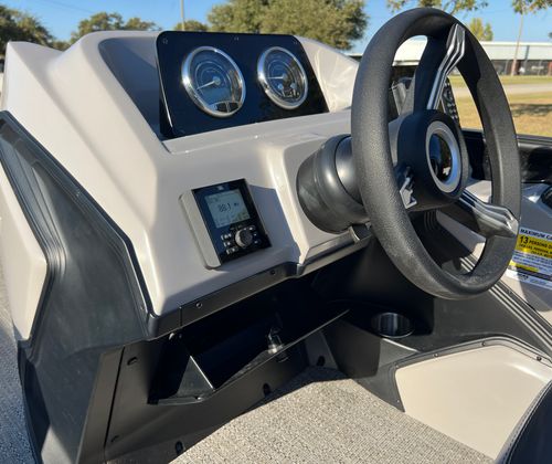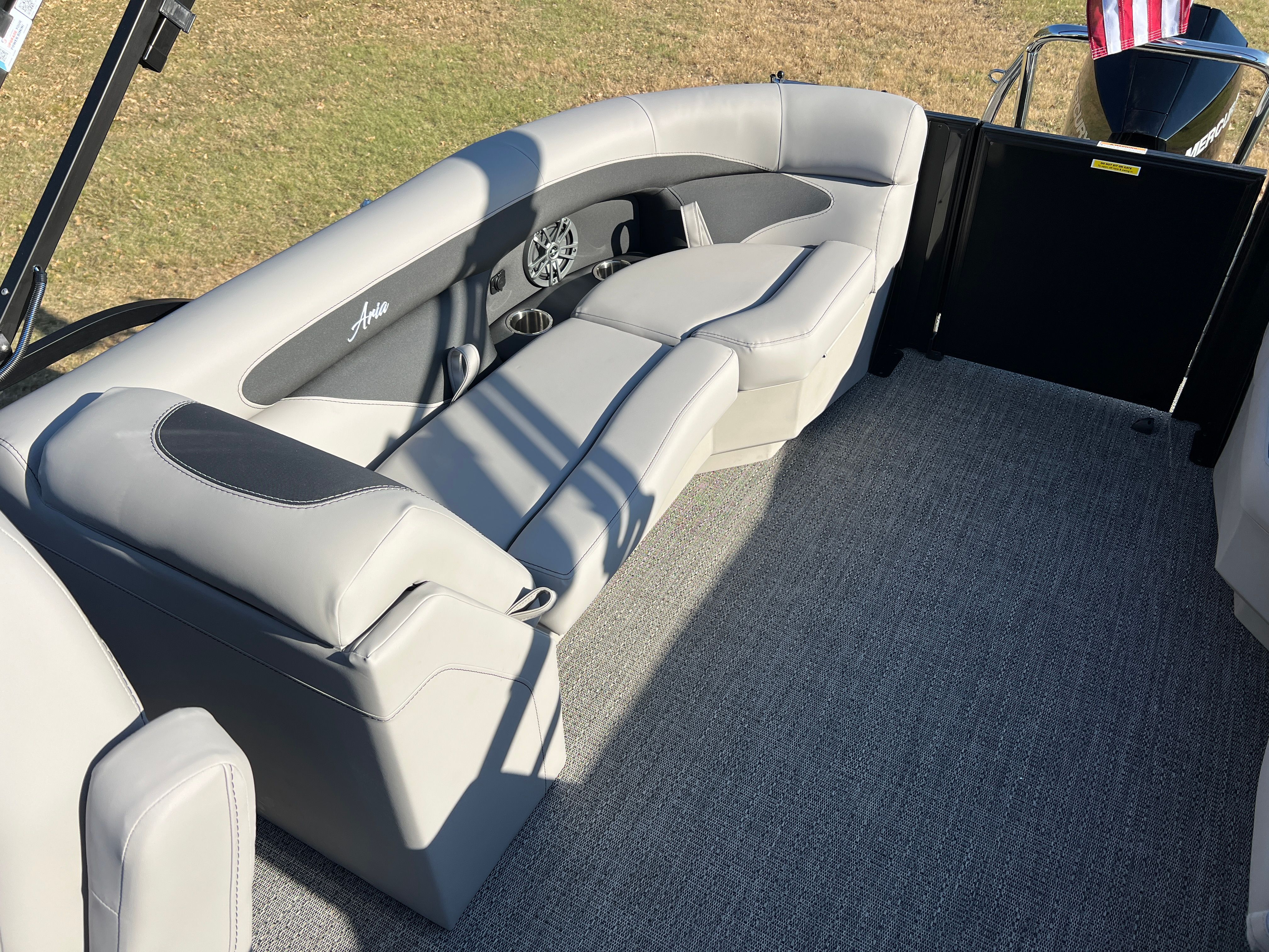 The Barletta Aria A24QC is loaded with premium features that set it apart from other pontoon boats for sale. The Railskin Color Aria in Black Diamond, combined with the Blackout Package Aria, gives the boat a bold and contemporary look. The furniture is finished in Tempest Gray, offering both comfort and elegance, while the Amore Gray flooring adds a touch of sophistication and is easy to maintain. The in-floor midship storage provides ample space for all your gear, keeping the deck clutter-free and organized. A stainless steel flag pole with an American flag adds a patriotic flair, making your boat stand out on the water.