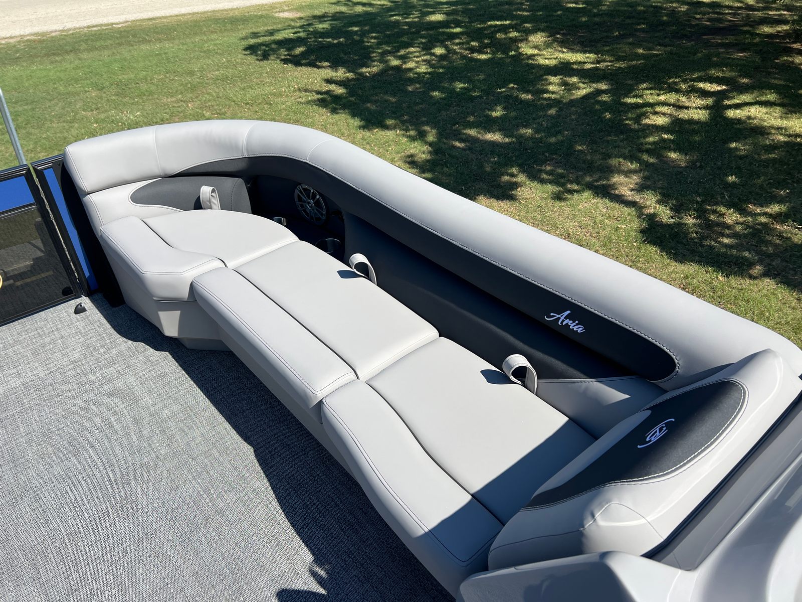 The Barletta Aria A24UC is a 2026 model, measuring just over 23 feet in length. This spacious pontoon boat offers ample room for family, friends, and all your favorite activities. Its sleek profile and modern lines are accentuated by the Pacific Matte Blue Railskin color, complemented by the Black Diamond accent and the striking Blackout Package Aria. The combination of Tempest Gray furniture and Amore Gray flooring creates a sophisticated and inviting atmosphere, making every outing feel like a luxury escape. Whether you’re cruising, entertaining, or simply relaxing, this Barletta boat for sale delivers a premium experience from bow to stern.