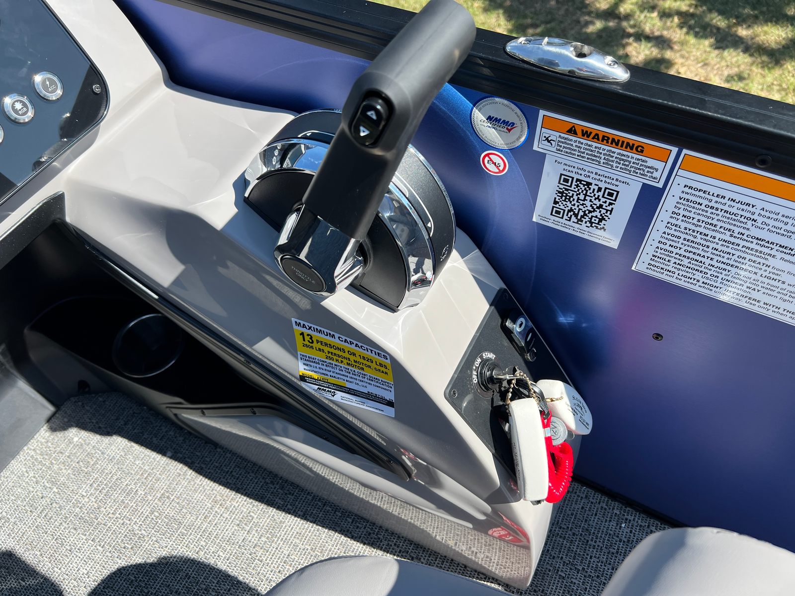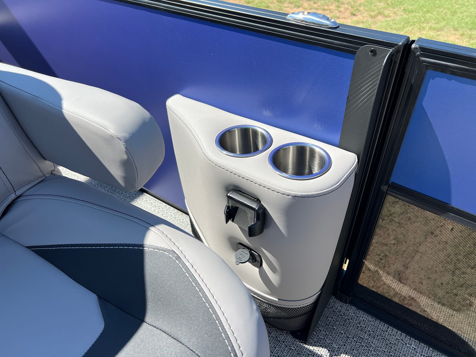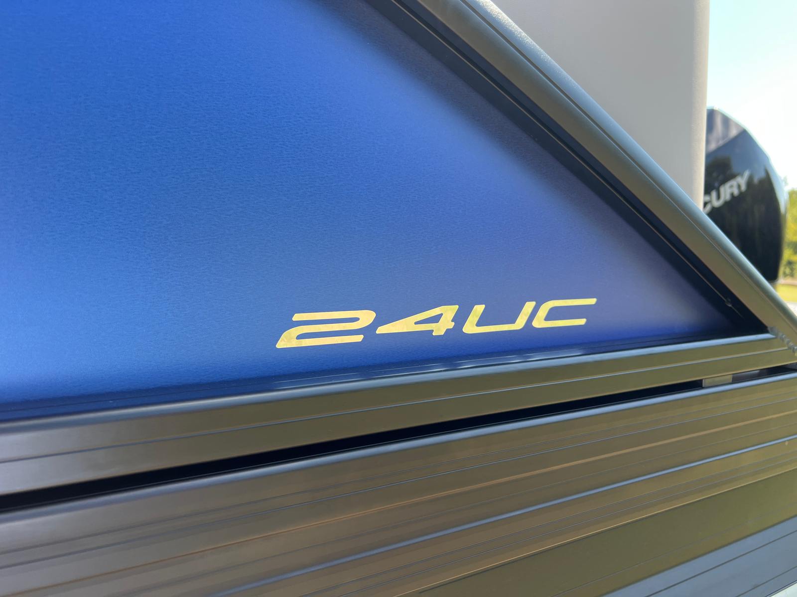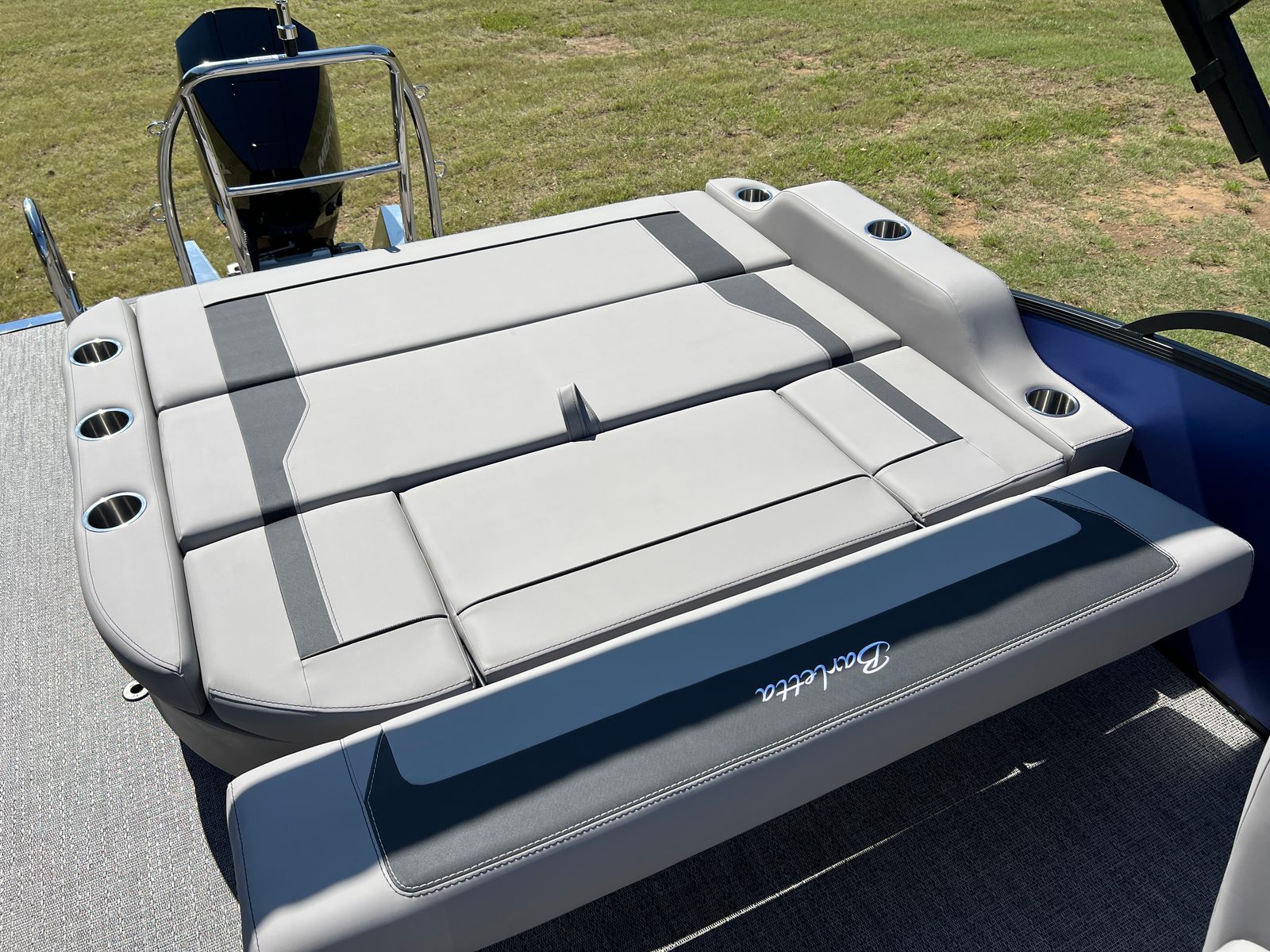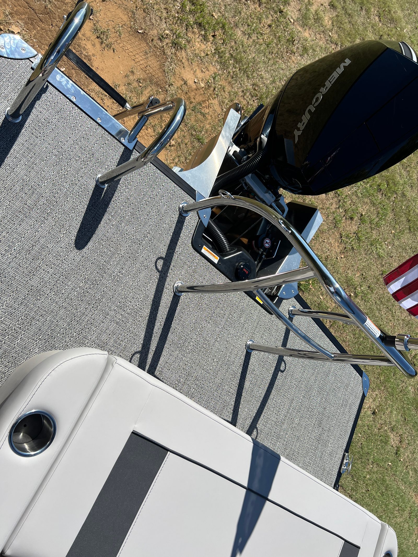 The Barletta Aria A24UC is packed with special features designed to elevate your boating experience. The Pacific Matte Blue Railskin color and Black Diamond accent give the exterior a bold, contemporary look, while the Blackout Package Aria adds a touch of sophistication. Inside, the Tempest Gray furniture provides plush seating and ample lounging space, perfectly complemented by the Amore Gray flooring for a cohesive and stylish interior. The Triple Toon Package Aria ensures enhanced stability and performance, making every ride smooth and enjoyable. The Mercury 200L FourStroke engine is pre-rigged with mechanical power assist, and the rigging includes a stainless steel prop for optimal efficiency. Adding a patriotic touch, the stainless steel flag pole with an American flag is a standout feature that celebrates your love for boating and the open water.