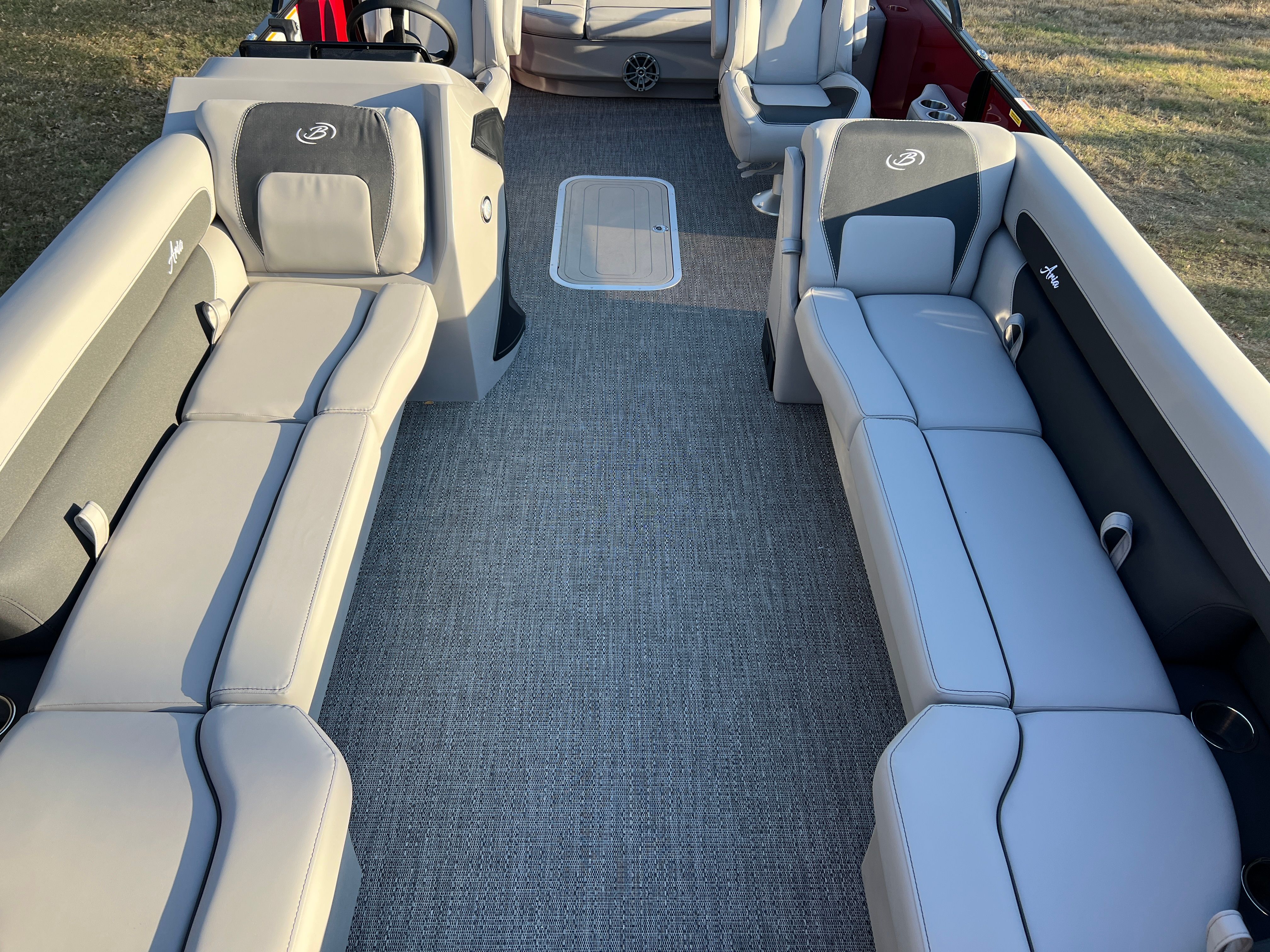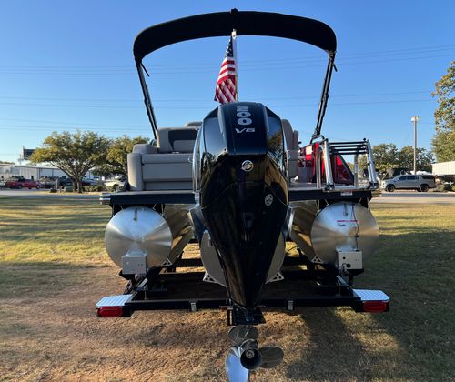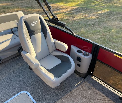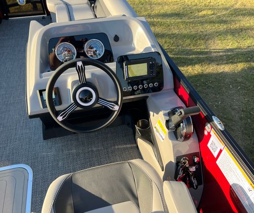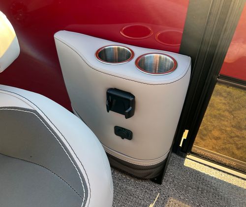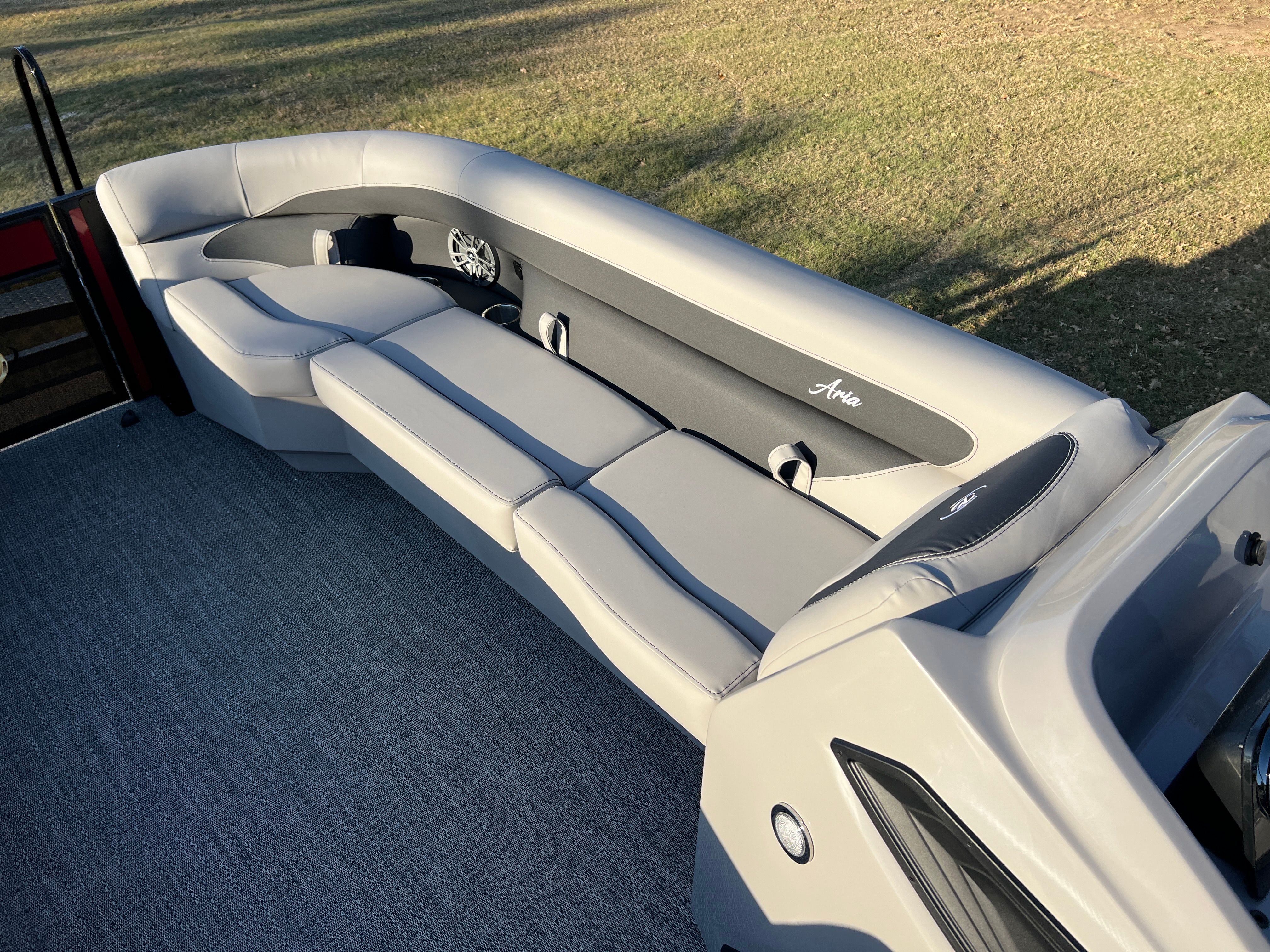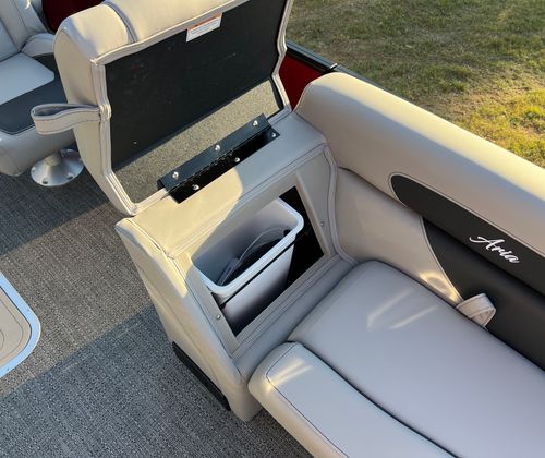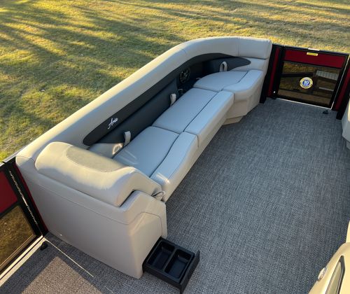 Step aboard the Aria A24UC and discover a world of premium features designed for comfort and convenience. The Tempest Gray furniture offers plush seating and a modern aesthetic, while the Amore Gray flooring provides a stylish and durable foundation for all your on-board activities. The in-floor midship storage is perfect for stowing away gear, water toys, or picnic essentials, keeping the deck clutter-free and organized. The stainless steel flag pole with an American flag adds a patriotic touch, making this pontoon boat a standout wherever you go.The Railskin Color Aria in Red Garnet, paired with the Black Diamond accent and Blackout Package Aria, creates a bold and sophisticated look that is sure to impress. Every detail, from the premium upholstery to the thoughtful storage solutions, is designed to enhance your boating experience and provide lasting value.