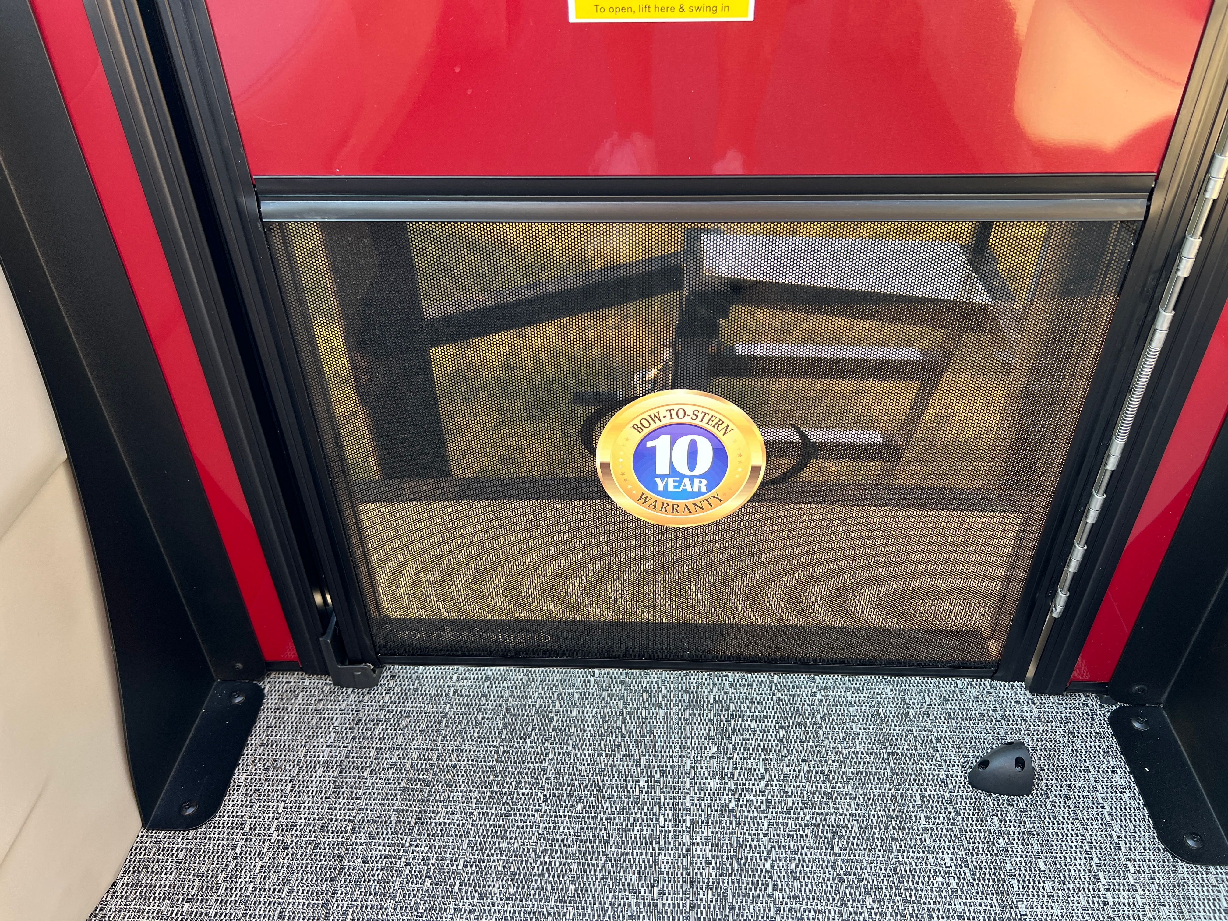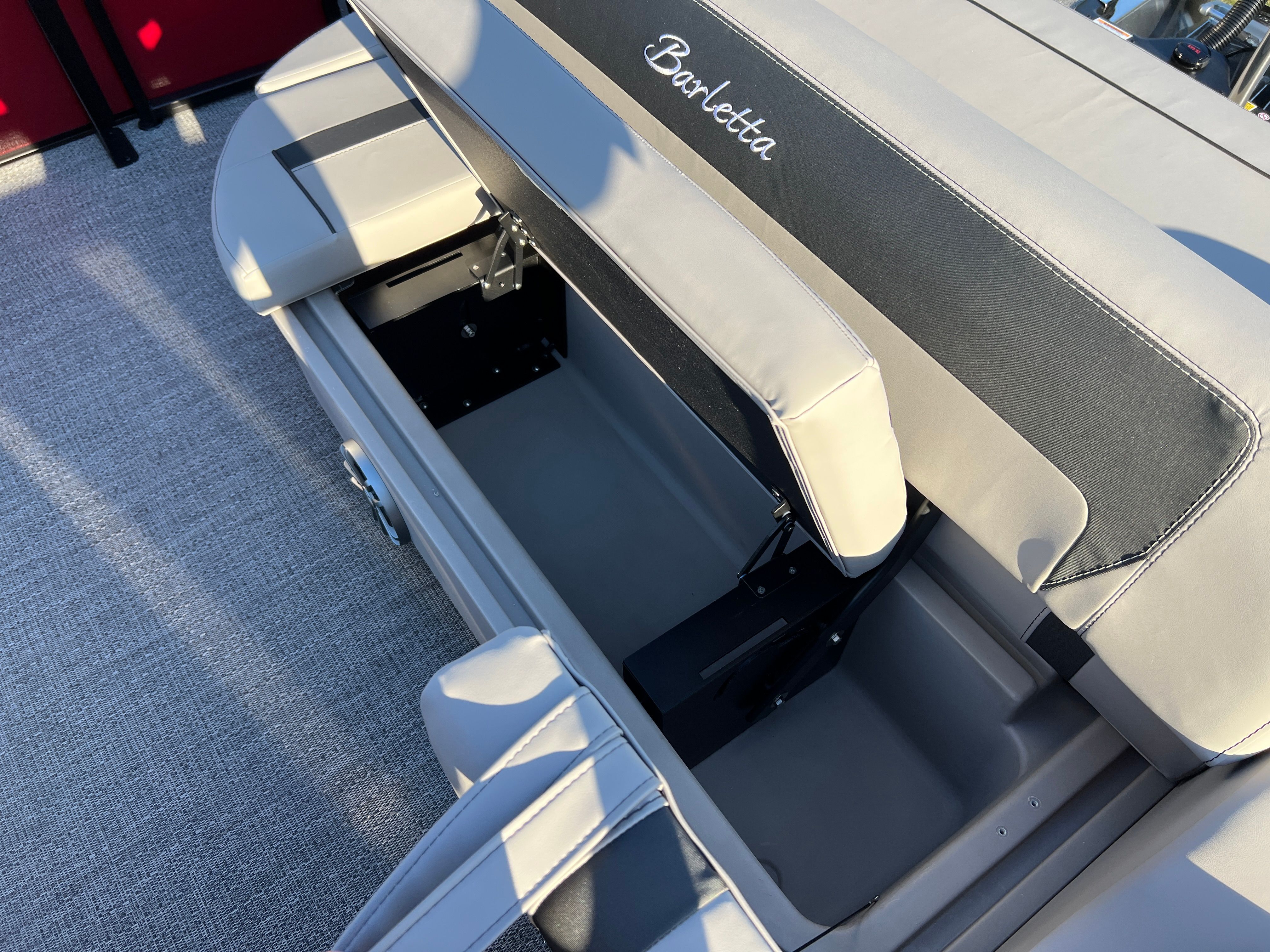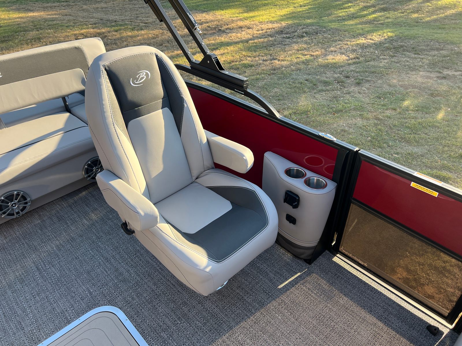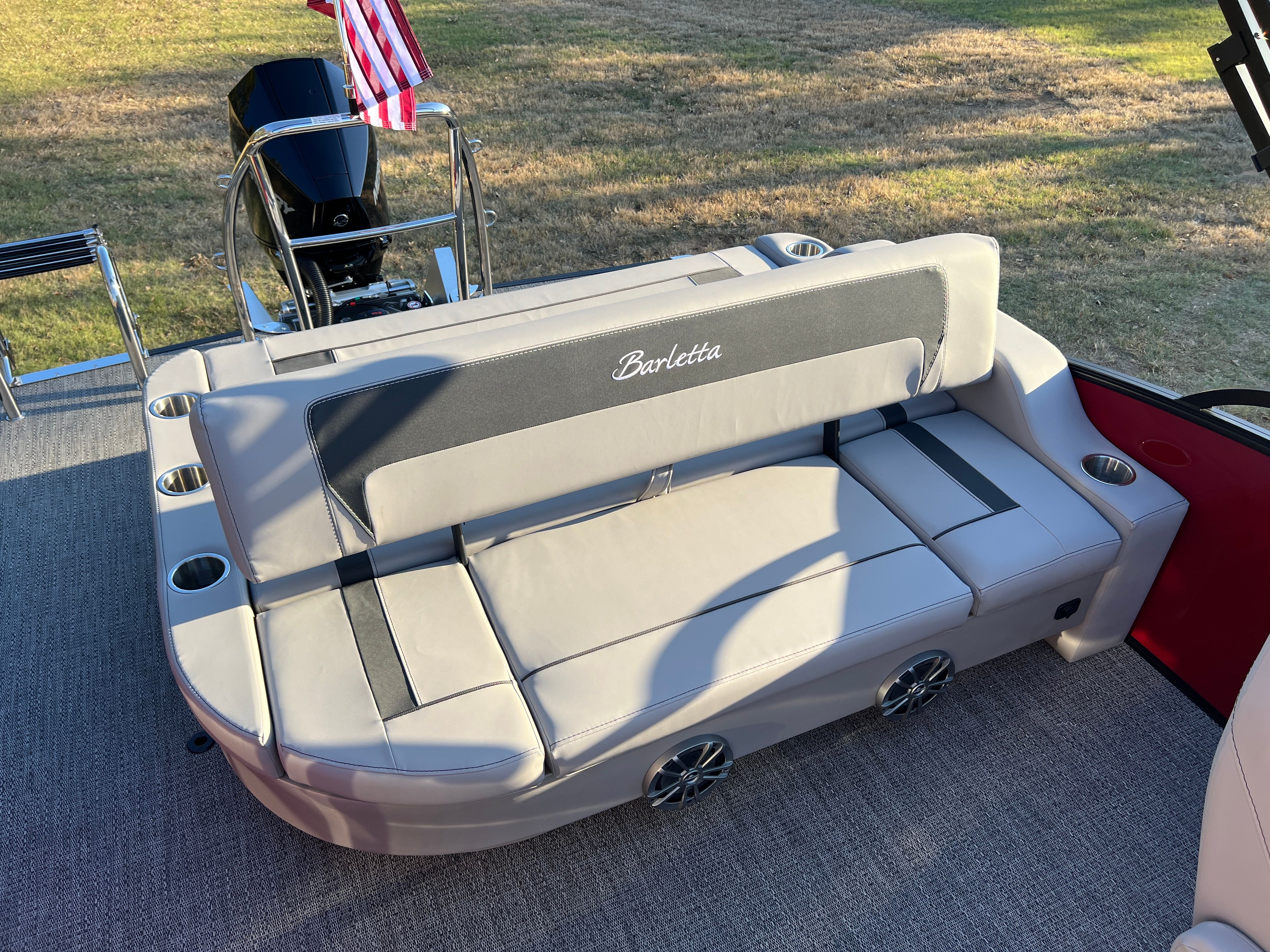 Step aboard the Aria A24UC and discover a world of premium features designed for comfort and convenience. The Tempest Gray furniture offers plush seating and a modern aesthetic, while the Amore Gray flooring provides a stylish and durable foundation for all your on-board activities. The in-floor midship storage is perfect for stowing away gear, water toys, or picnic essentials, keeping the deck clutter-free and organized. The stainless steel flag pole with an American flag adds a patriotic touch, making this pontoon boat a standout wherever you go.The Railskin Color Aria in Red Garnet, paired with the Black Diamond accent and Blackout Package Aria, creates a bold and sophisticated look that is sure to impress. Every detail, from the premium upholstery to the thoughtful storage solutions, is designed to enhance your boating experience and provide lasting value.