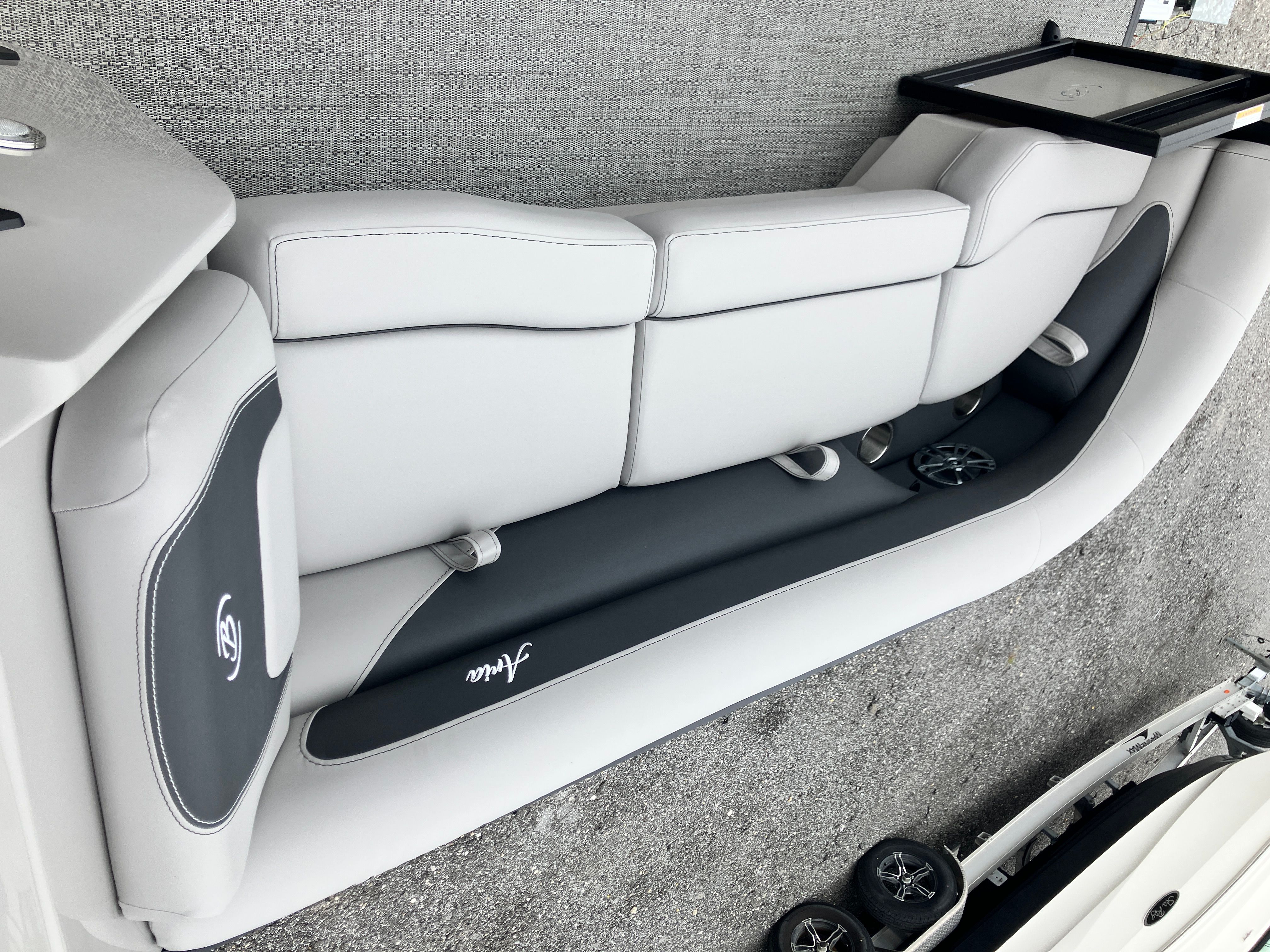 Step aboard and discover a world of premium features designed to elevate your boating experience. The Railskin Color Aria in Champagne, complemented by the Black Diamond accent, creates a sophisticated exterior that’s both timeless and modern. The Blackout Package Aria adds a bold touch, ensuring your pontoon stands out from the crowd. Inside, the Tempest Gray furniture offers plush seating and a refined atmosphere, while the Amore Gray flooring provides durability and style.The Coastal Edition Aria brings enhanced versatility, making this pontoon ideal for a variety of environments. The Triple Toon Package Aria boosts stability and performance, allowing for smoother rides and increased capacity. With the Mercury mechanical pre-rigging and power assist, handling is intuitive and enjoyable, while the rigged engine with a stainless steel prop ensures optimal efficiency and reliability.