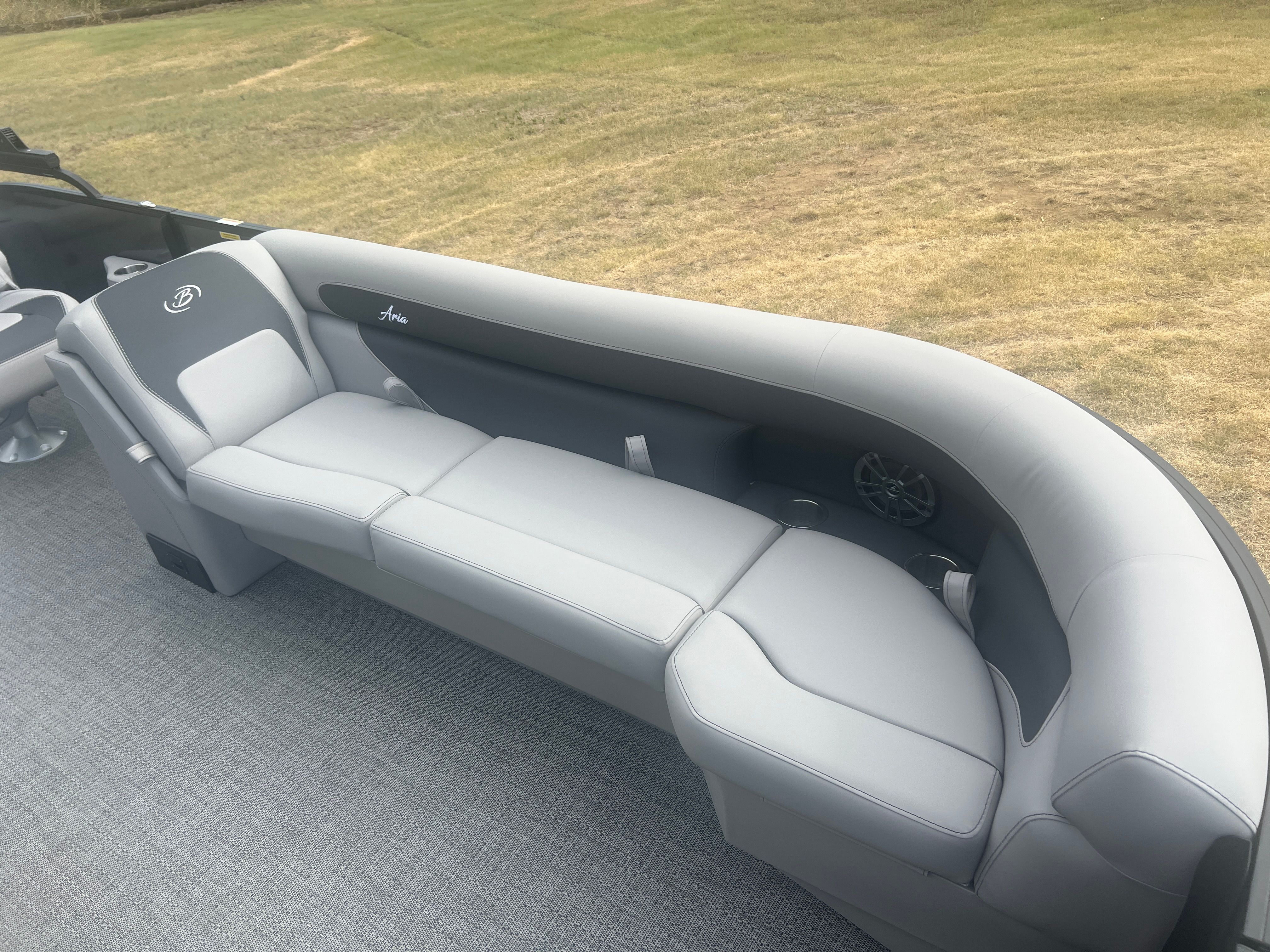 Step aboard and you’ll immediately notice the attention to detail in the Aria A24UC’s design. The Railskin Color Aria in Gray Moonstone and the Railskin Accent Aria in Black Diamond create a sophisticated, modern look, while the Blackout Package Aria adds a bold, distinctive touch. The furniture, finished in Tempest Gray, provides plush seating and a refined aesthetic, ensuring every passenger enjoys maximum comfort. The Amore Gray flooring is both stylish and practical, offering a soft surface that’s easy to clean and maintain.The Triple Toon Package Aria enhances the boat’s stability and buoyancy, making it ideal for larger groups and providing a smoother ride. The stainless steel flag pole with an American flag adds a patriotic flair, perfect for holiday outings or simply showing your pride on the water.