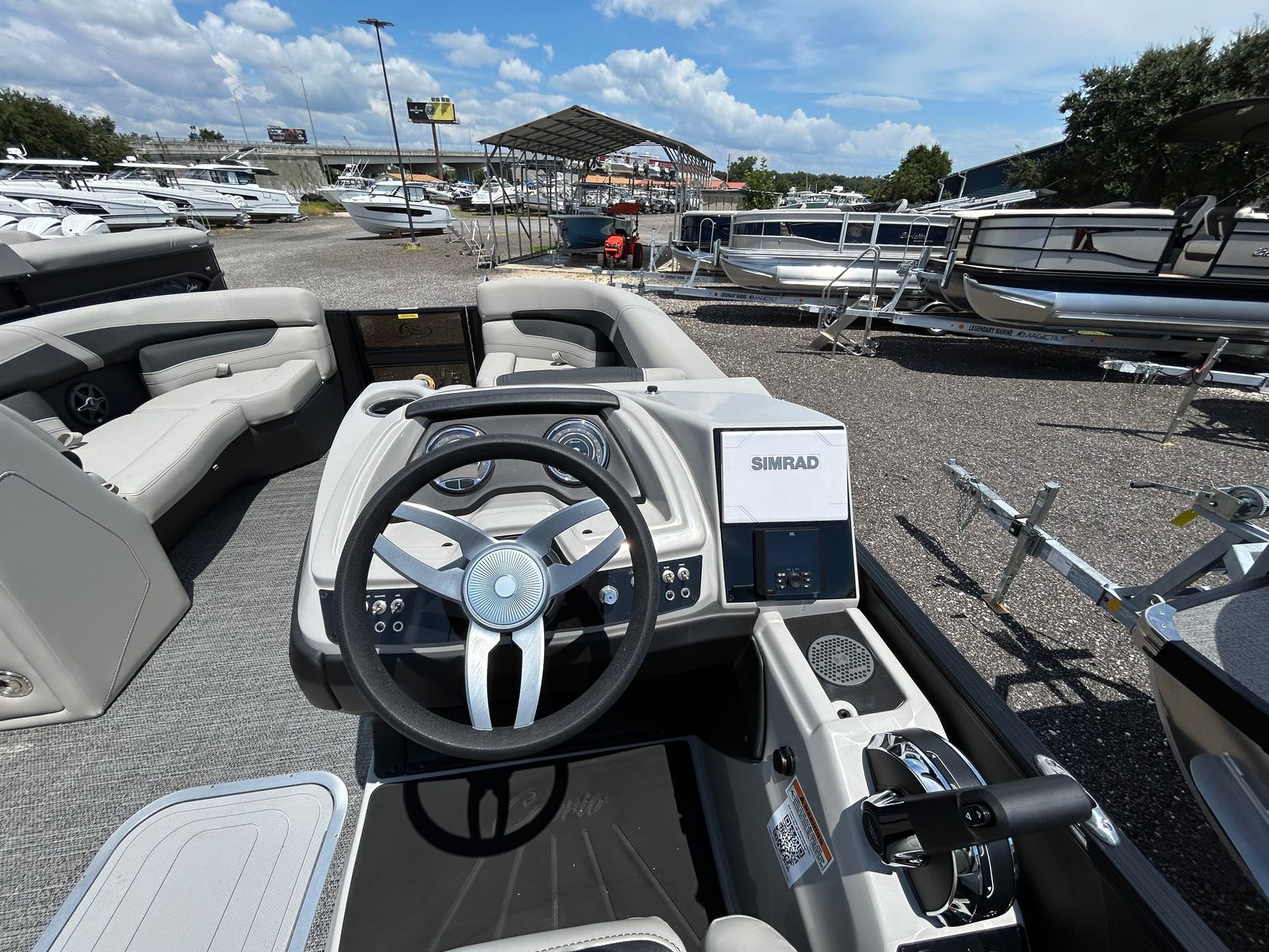 The Barletta Cabrio C22CC is packed with features that set it apart from other pontoon boats for sale. The Blackout Package Cabrio not only enhances the boat’s visual appeal but also adds a layer of sophistication to its overall design. The Matte Black railskin color complements the Marquesan Gray furniture, creating a modern and inviting atmosphere onboard. The Amore Gray flooring is both stylish and practical, offering durability and easy maintenance for years of enjoyment.A standout feature of this model is the Simrad 7 G07 XSR Chartplotter/Multifunction Display, which provides advanced navigation and system monitoring at your fingertips. Whether you are plotting a course, tracking your speed, or monitoring engine performance, this intuitive display ensures you stay informed and in control. The Stainless Steel Flag Pole with an American Flag adds a patriotic touch, making every outing a celebration of freedom and adventure.The Triple Toon Package with midship storage not only improves performance but also offers additional space for storing gear, water toys, and other essentials. This thoughtful design ensures that your deck remains uncluttered, maximizing comfort and safety for everyone onboard. The pre-rigging for Mercury with mechanical controls streamlines the setup process, allowing you to get on the water faster and with greater peace of mind.