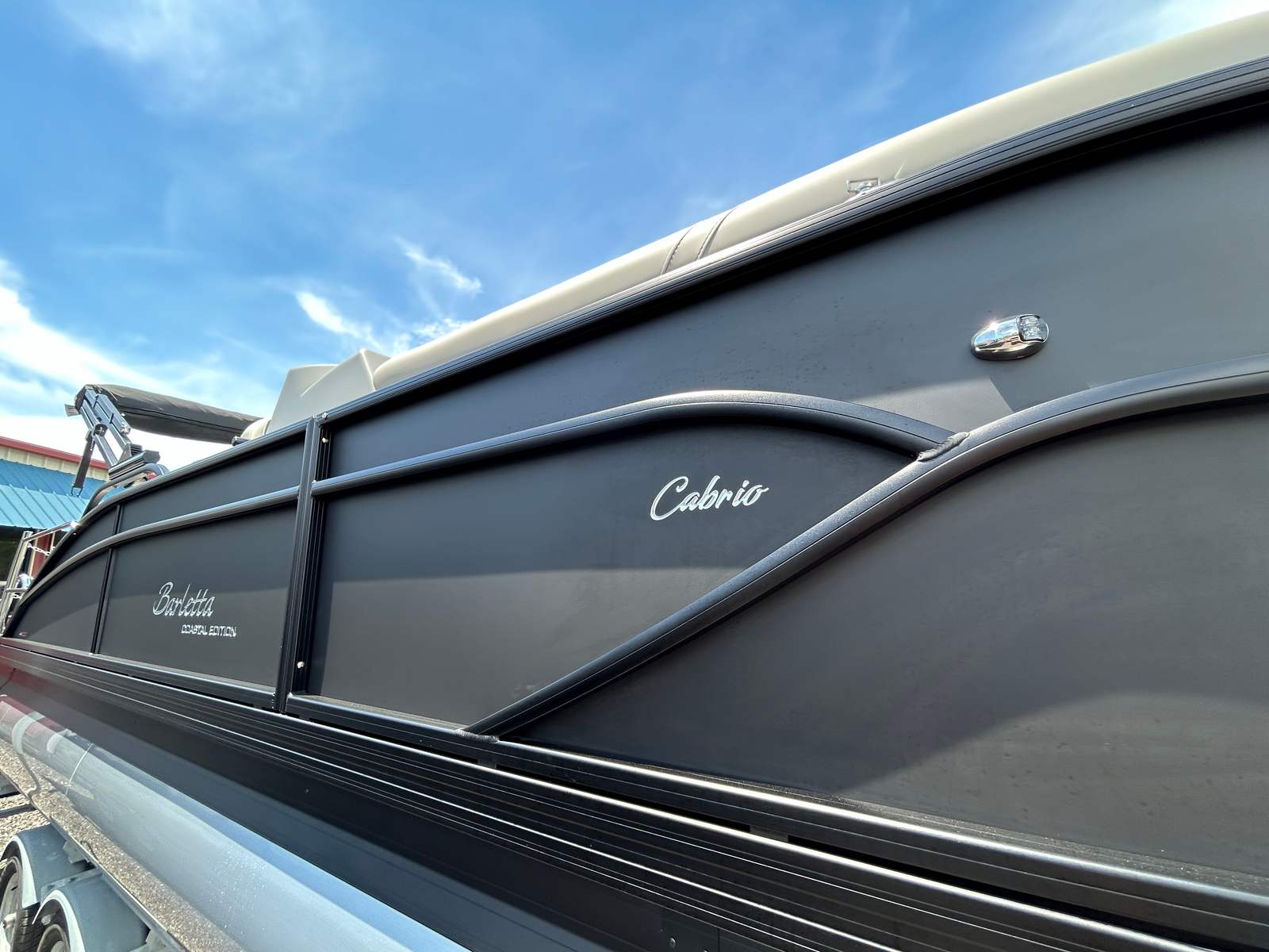 The 2025 Barletta Cabrio C22CC stands out as a premier choice among pontoon boats, offering a perfect balance of comfort, performance, and modern aesthetics. Measuring just over 23 feet in length, this new Barletta boat for sale provides ample space for relaxation and recreation. The Cabrio C22CC’s contemporary design is accentuated by its Matte Black railskin color and the sophisticated Blackout Package Cabrio, giving it a bold, eye-catching presence on the water. The Marquesan Gray furniture with Charcoal accents adds a touch of elegance, ensuring that every outing feels like a special occasion.