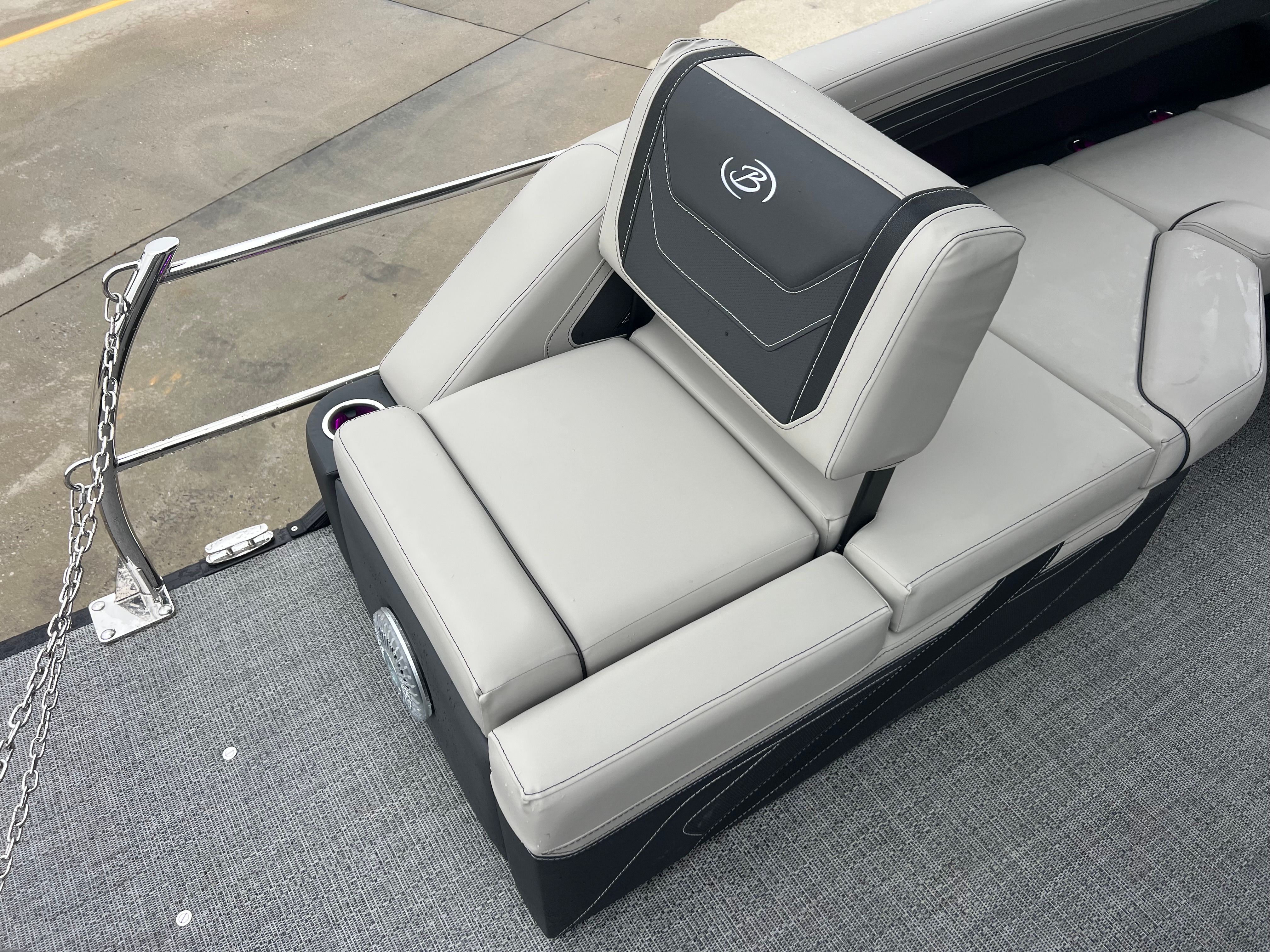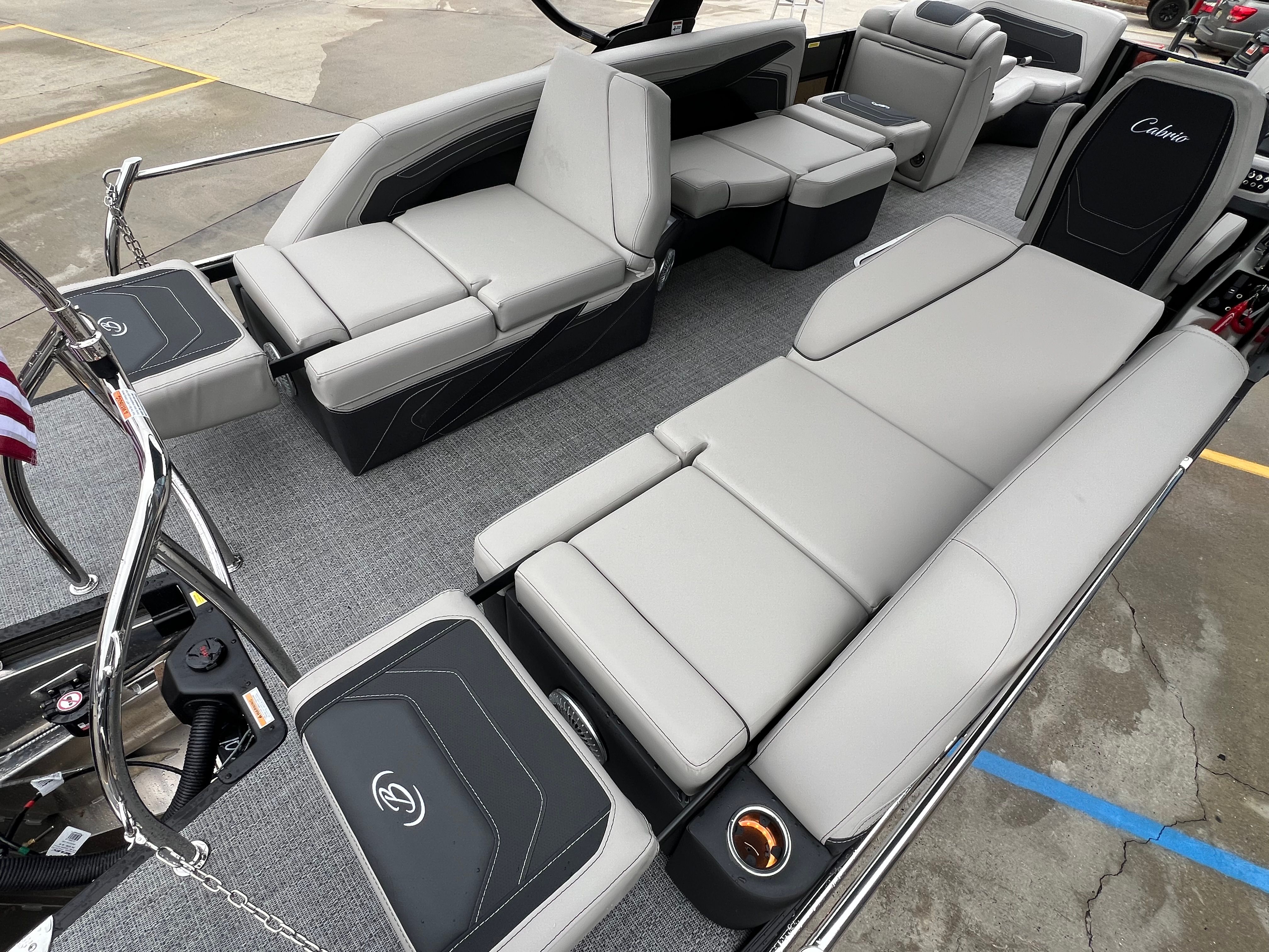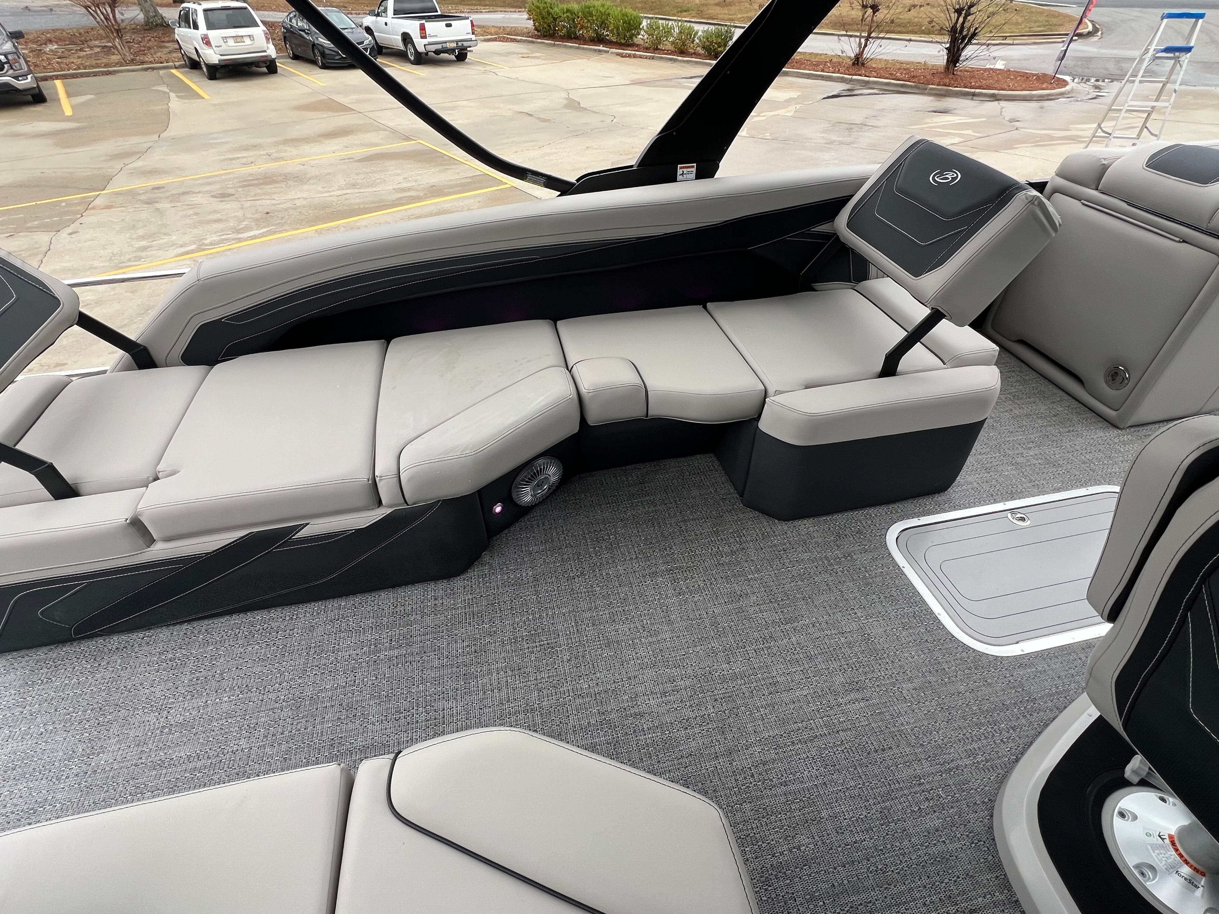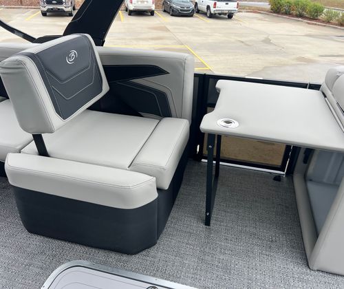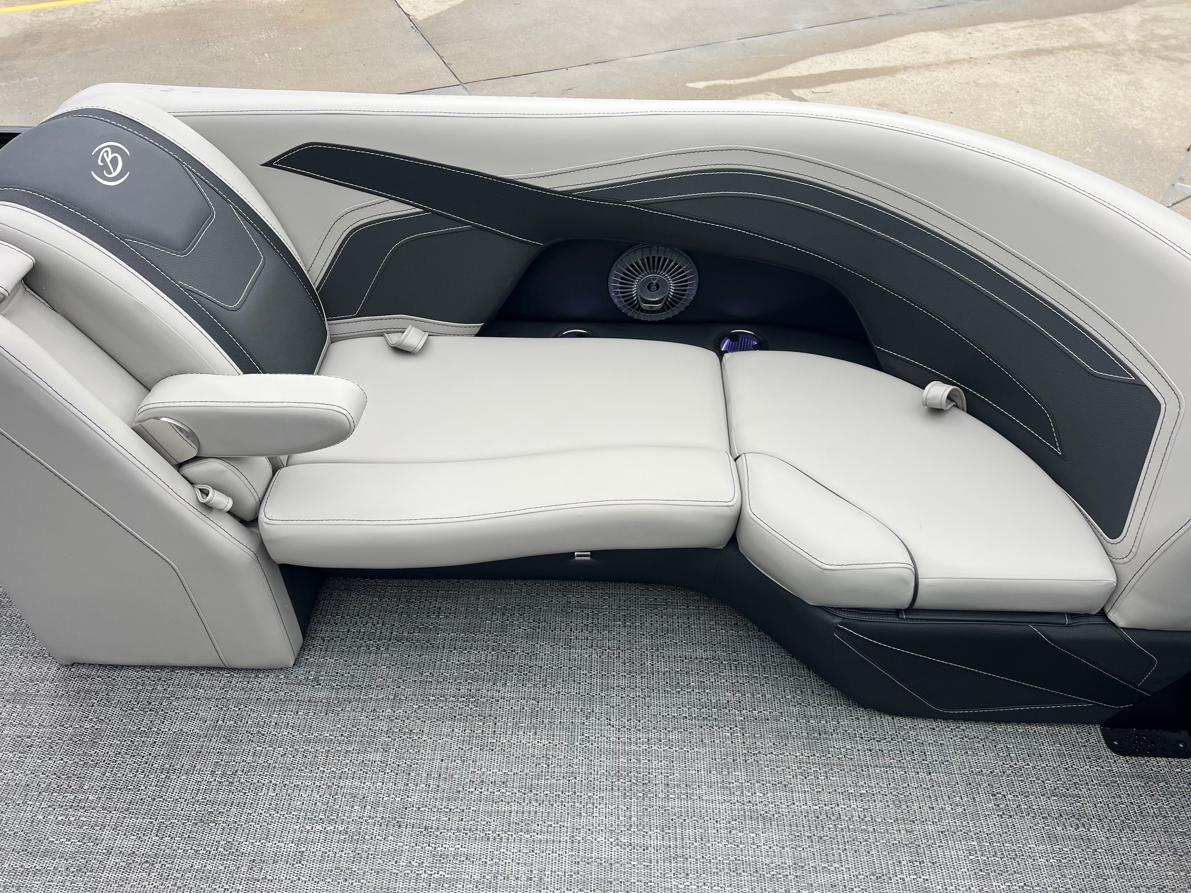 This pontoon boat is loaded with premium features designed to enhance your boating experience. The Blackout Package Cabrio adds a touch of modern flair, while the Marquesan Gray furniture with Onyx accents creates a comfortable and inviting atmosphere. The Amore Gray flooring is both stylish and practical, offering durability and easy maintenance. The Triple Toon Package with midship storage maximizes stability and provides convenient space for your gear, ensuring everything you need is within reach. The pre-rigged Mercury mechanical system simplifies operation, and the sports bimini canvas offers shade and protection from the sun, allowing you to enjoy longer days on the water.