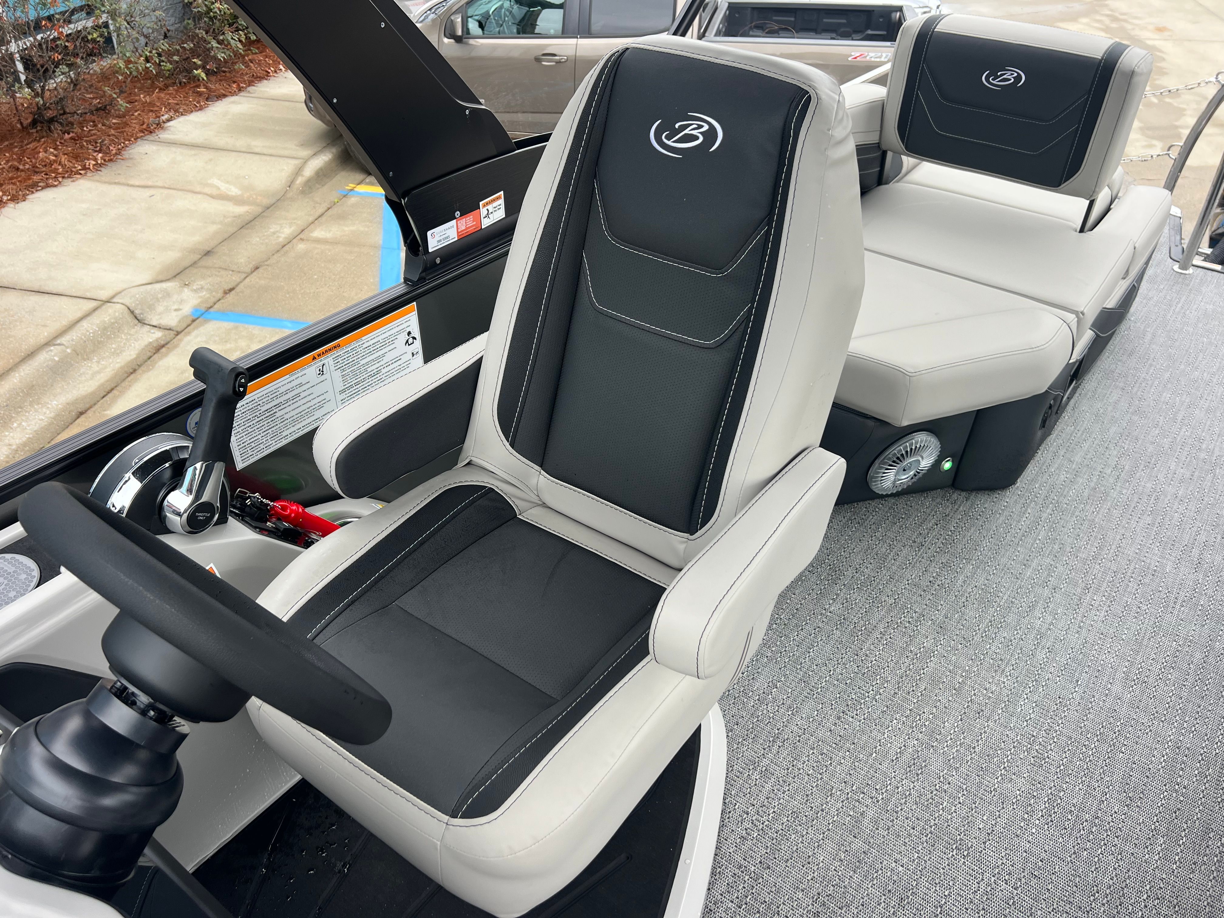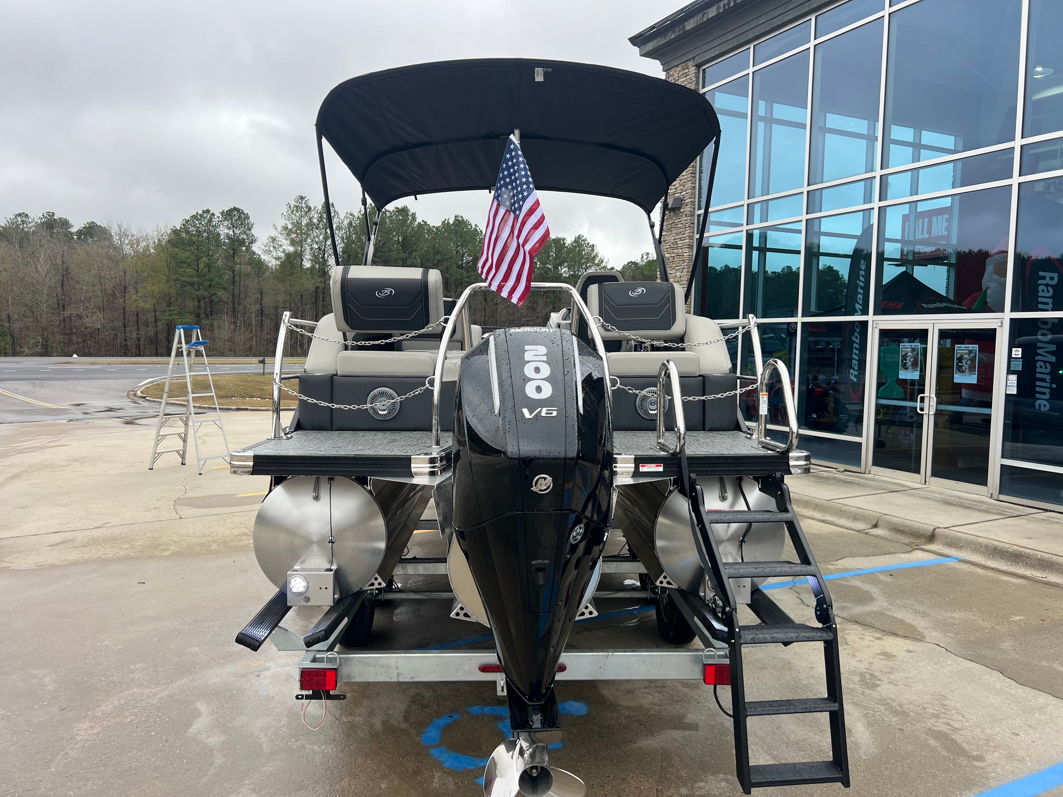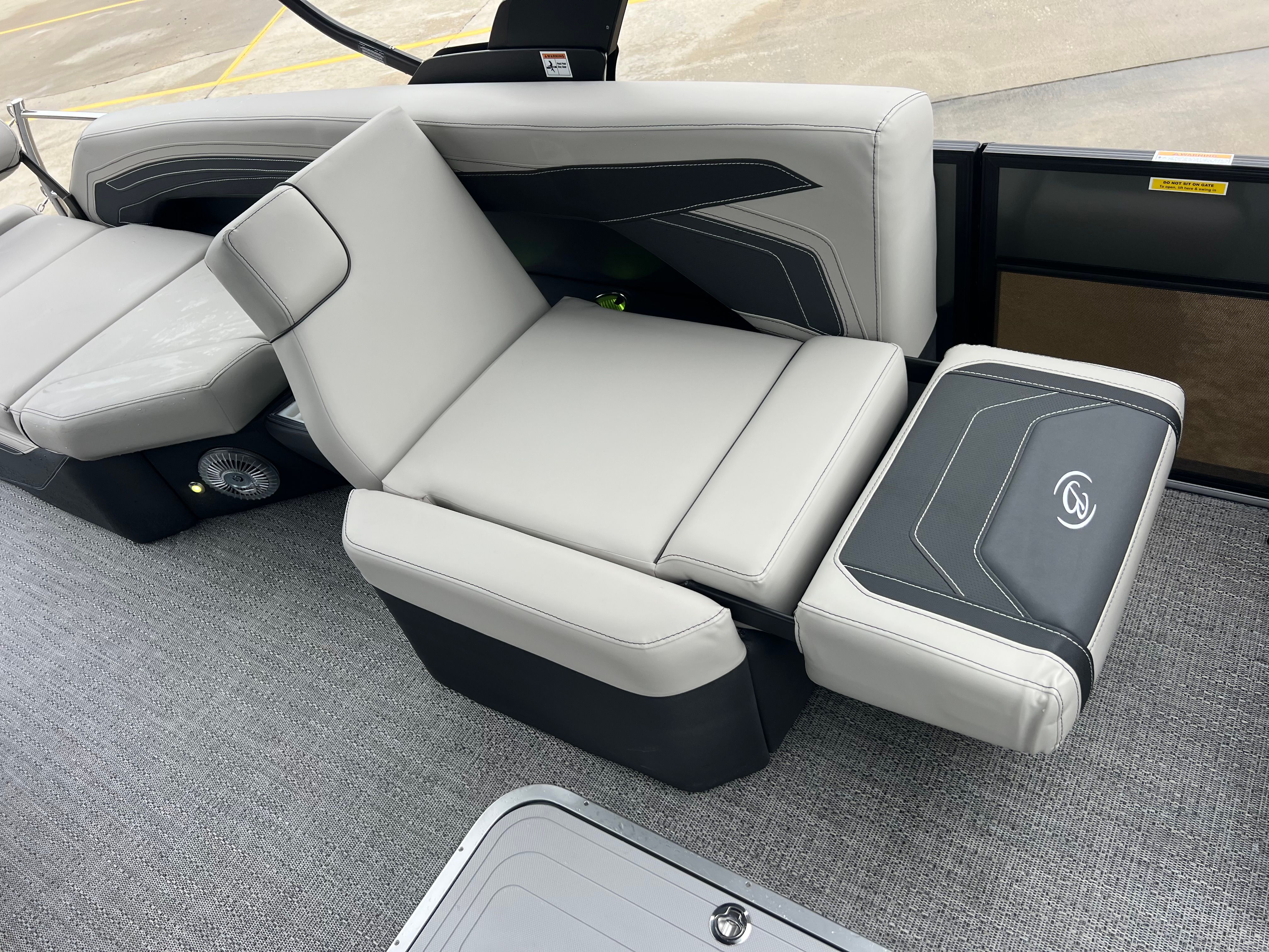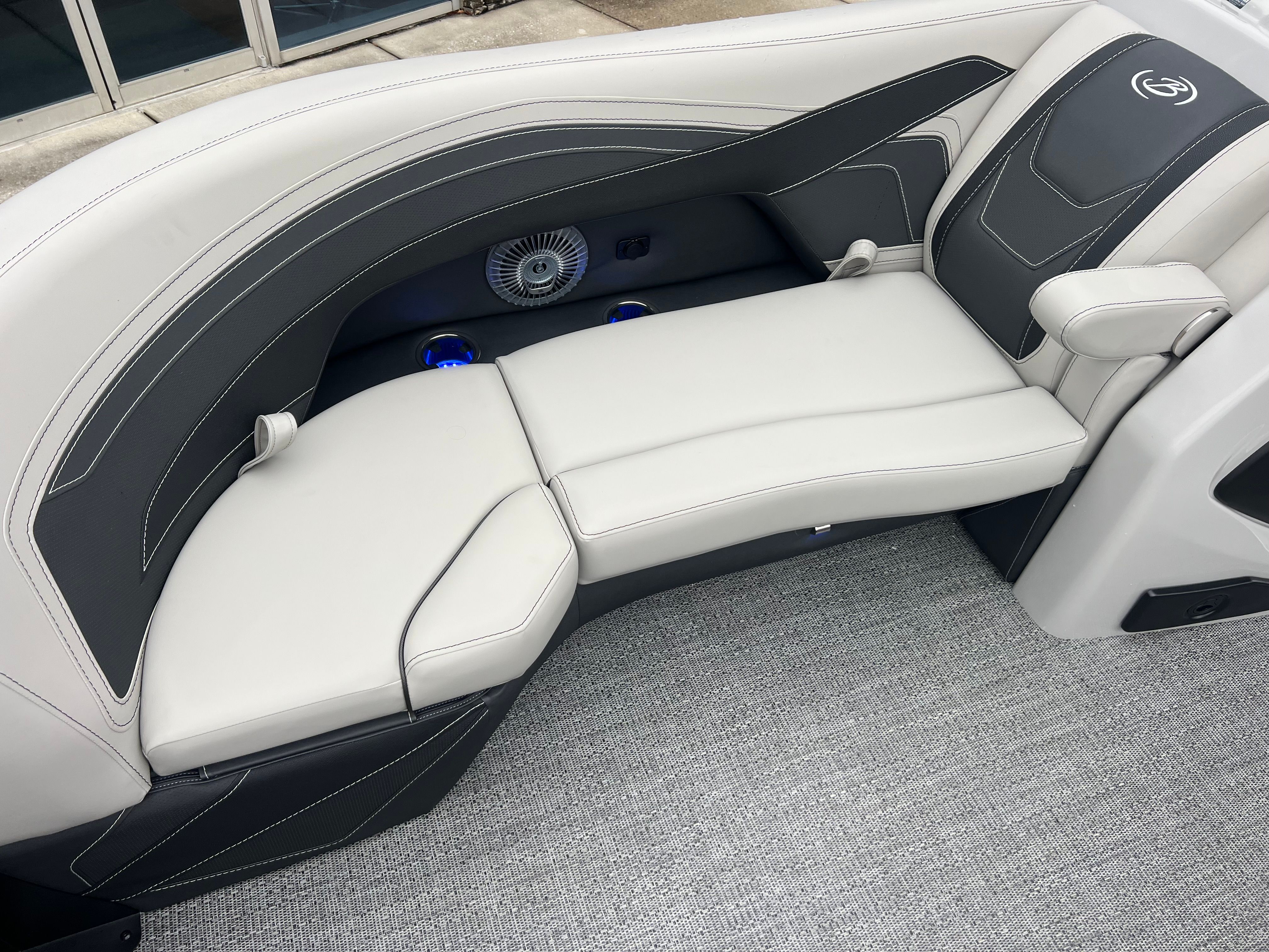 This pontoon boat is loaded with premium features designed to enhance your boating experience. The Blackout Package Cabrio adds a touch of modern flair, while the Marquesan Gray furniture with Onyx accents creates a comfortable and inviting atmosphere. The Amore Gray flooring is both stylish and practical, offering durability and easy maintenance. The Triple Toon Package with midship storage maximizes stability and provides convenient space for your gear, ensuring everything you need is within reach. The pre-rigged Mercury mechanical system simplifies operation, and the sports bimini canvas offers shade and protection from the sun, allowing you to enjoy longer days on the water.