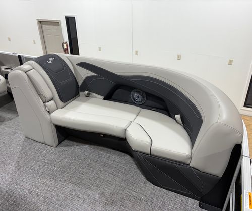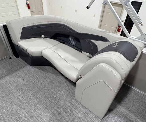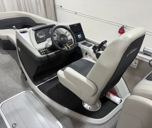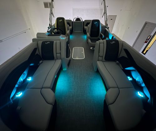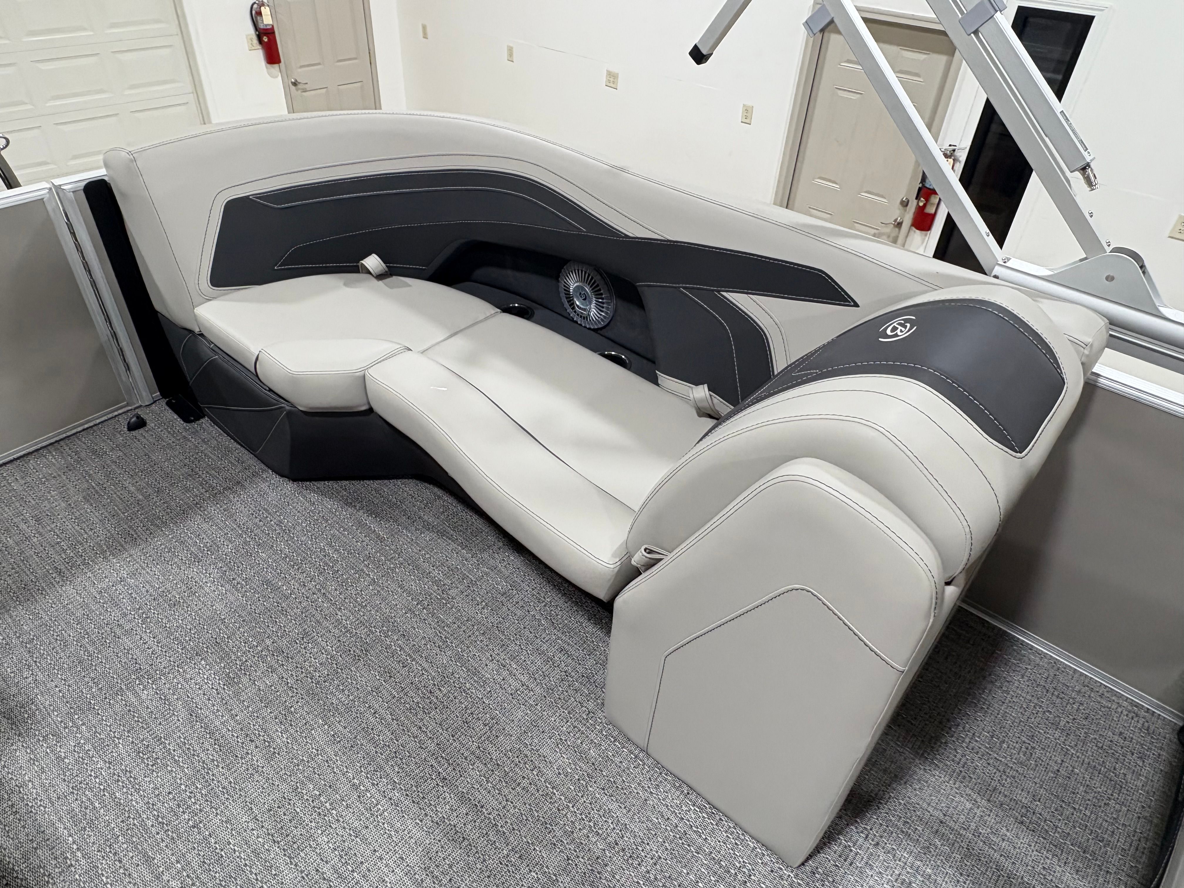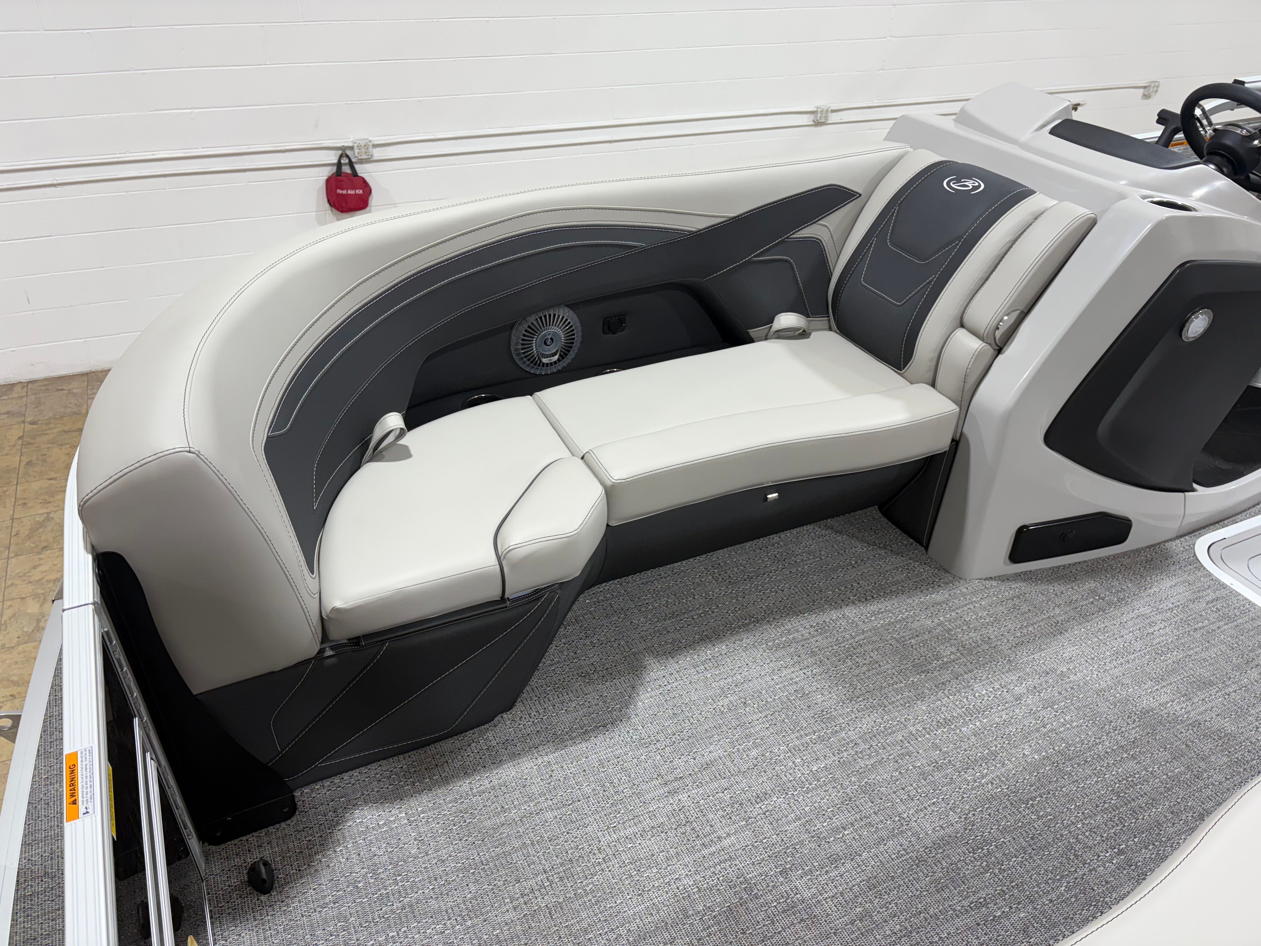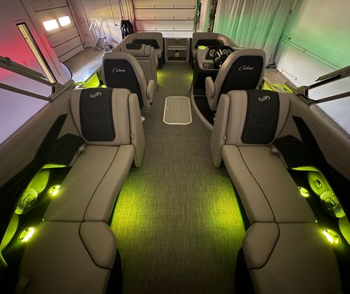 Step aboard and experience a world of comfort and innovation. The Cabrio C22QC boasts a Triple Toon Package with midship storage, maximizing both stability and onboard space. The Marquesan Gray furniture with Onyx accents provides a sophisticated and inviting atmosphere, while the Amore Gray flooring offers durability and easy maintenance. The exterior is adorned with a stainless steel flag pole featuring an American flag, adding a touch of patriotism and elegance.Lighting is a standout feature, with white underdeck and underwater exterior lighting that creates a captivating ambiance for evening cruises and dockside gatherings. The railskin color in Gray Moonstone, complemented by the Champagne accent, gives the boat a refined, modern look that’s sure to impress. Every detail, from the furniture to the flooring, has been thoughtfully selected to enhance your boating experience.