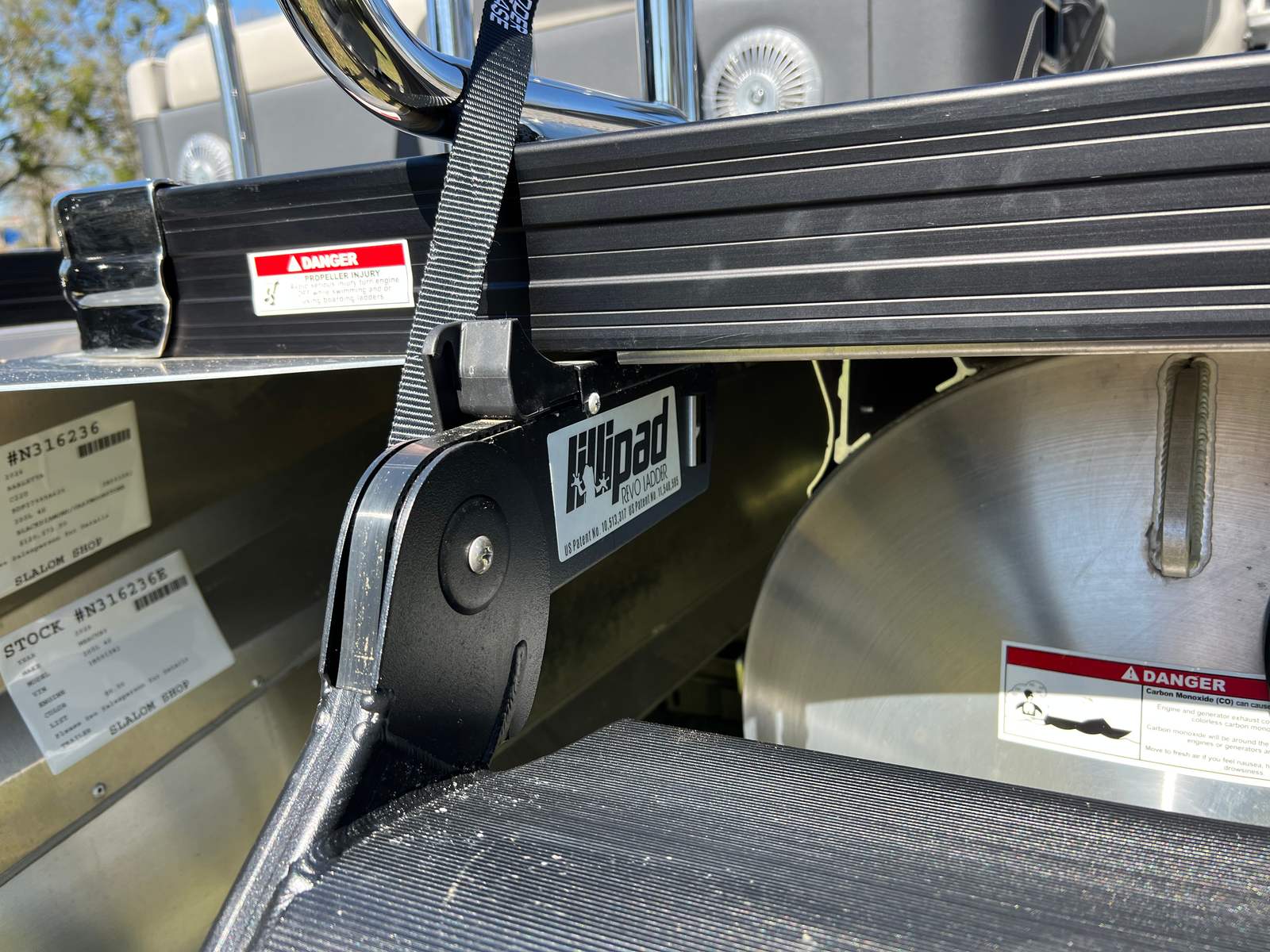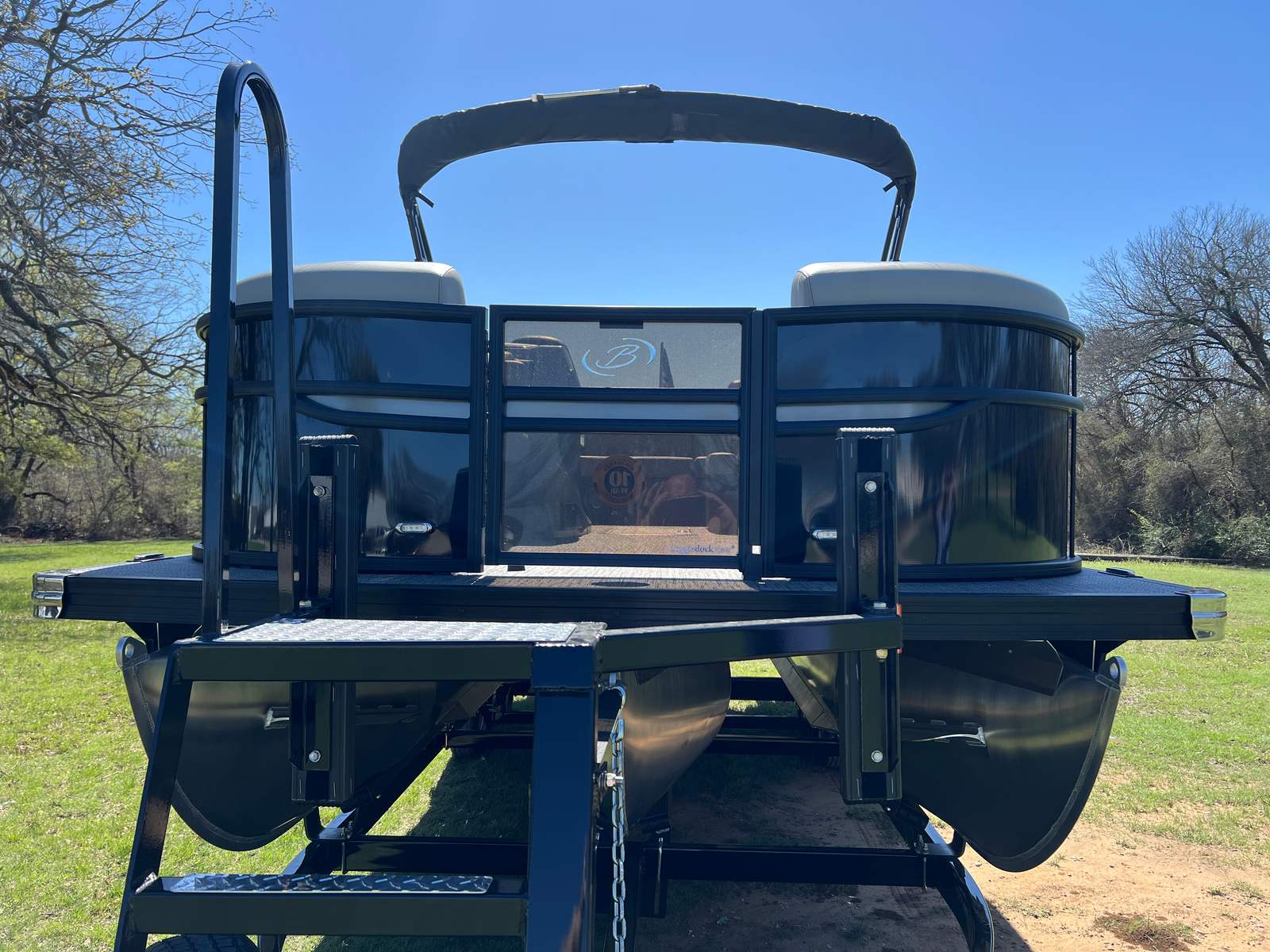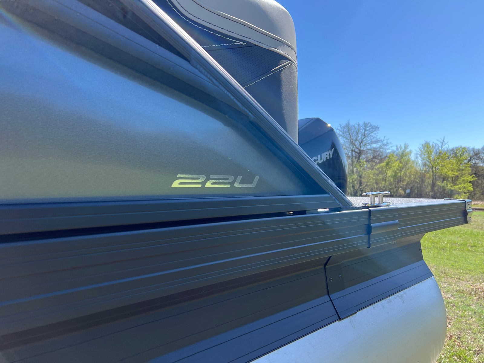The Barletta Cabrio C22U is packed with special features that elevate its appeal and functionality. The Railskin Color in Black Diamond, complemented by the Gray Moonstone accent, gives the boat a sophisticated and contemporary look. The Blackout Package Cabrio adds a touch of exclusivity, ensuring your pontoon stands out wherever you go. Inside, the Marquesan Gray furniture with Onyx accents creates a comfortable and stylish environment, while the Amore Gray flooring is both attractive and easy to maintain.One of the standout features is the Triple Toon Package with midship storage, providing enhanced stability and extra space for gear, water toys, or personal belongings. The Sport Bimini canvas, installed in place of the standard bimini, offers superior sun protection and adds a sporty flair to the boat’s profile. Every detail, from the rigged engine with stainless steel prop to the thoughtfully designed interior, reflects Barletta’s dedication to quality and user satisfaction.