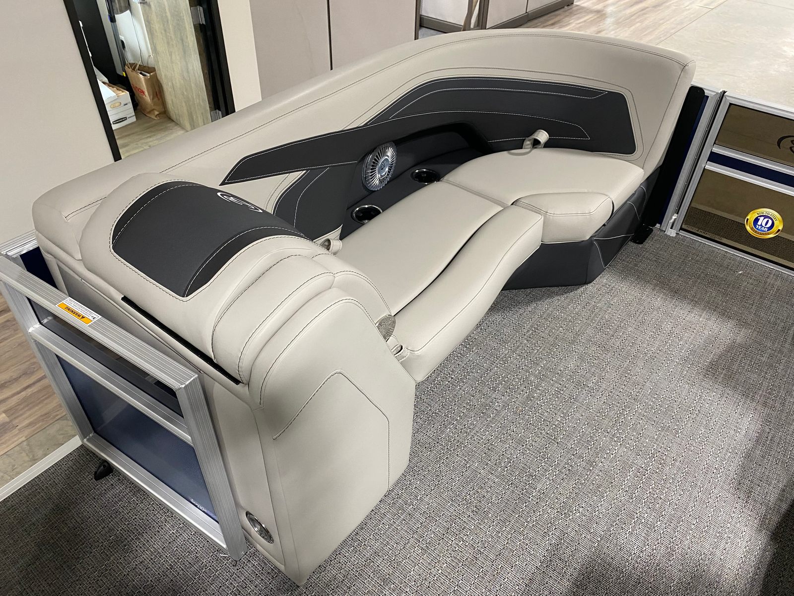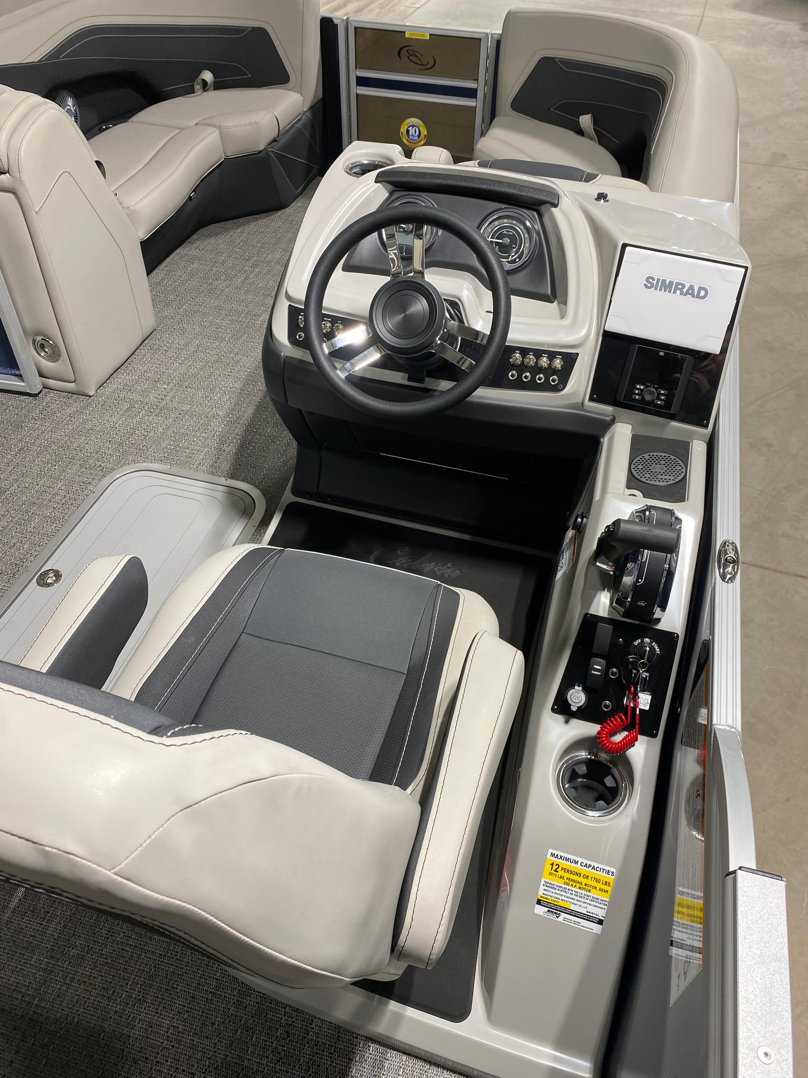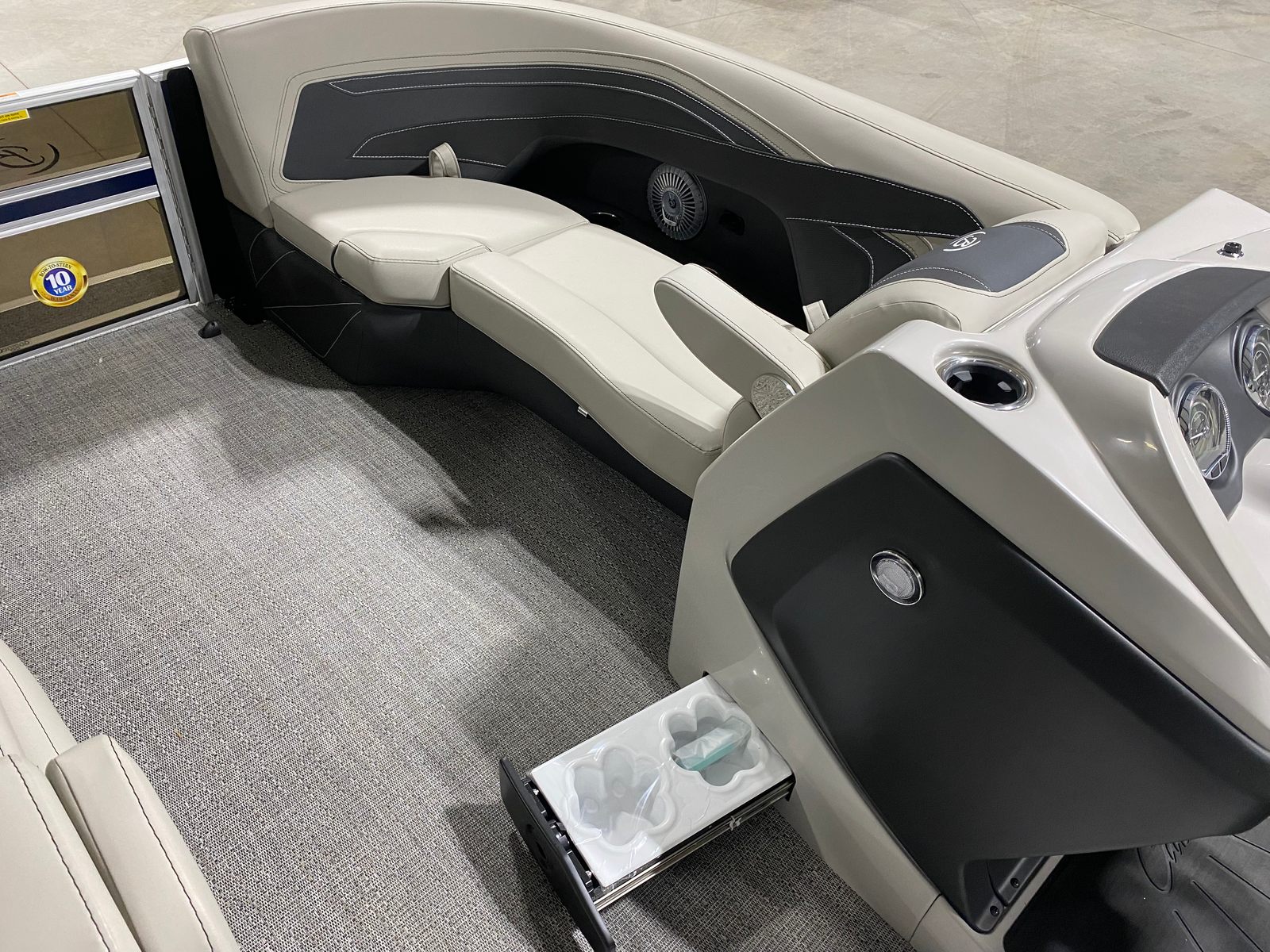 This pontoon boat is loaded with features that elevate your boating experience. The Blue Sapphire Railskin color gives the Cabrio C22UC a striking, contemporary look, while the Marquesan Gray with Onyx furniture offers plush, supportive seating for all-day comfort. The Amore Gray flooring is not only stylish but also durable and easy to maintain, making it ideal for active days on the water.The triple toon package with midship storage provides additional buoyancy and storage capacity, ensuring you have plenty of room for gear, water toys, and personal items. The stainless steel flag pole with an American flag adds a patriotic touch, perfect for holiday outings or simply showing your pride on the water. Exterior white underdeck and underwater lighting, along with the interior RGB lighting package, create a captivating ambiance for evening cruises and social gatherings, allowing you to set the mood with customizable colors and effects.