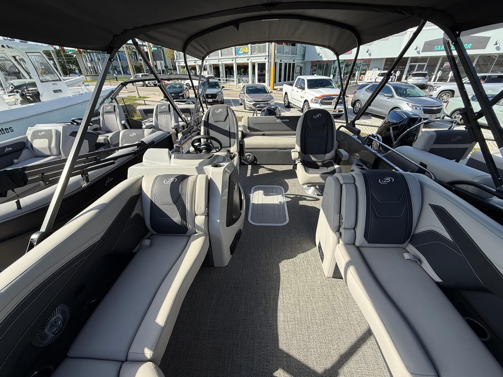 This pontoon boat is as practical as it is luxurious. The midship storage included in the Triple Toon Package provides ample space for life jackets, water sports equipment, and picnic supplies, keeping the deck clutter-free and organized. The power assist steering and Mercury Digital DTS system make docking and maneuvering a breeze, even for less experienced boaters. The durable Amore Gray flooring is designed for easy maintenance, so you can spend more time enjoying the water and less time cleaning up. With its fuel-efficient Mercury engine, you can explore further and stay out longer without worrying about frequent refueling stops.
