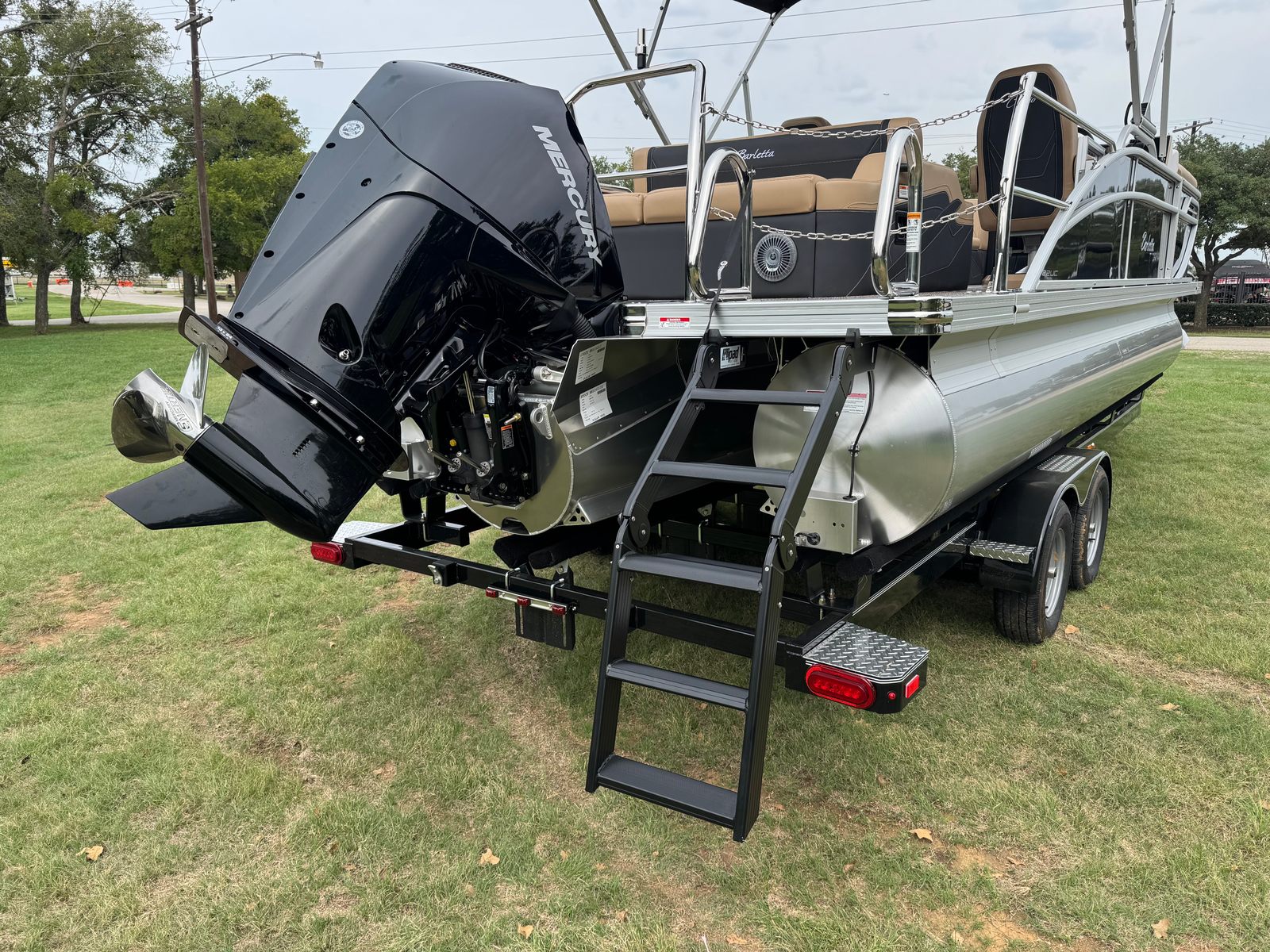The Barletta Cabrio C22UC is packed with features that set it apart from other pontoon boats for sale. The striking Black Diamond Railskin not only adds a touch of elegance but also offers durability against the elements. Inside, the Carmella Tan furniture with Onyx detailing provides plush seating and a refined look, perfect for lounging or socializing. The Amore Tan flooring is both stylish and practical, designed to withstand heavy foot traffic while remaining easy to clean.The Triple Toon Package with midship storage is a game-changer, offering enhanced buoyancy and stability for a smoother ride. This feature also provides convenient storage solutions, keeping your gear organized and accessible. The Mercury 200L FourStroke engine is paired with a mechanical pre-rig and power assist, ensuring effortless control and precision. The rigging includes a stainless steel prop for added reliability and performance.Additional highlights include the Metal Jacket Protectant, which safeguards the pontoon’s exterior from wear and tear, extending its lifespan and maintaining its pristine appearance. The stainless steel flag pole with an American flag adds a patriotic touch, while the stainless steel safety stanchions with chains enhance onboard safety for all passengers.