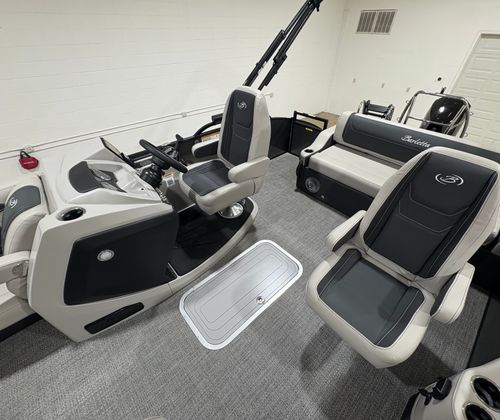 The Barletta Cabrio C22UC is packed with special features that set it apart from other pontoon boats for sale. The interior RGB lighting package creates a vibrant and customizable atmosphere, perfect for evening gatherings or celebrations. Exterior lighting, including white underdeck and underwater illumination, adds a touch of elegance and ensures visibility after sunset. The stainless steel flag pole with an American flag is a proud statement of style and patriotism.Inside, the Marquesan Gray with Onyx furniture offers both comfort and sophistication, complemented by Amore Gray flooring that is both stylish and easy to maintain. The blackout package on the railskin provides a modern, sleek look, while the matte black railskin color adds a bold finishing touch. At the helm, the Simrad 7" G07 XSR chartplotter/multifunction display offers advanced navigation and control, making every journey safe and enjoyable.