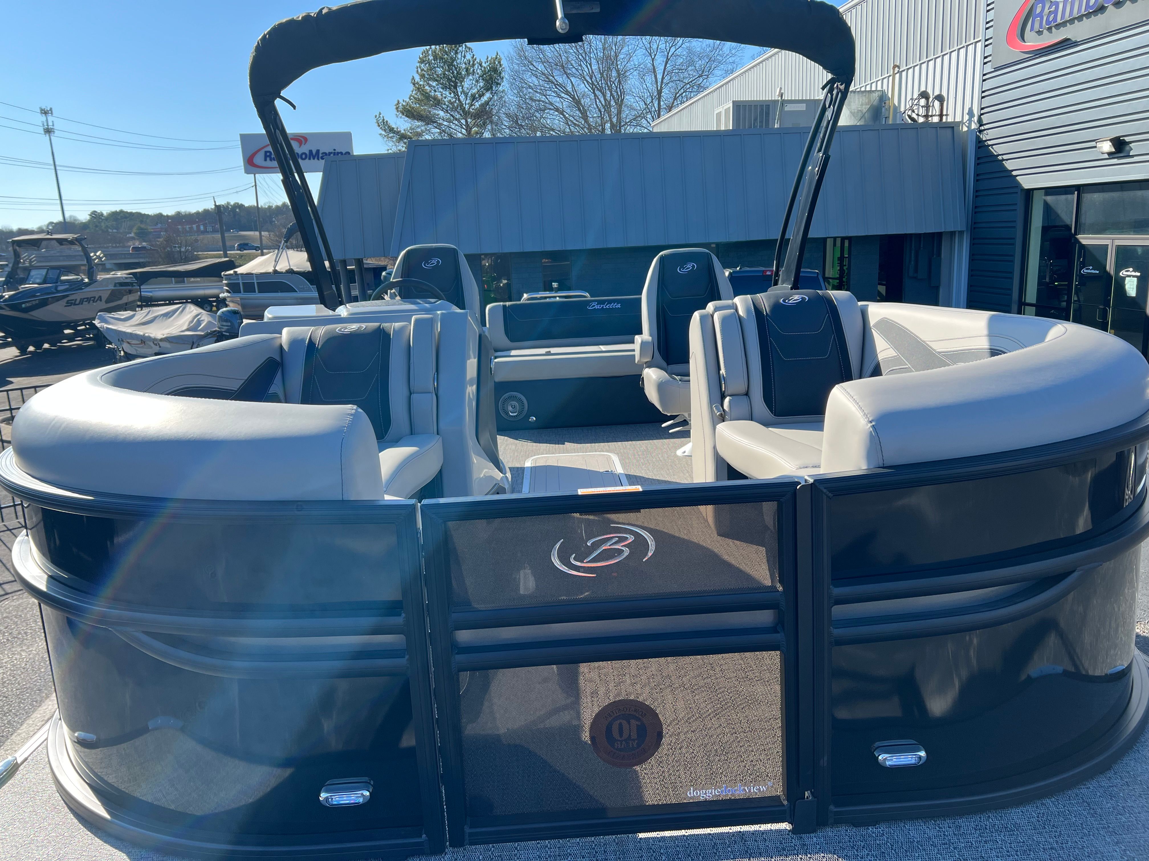 Step aboard the Barletta Cabrio C22UC and discover a world of comfort and style. The Railskin Color in Black Diamond, accented by Gray Moonstone, creates a striking visual appeal, while the Blackout Package Cabrio adds a touch of modern sophistication. The interior is adorned with Marquesan Gray furniture featuring Onyx accents, providing plush seating and a refined ambiance. The Amore Gray flooring is both elegant and durable, designed to withstand the rigors of active days on the water.The Triple Toon Package with midship storage not only boosts performance but also offers practical storage solutions for your gear and water toys. The Sport Bimini, installed in place of the standard bimini, provides generous shade and protection from the sun, ensuring comfort during long days on the water. Every detail of the Cabrio C22UC is thoughtfully designed to enhance your boating experience, from the premium materials to the innovative layout.
