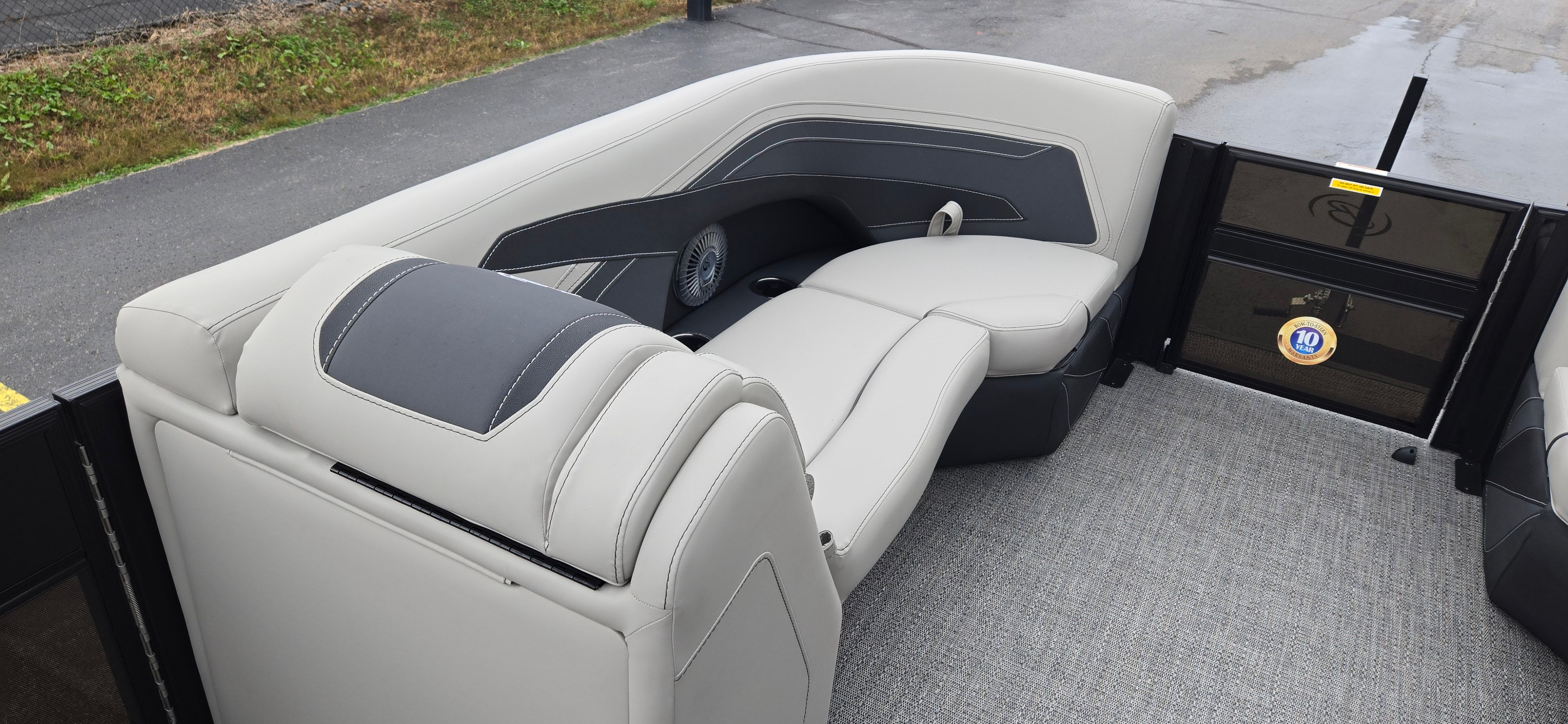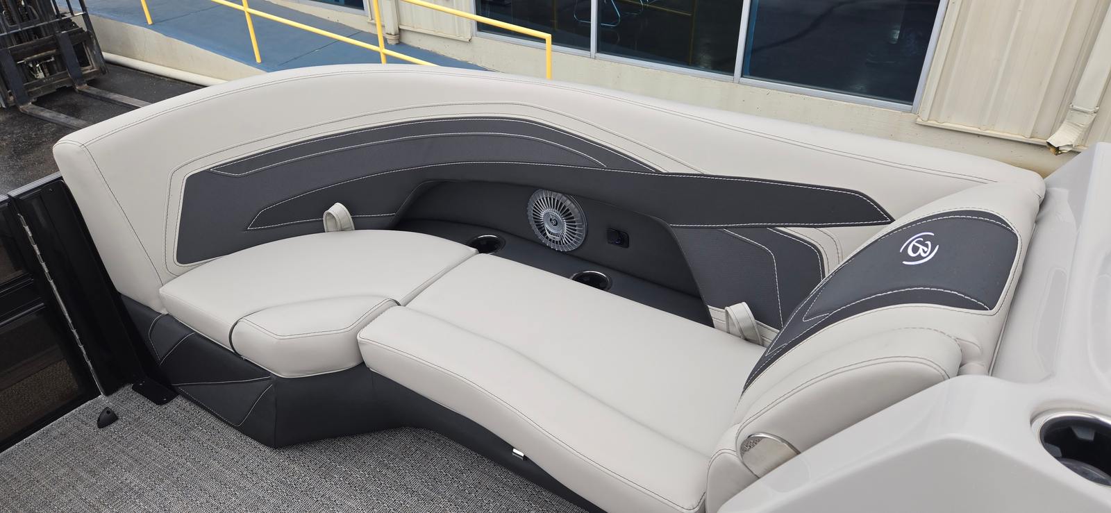 The 2026 Barletta Cabrio C22UC pontoon stretches to an impressive length of 23.17 feet, providing ample space for entertaining, relaxing, and enjoying the open water. As a new model, it showcases the latest advancements in pontoon design and technology, ensuring you benefit from modern amenities and superior build quality. The sleek Railskin Color in Gray Moonstone, accented by Black Diamond, gives this pontoon a sophisticated and contemporary look, while the Blackout Package Cabrio adds a touch of boldness and exclusivity. The Marquesan Gray with Onyx furniture and Amore Gray flooring create a refined and inviting atmosphere, making every outing feel like a luxury escape.