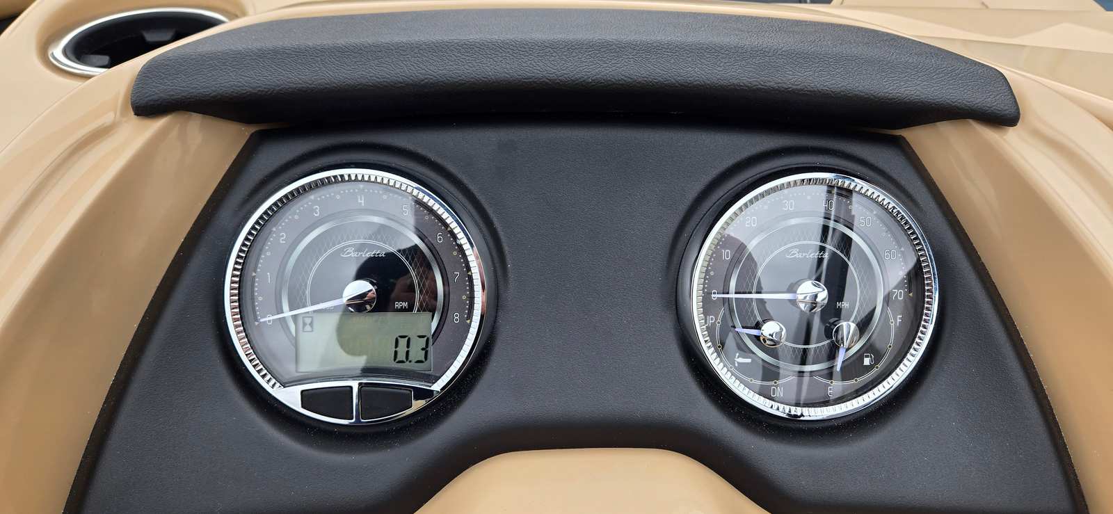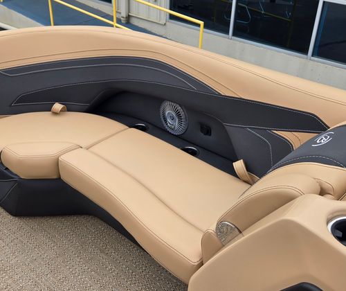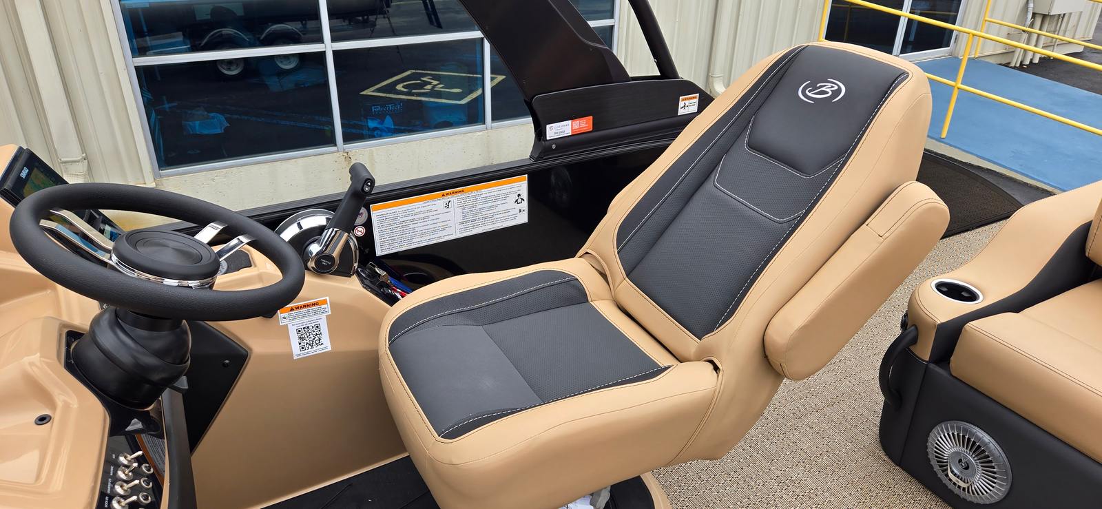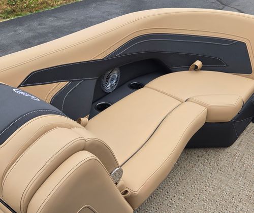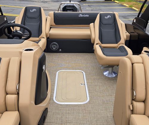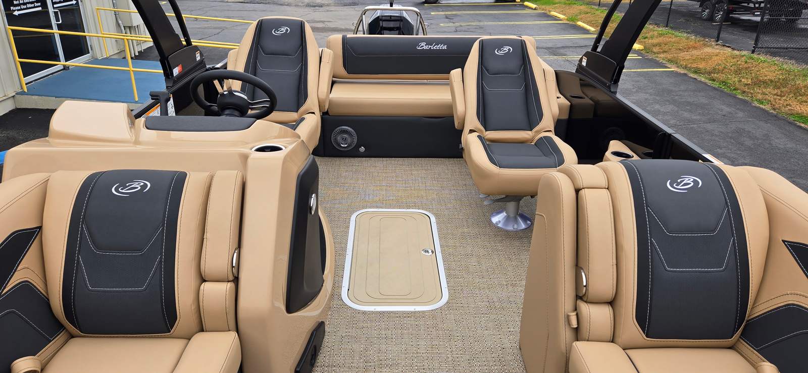 Step aboard and discover a world of thoughtful features and premium materials. The Railskin Color in Gray Moonstone, accented by Black Diamond, gives the exterior a sophisticated, modern appeal. The Blackout Package Cabrio adds a touch of elegance and exclusivity, ensuring your pontoon stands out wherever you go.Inside, the furniture is upholstered in Carmella Tan with Onyx accents, creating a warm and inviting atmosphere. The Amore Tan flooring is both stylish and practical, providing comfort underfoot and easy maintenance. The Triple Toon Package with midship storage on the Cabrio model offers enhanced stability and extra space for all your gear, making it easy to keep the deck clutter-free.For sun protection and relaxation, the Sport Bimini provides ample shade, allowing you to enjoy long days on the water in comfort. The on-board battery charger with two batteries ensures you have reliable power for all your electronic needs, so you can focus on fun without interruption.