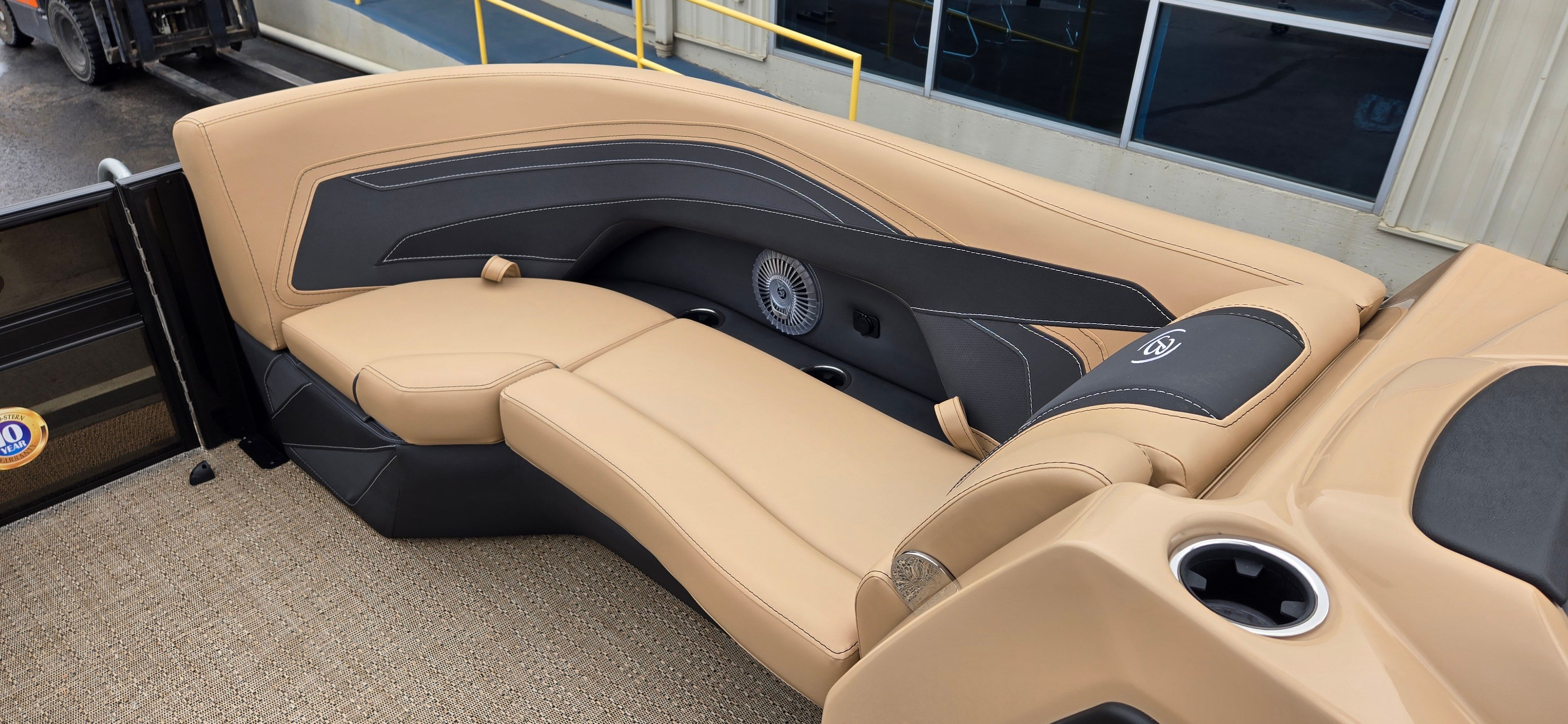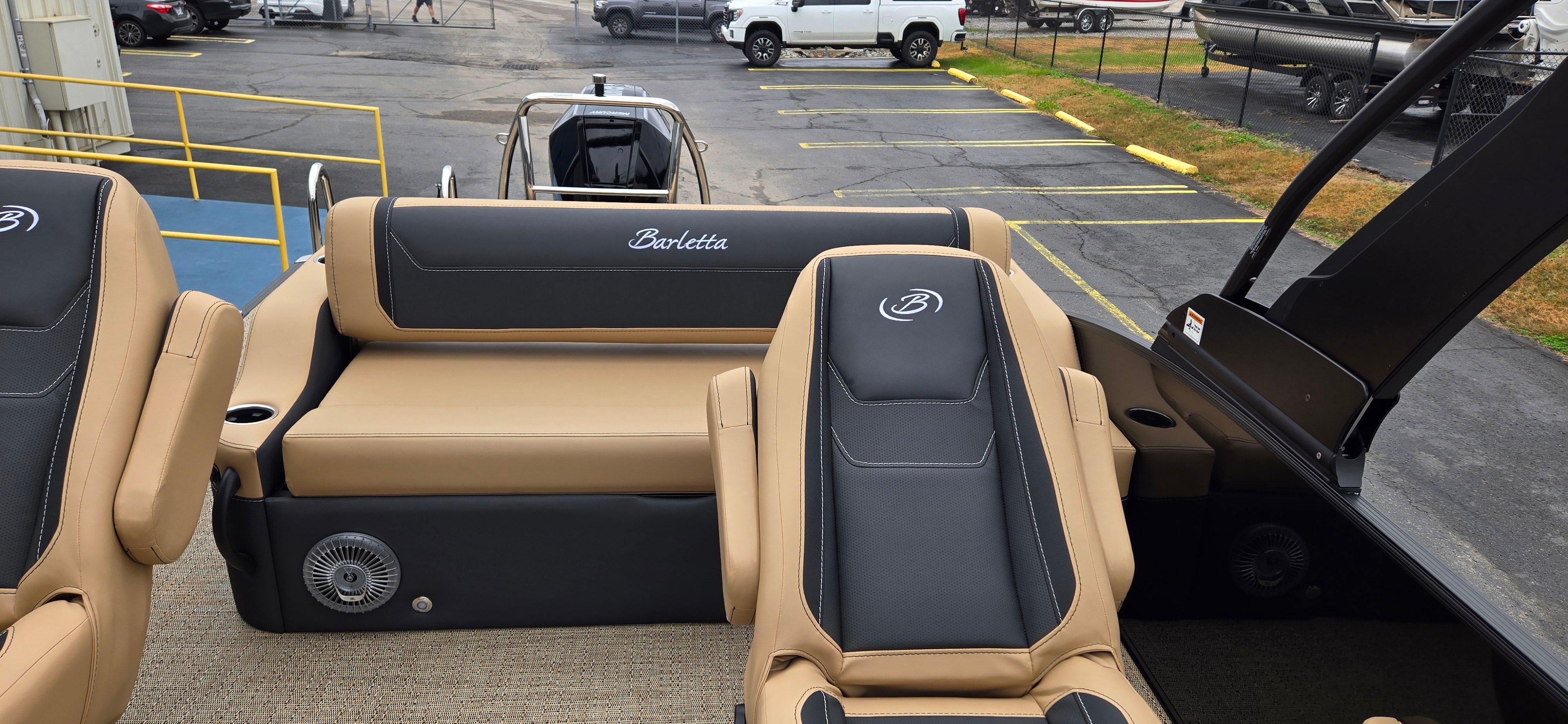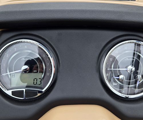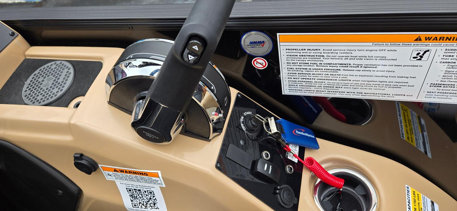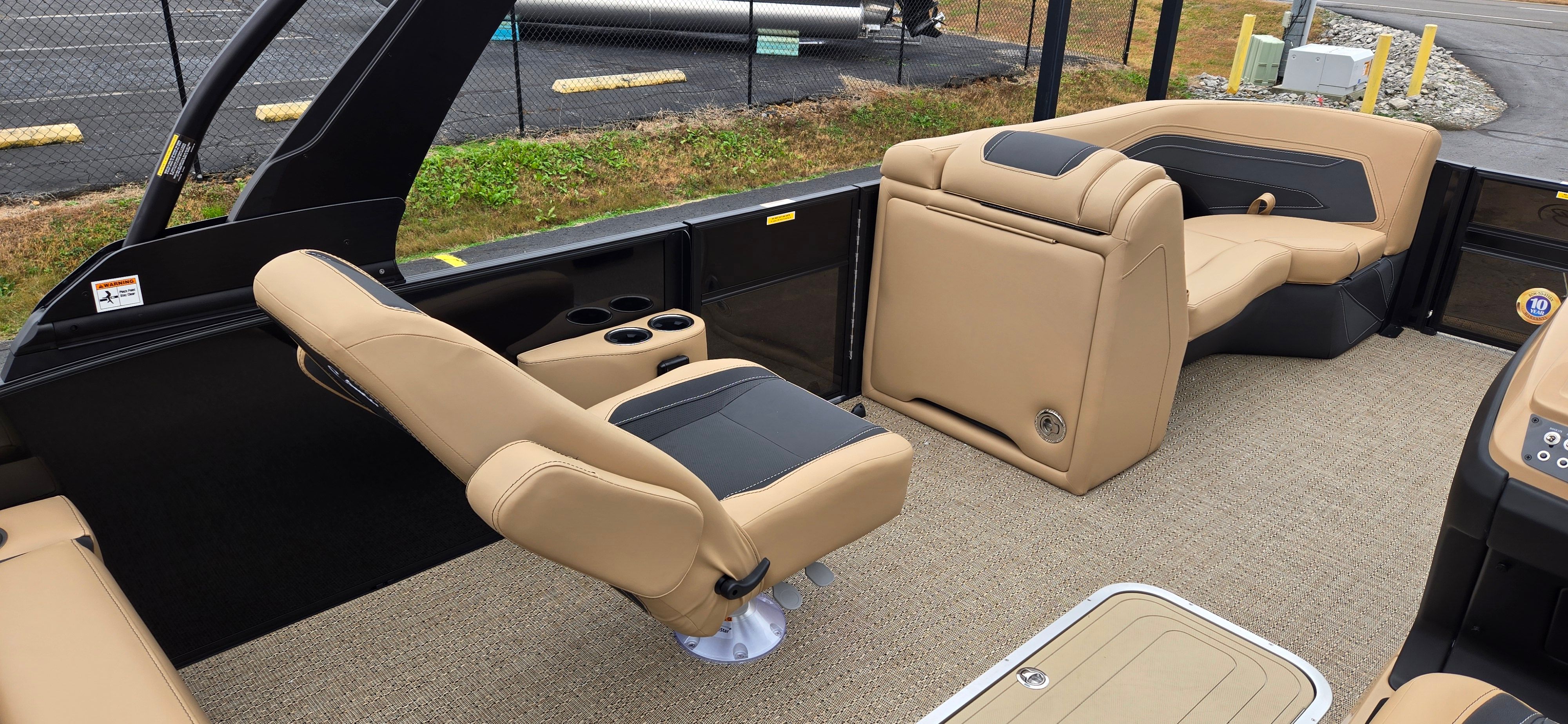 Step aboard and discover a world of thoughtful features and premium materials. The Railskin Color in Gray Moonstone, accented by Black Diamond, gives the exterior a sophisticated, modern appeal. The Blackout Package Cabrio adds a touch of elegance and exclusivity, ensuring your pontoon stands out wherever you go.Inside, the furniture is upholstered in Carmella Tan with Onyx accents, creating a warm and inviting atmosphere. The Amore Tan flooring is both stylish and practical, providing comfort underfoot and easy maintenance. The Triple Toon Package with midship storage on the Cabrio model offers enhanced stability and extra space for all your gear, making it easy to keep the deck clutter-free.For sun protection and relaxation, the Sport Bimini provides ample shade, allowing you to enjoy long days on the water in comfort. The on-board battery charger with two batteries ensures you have reliable power for all your electronic needs, so you can focus on fun without interruption.