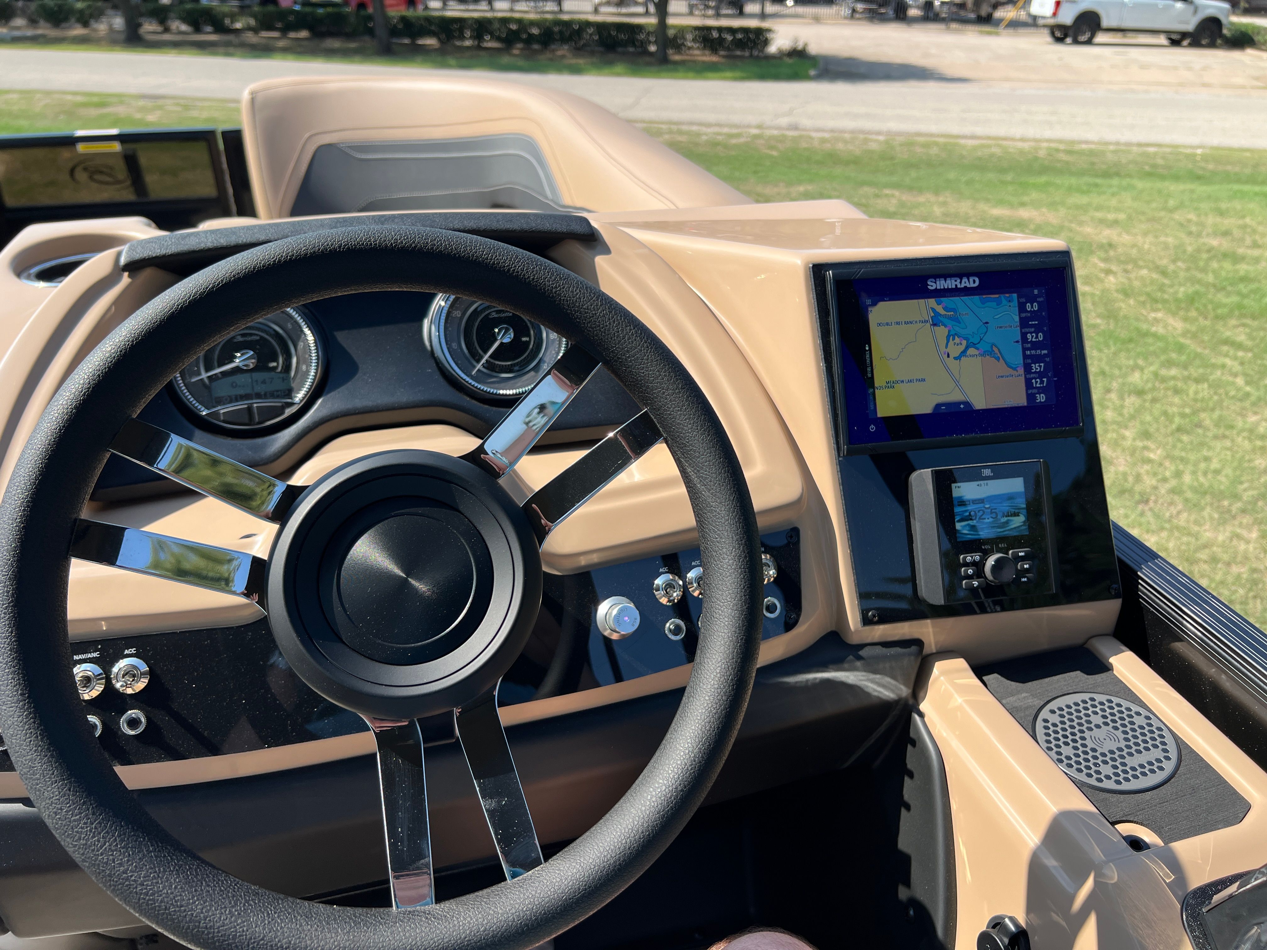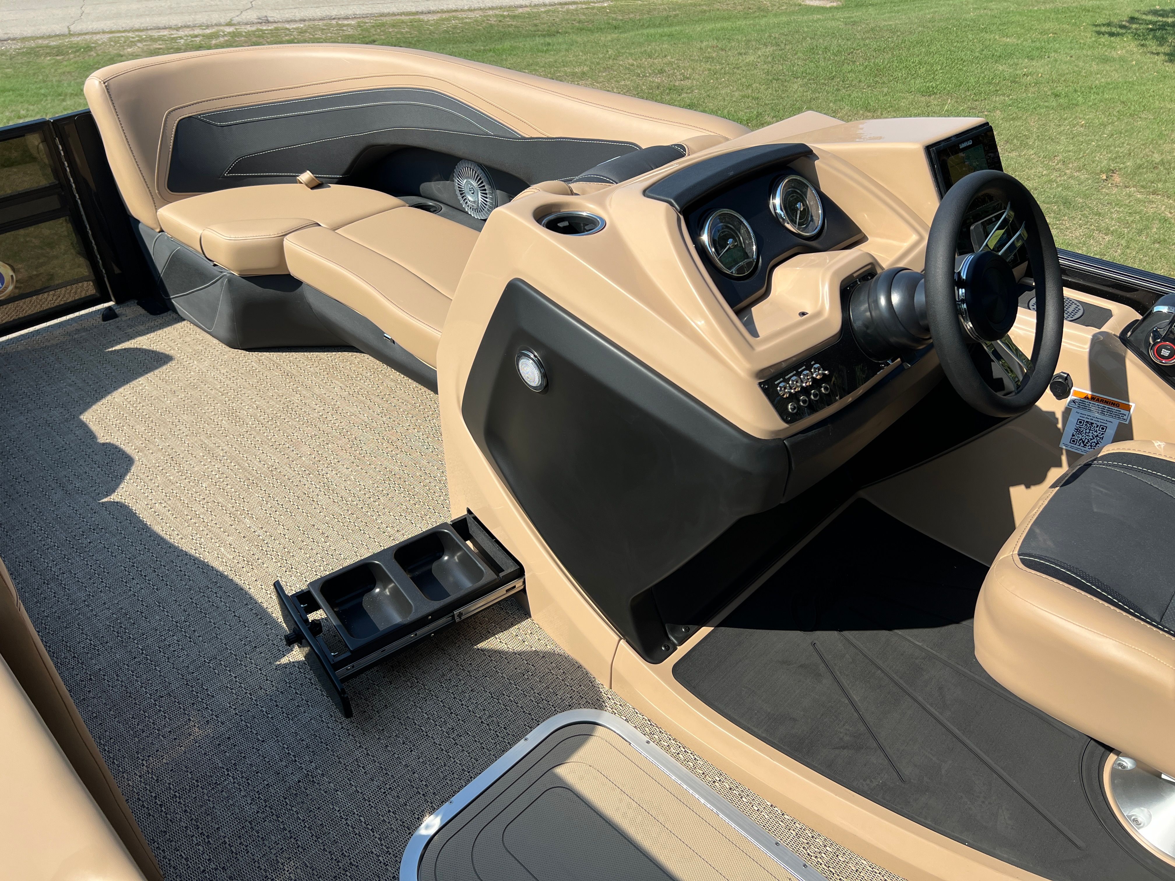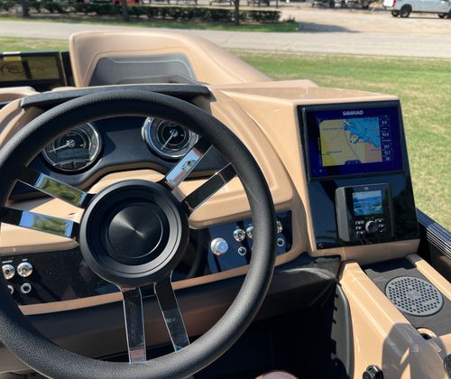 The Barletta Cabrio C22UC is packed with premium features designed to enhance your boating experience. The Triple Toon Package with midship storage offers increased stability, improved handling, and convenient storage solutions for all your gear. Digital gauges provide accurate, real-time information at a glance, while the Simrad 7" G07 XSR Chartplotter/Multifunction Display puts navigation and system management at your fingertips. The stainless steel flag pole with American flag adds a patriotic touch, showcasing your pride wherever you go. Every detail, from the luxurious Carmella Tan with Onyx furniture to the Amore Tan flooring, is crafted for comfort and style, ensuring that your time on the water is always enjoyable.