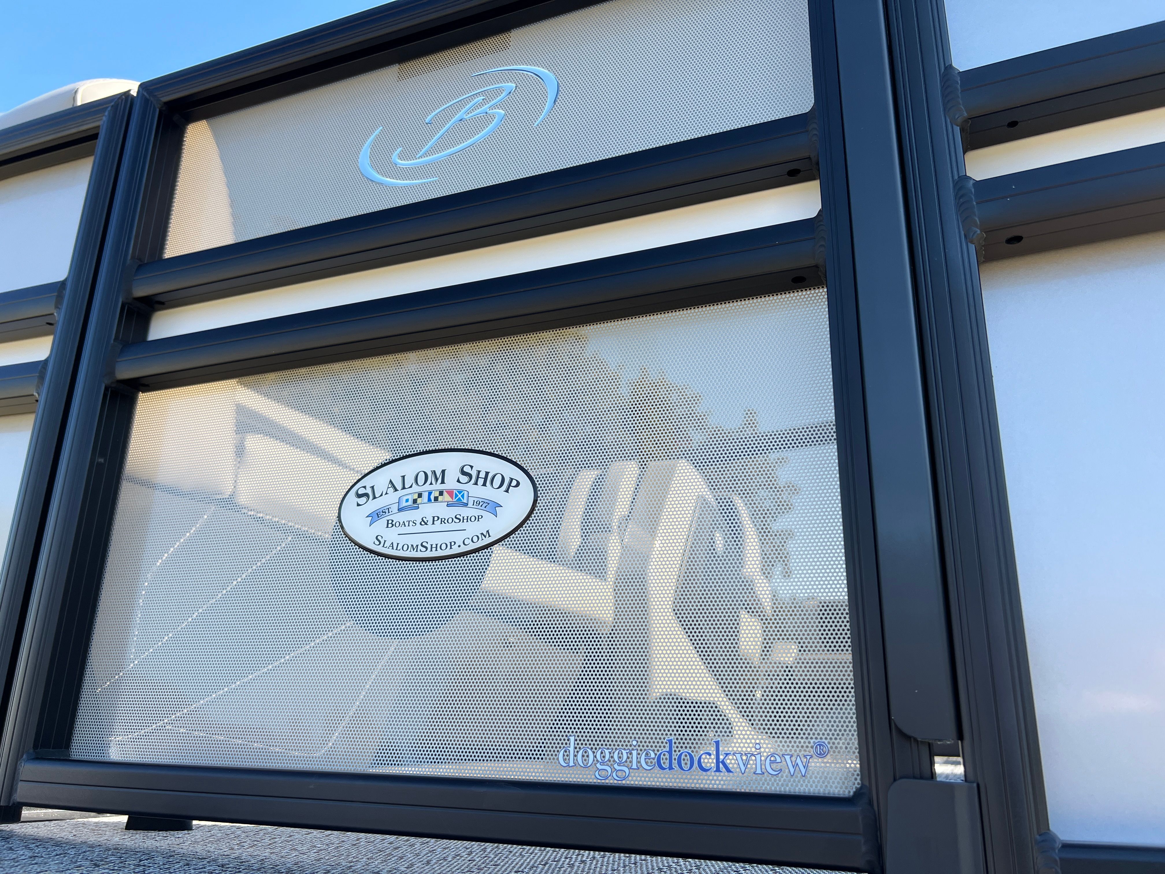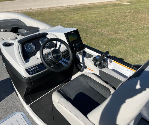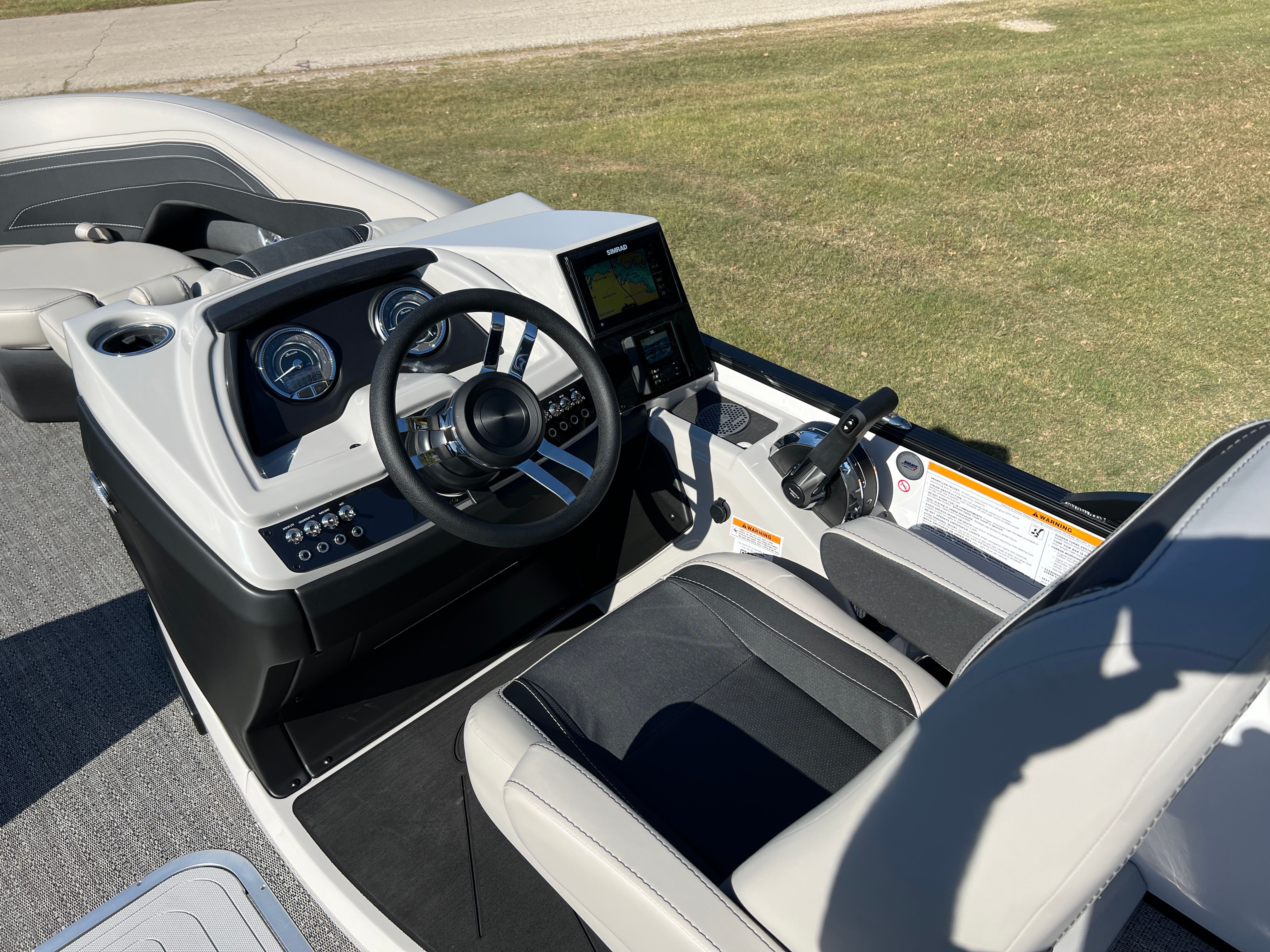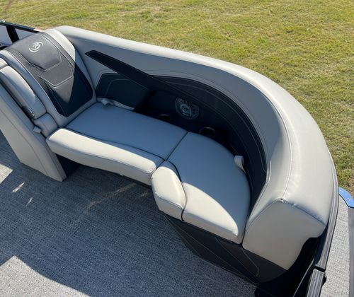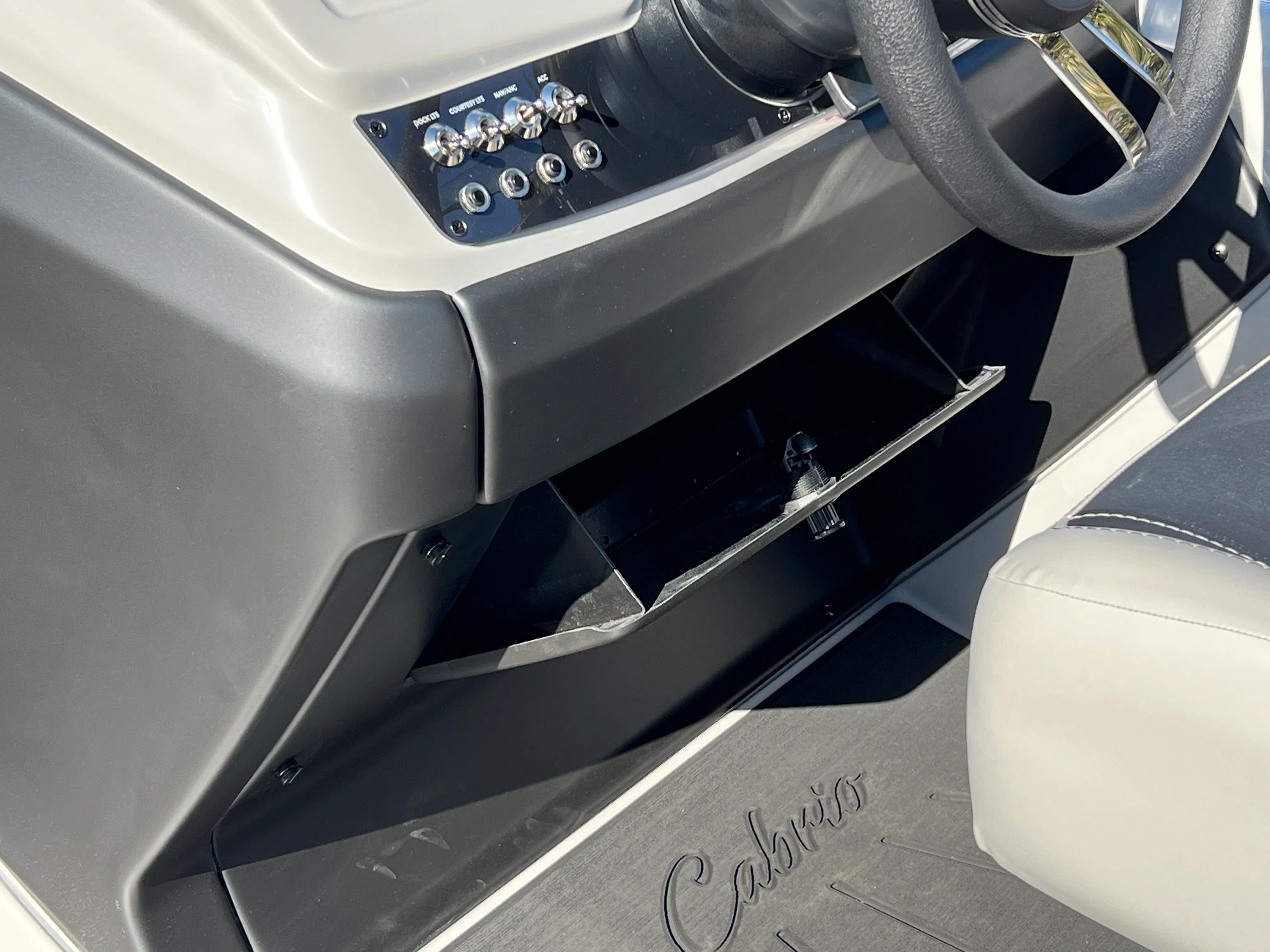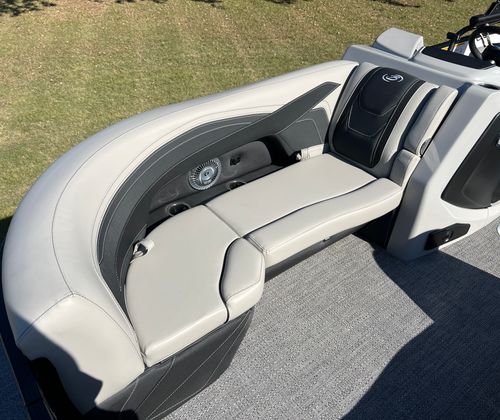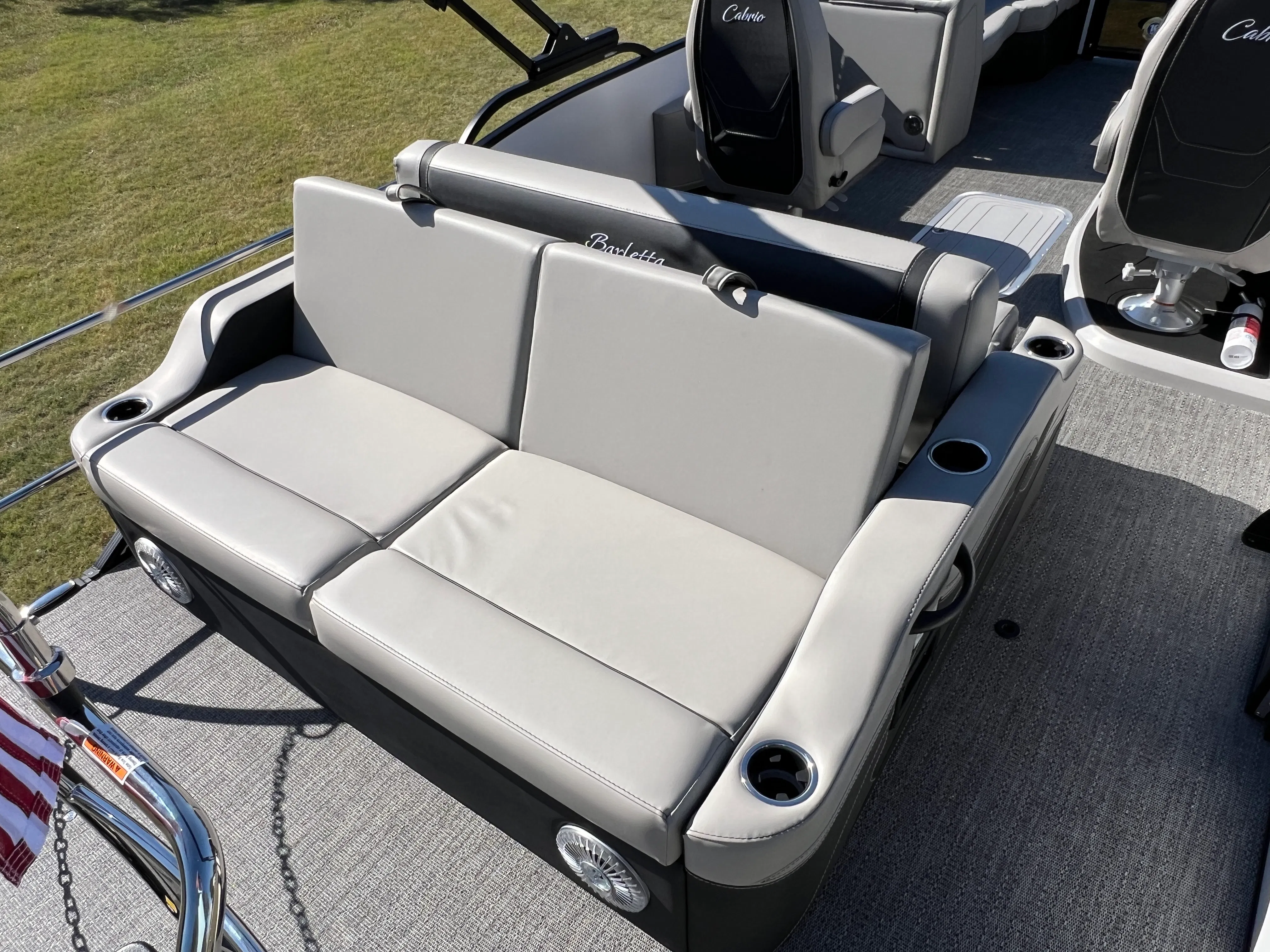 Step aboard the Cabrio C22UC and discover a world of premium features designed for comfort and style. The railskin color in Champagne, accented with Winter White, creates a sophisticated exterior that stands out on the water. The Blackout Package Cabrio adds a sleek, modern touch, while the Marquesan Gray furniture with Onyx accents provides a plush and inviting atmosphere for passengers. The Amore Gray flooring is both stylish and practical, offering a durable surface that’s easy to maintain.The triple toon package with midship storage is a game-changer for those who value organization and convenience. This feature provides ample space for stowing gear, water toys, and personal items, keeping the deck clutter-free and ready for fun. The stainless steel flag pole with an American flag adds a patriotic flair, making this pontoon boat a true showstopper at any marina or waterfront event.