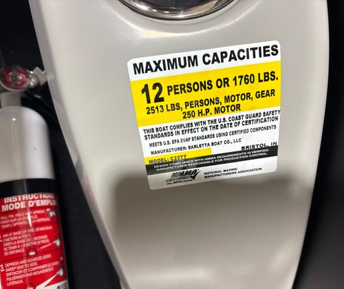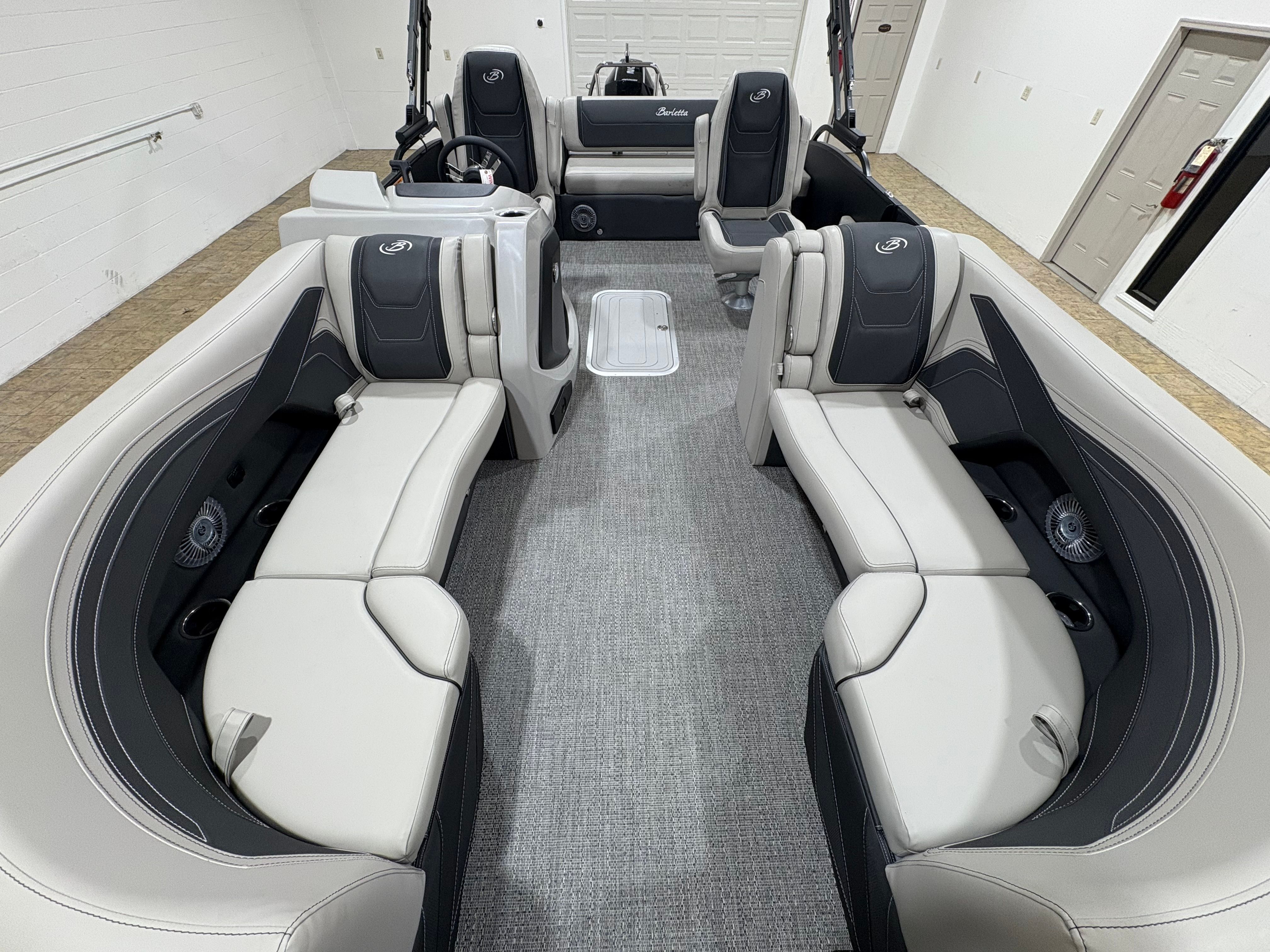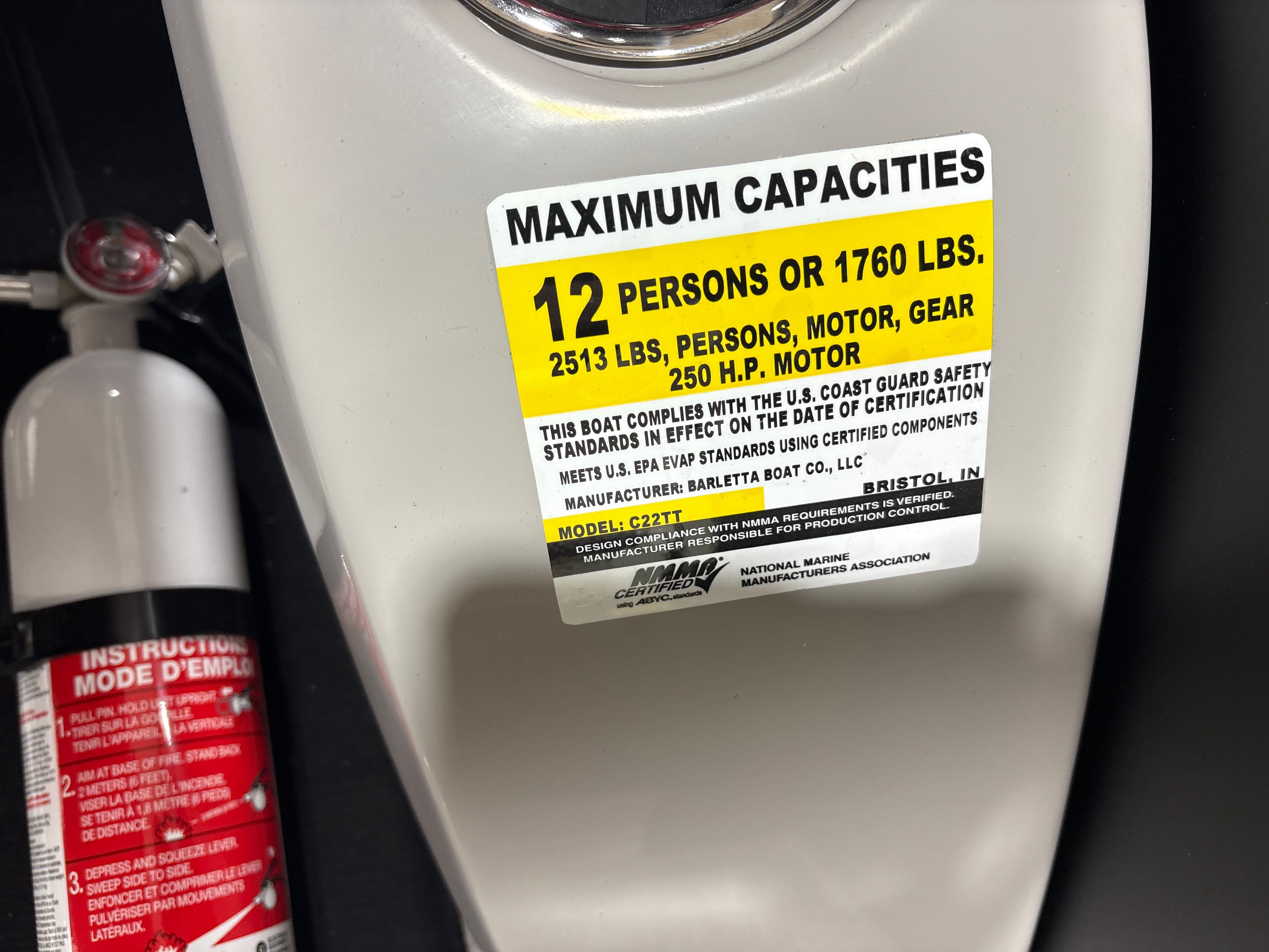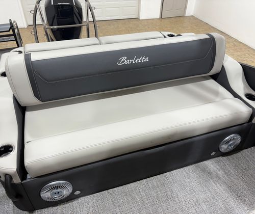 This Barletta boat for sale comes loaded with features that elevate both comfort and convenience. The Triple Toon Package with midship storage provides enhanced stability and extra space for your gear, making it ideal for extended outings. The interior RGB lighting package allows you to set the perfect mood for any occasion, whether it is a sunset cruise or an evening gathering with friends. The stainless steel flag pole with an American flag adds a patriotic touch to your vessel, while the Blackout Package Cabrio gives the exterior a sleek, modern look. The Marquesan Gray with Onyx furniture and Amore Gray flooring not only look stunning but are also designed for durability and easy maintenance.