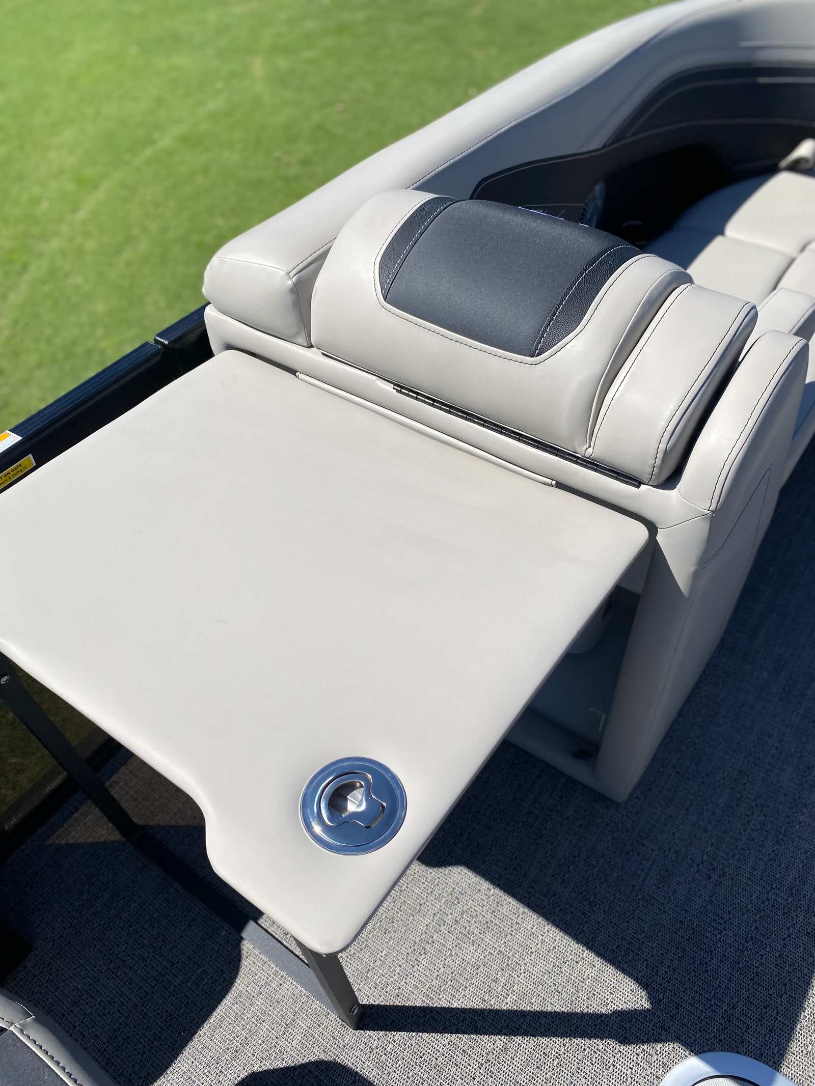 Step aboard the Cabrio C22UC and you’ll immediately notice the attention to detail in its design and amenities. The furniture is finished in Marquesan Gray with Onyx accents, providing a sophisticated and inviting atmosphere. The flooring is Amore Gray, adding a touch of elegance while being durable and easy to maintain. The triple toon package not only boosts performance but also includes convenient midship storage, perfect for stowing gear, water toys, or picnic supplies.The onboard battery charger supports two batteries, ensuring you have reliable power for all your electronics and accessories throughout your day on the water. The Blackout Package Cabrio gives the boat a sleek, modern aesthetic, while the Railskin Color and accent choices make it uniquely stylish. Every element of the Cabrio C22UC is crafted to enhance your boating experience, from the plush seating to the thoughtful storage solutions.