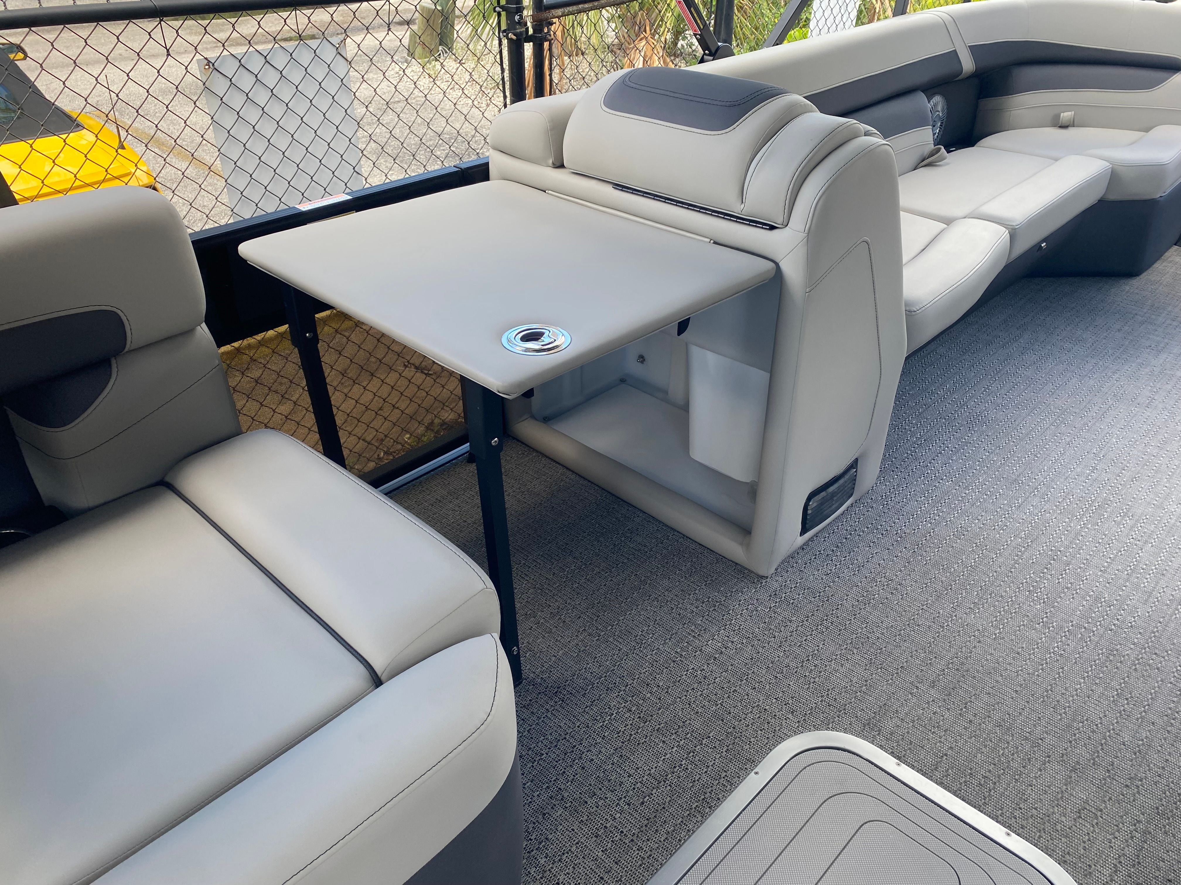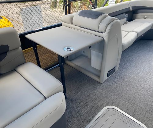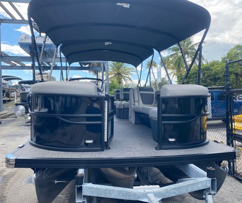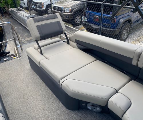 The Cabrio C24M is loaded with special features that set it apart from other pontoon boats for sale. The Meridian Flip Table, complete with a pedestal and base, offers versatile space for dining, games, or simply relaxing with friends. The Interior RGB Lighting Package Cabrio lets you set the mood with customizable lighting, perfect for evening cruises or lively gatherings. The Coastal Edition Cabrio ensures enhanced durability and performance in saltwater environments, while the Railskin Blackout Package Cabrio adds a bold, modern aesthetic to the exterior.Double Bimini tops provide generous shade on sunny days, and the exterior lighting – including white underdeck and underwater lights – creates a striking visual effect after sunset. The Marquesan Gray furniture with Charcoal accents is both stylish and comfortable, while the Amore Gray flooring is designed for durability and easy cleaning. Every detail of the Cabrio C24M is thoughtfully engineered to maximize comfort, convenience, and enjoyment on the water.