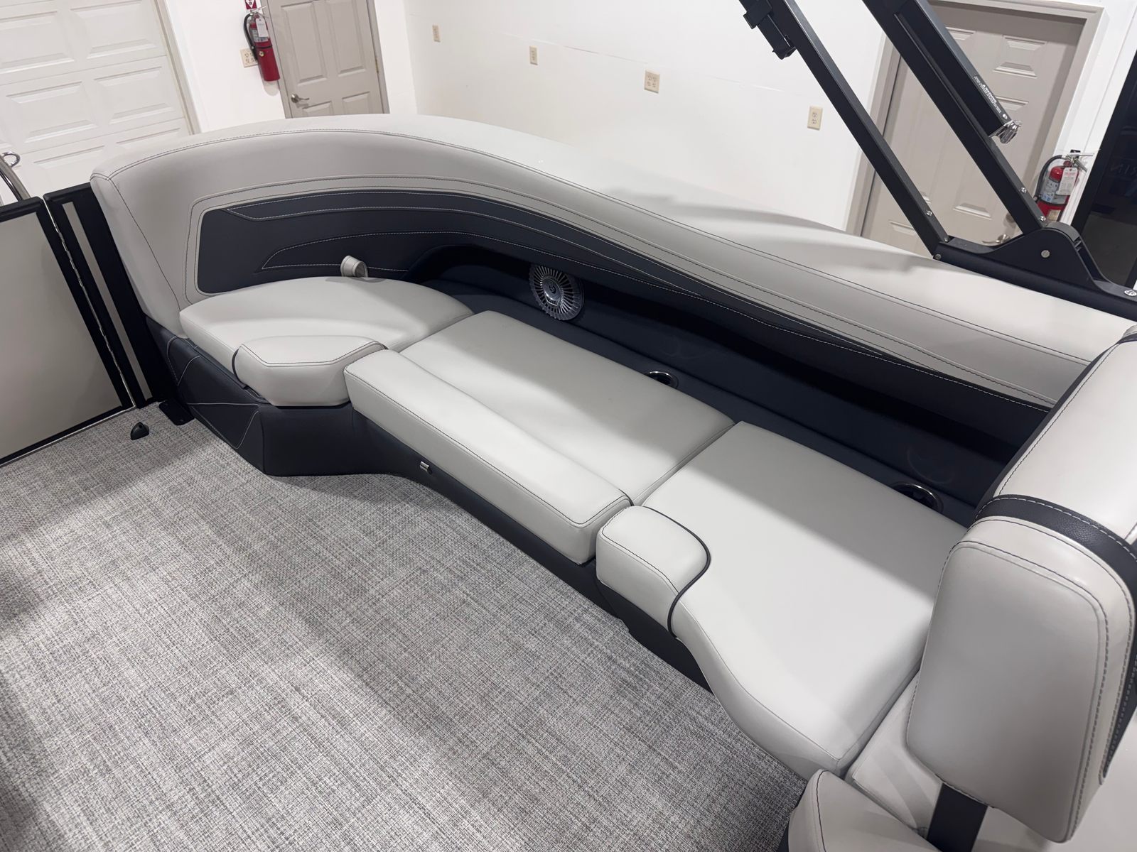 The Barletta Cabrio C24Q is loaded with special features that elevate your boating experience. The striking Gray Moonstone railskin color, accented by Champagne highlights and the Blackout Package Cabrio, gives this pontoon a modern and sophisticated look that is sure to turn heads at the marina. Inside, the Marquesan Gray furniture with Onyx accents creates a luxurious and inviting atmosphere, perfectly complemented by the Amore Gray flooring that is both stylish and easy to maintain.One of the standout features is the Triple Toon Package with midship storage, exclusive to the Cabrio series. This configuration enhances stability and handling, while the additional storage space ensures you have room for all your gear, water toys, and essentials. The clipped playpen cover with poles offers convenient protection from the elements, keeping your pontoon boat in pristine condition when not in use.