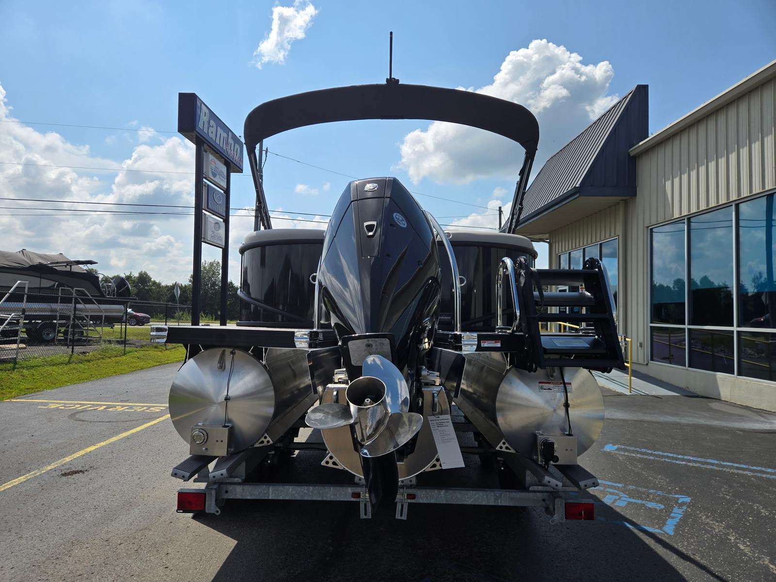 The 2026 Barletta Cabrio C24Q is a pontoon boat that measures just over 25 feet in length, offering ample space for relaxation, entertainment, and social gatherings. With its sleek Black Diamond Railskin color and the sophisticated Blackout Package Cabrio, this vessel exudes modern elegance from bow to stern. The Marquesan Gray with Onyx furniture adds a touch of luxury to the spacious deck, while the Amore Gray flooring provides both durability and style. Whether you’re cruising along the shoreline or anchored for a sunset gathering, this Barletta boat for sale is designed to impress.