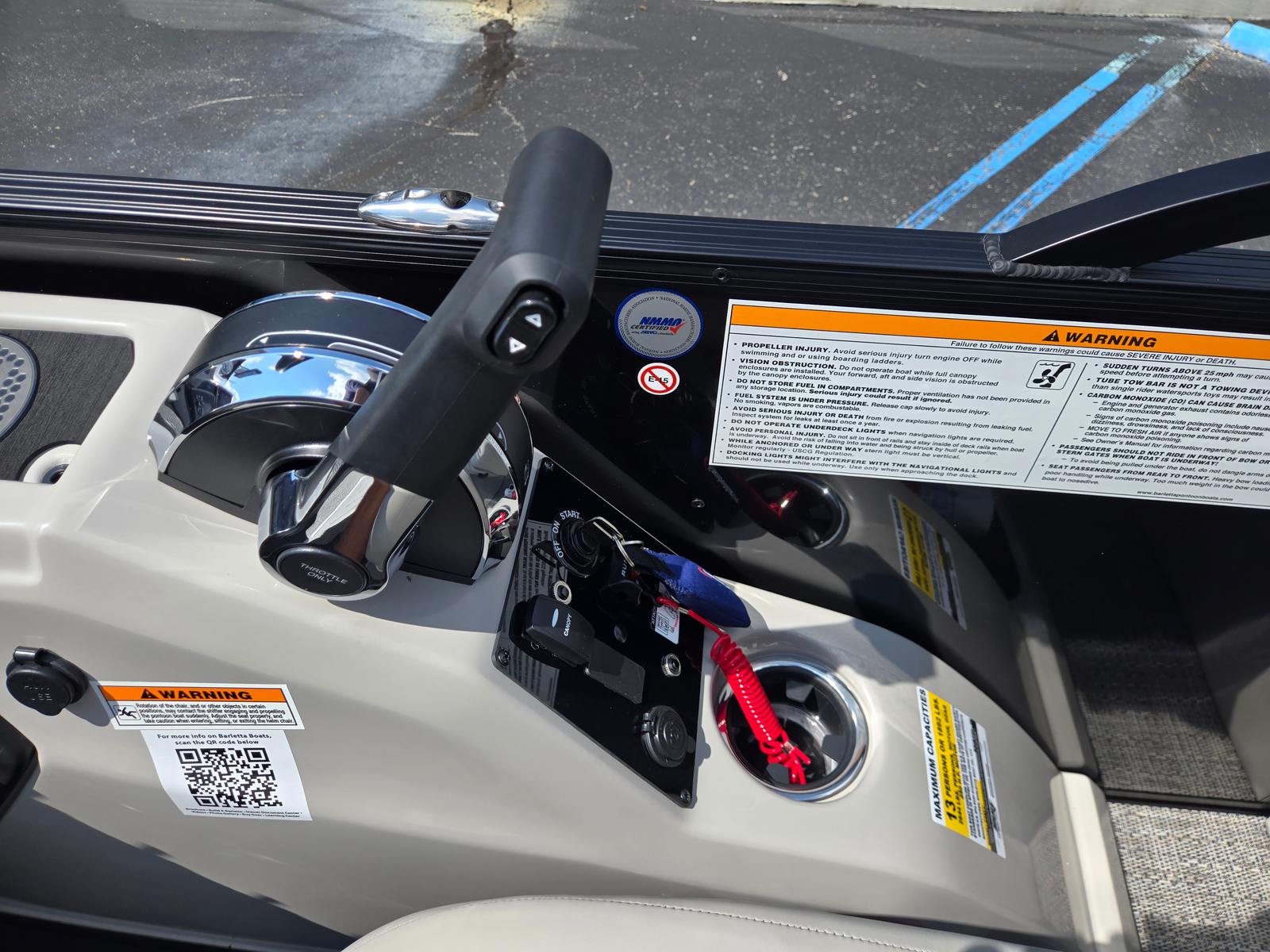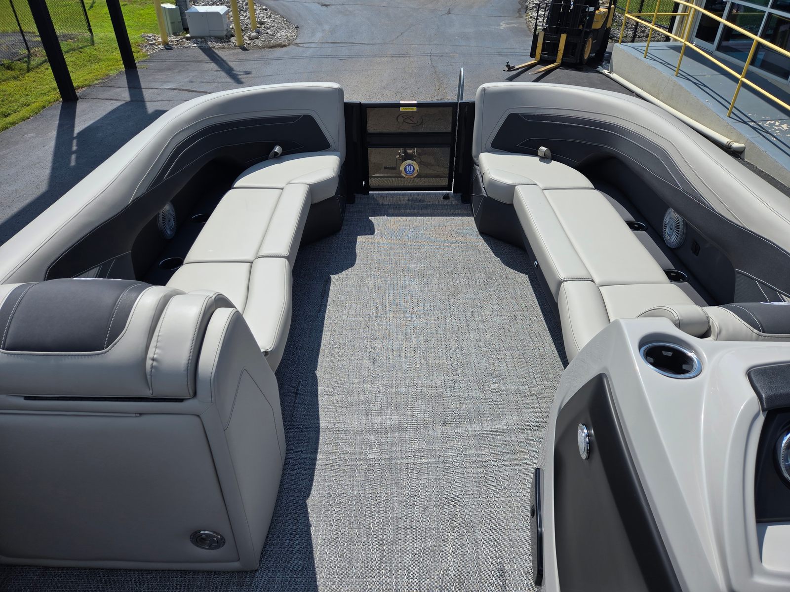 The Barletta Cabrio C24Q is packed with features that set it apart in the pontoon market. The Triple Toon Package with Midship Storage not only improves performance but also provides convenient storage solutions for gear, water toys, and personal items. The Simrad 7" G07 XSR Chartplotter/Multifunction Display offers advanced navigation and system monitoring, keeping you informed and in control throughout your journey. Exterior lighting, including white underdeck and underwater lights, enhances visibility and ambiance during evening cruises, while the Interior RGB Lighting Package Cabrio allows you to customize the mood to suit any occasion.A stainless steel flag pole with an American flag adds a patriotic touch, making your boat stand out on the water. The Railskin Packages: Blackout Package Cabrio, paired with the Black Diamond color, creates a striking visual profile that’s sure to turn heads at the marina. The Marquesan Gray with Onyx furniture is both comfortable and stylish, providing the perfect setting for relaxation and socializing.