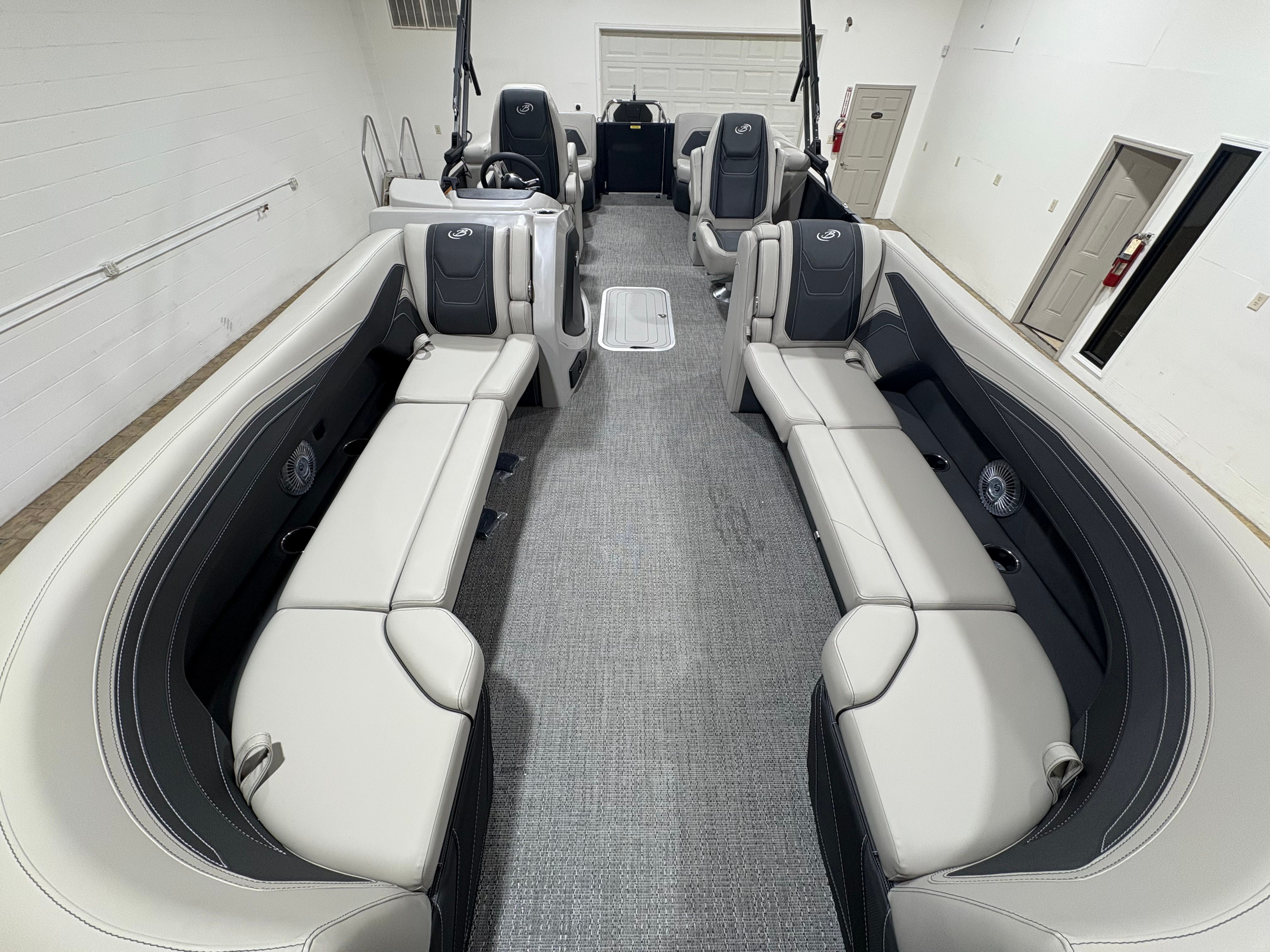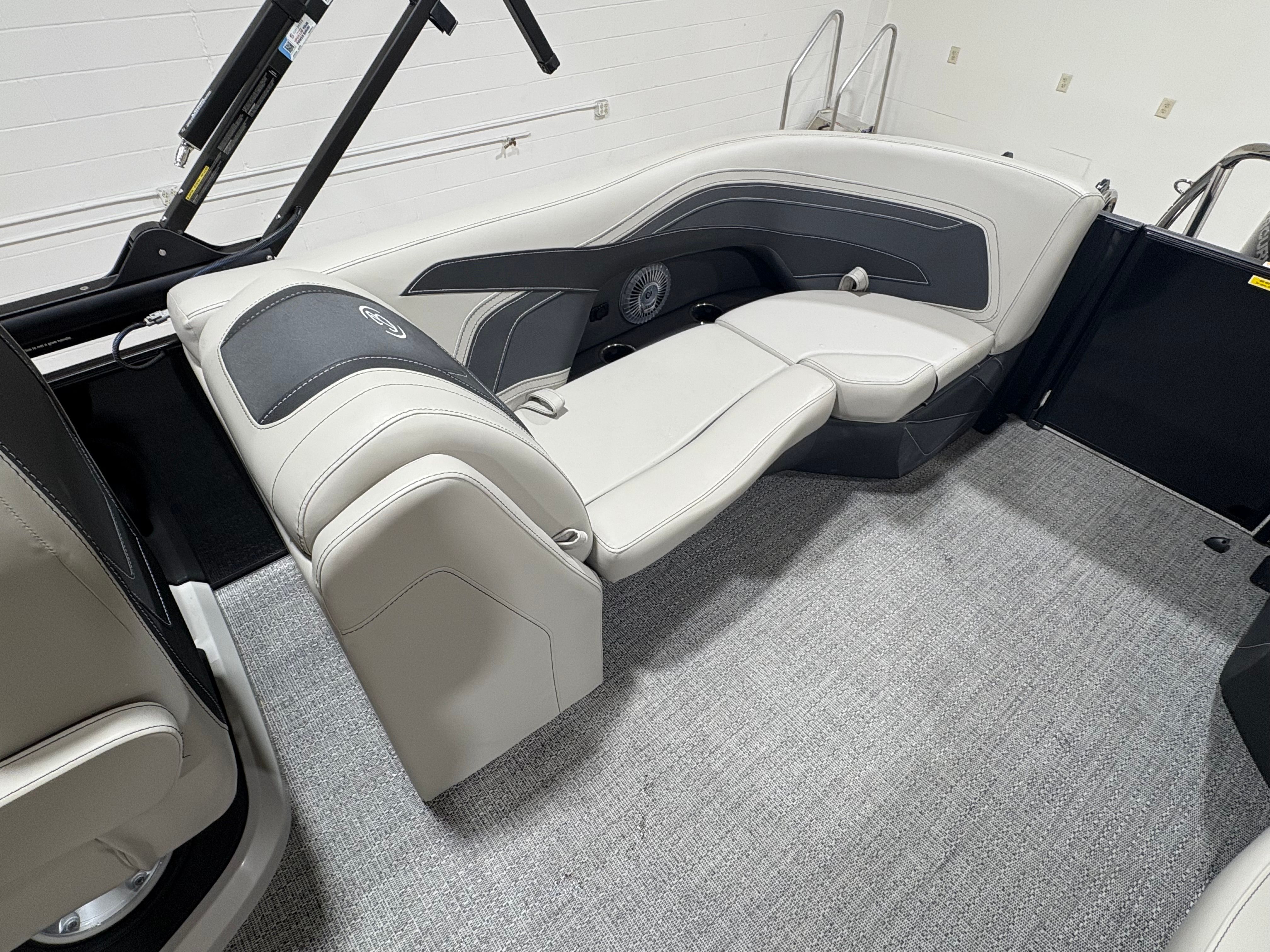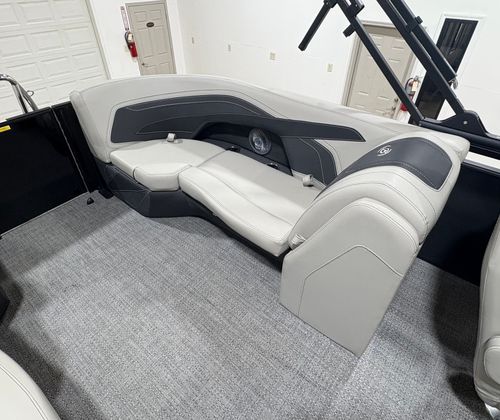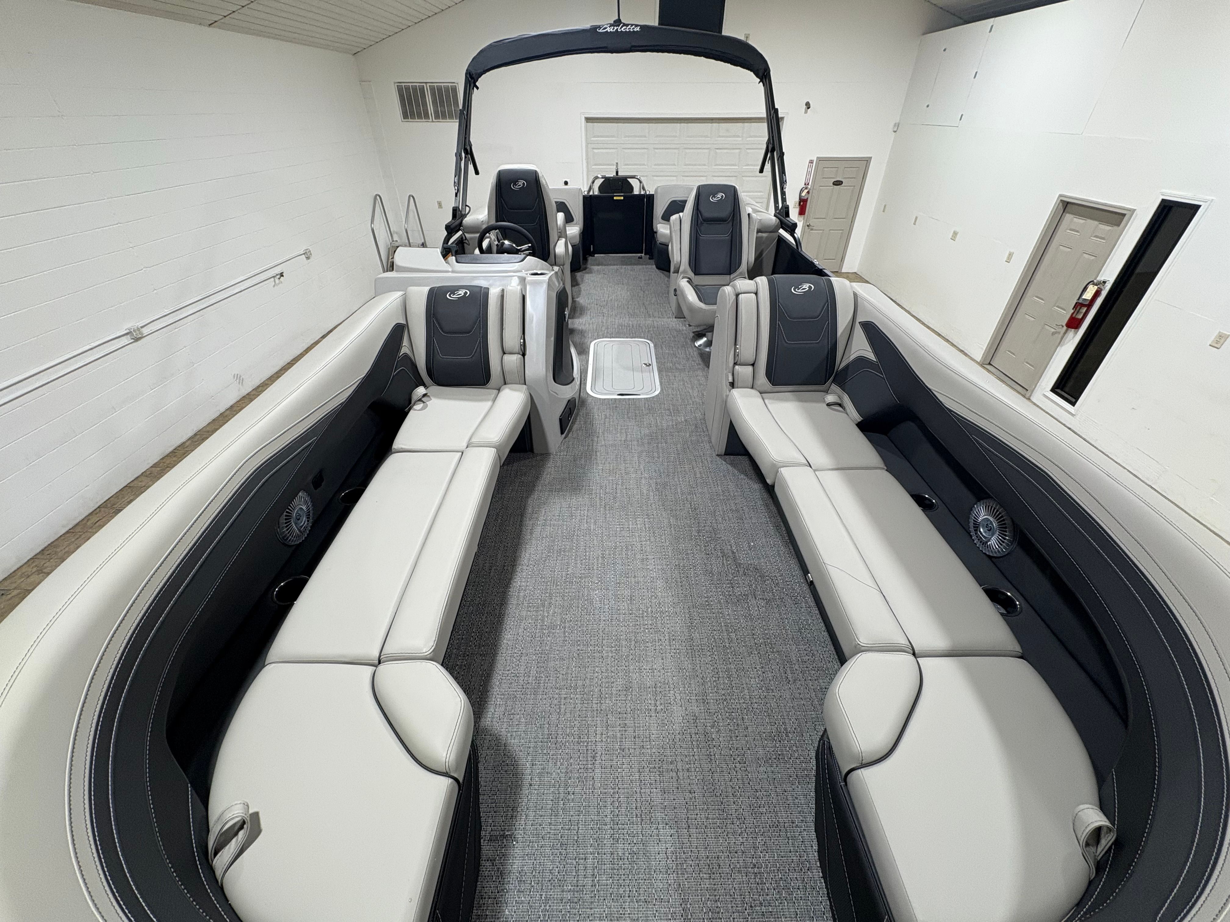 The 2026 Barletta Cabrio C24QC is packed with premium features that set it apart from other pontoon boats for sale. The Blackout Package Cabrio gives the exterior a bold, modern look, while the Black Diamond railskin adds a touch of sophistication. Inside, the Marquesan Gray with Onyx furniture provides a comfortable and stylish setting for passengers, complemented by the Amore Gray flooring that is both durable and easy to maintain.One of the standout features of this model is the Triple Toon Package with midship storage, offering enhanced stability and ample space for storing gear, water toys, or picnic essentials. The rigging includes a stainless steel prop for optimal performance and durability. For those who appreciate attention to detail, the stainless steel flag pole with an American flag adds a patriotic touch to your boating adventures.The interior RGB lighting package creates a vibrant and customizable atmosphere, perfect for evening cruises or entertaining guests after sunset. Every element of the Cabrio C24QC is designed to maximize comfort, convenience, and enjoyment on the water.