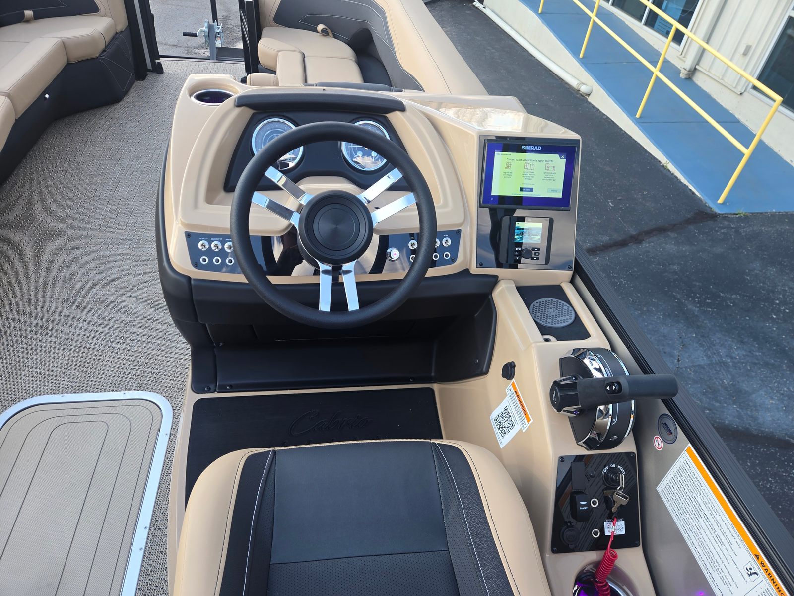 The 2026 Barletta Cabrio C24QC is a 25-foot pontoon boat that stands out for its modern design and attention to detail. With a length of 25.17 feet, this pontoon offers ample space for socializing, lounging, and making memories on the water. The sleek Railskin Color in Black Diamond, accented with Champagne, gives the Cabrio C24QC a sophisticated and eye-catching appearance. The Blackout Package Cabrio adds a touch of elegance and exclusivity, ensuring that this Barletta boat for sale turns heads wherever it goes. The Carmella Tan with Onyx furniture and Amore Tan flooring create a warm and inviting atmosphere, making every outing feel like a special occasion.