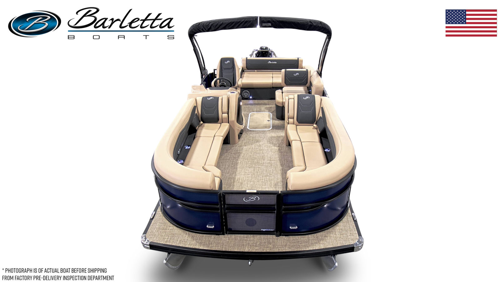The 2026 Barletta Cabrio C24U is packed with premium features designed to enhance your time on the water. The Carmella Tan with Onyx furniture offers plush seating and a refined look, while the Amore Tan flooring is both stylish and easy to maintain. The Bohemian Blue railskin color, paired with the Blackout Package Cabrio, gives this pontoon a bold and contemporary appearance that is sure to turn heads at the marina.A standout feature is the sport bimini, installed in place of the standard bimini, providing ample shade and protection from the sun so you can stay comfortable during long days on the water. The helm is equipped with a Simrad 7" G07 XSR chartplotter/multifunction display, offering advanced navigation and control at your fingertips. The exterior is accented by a stainless steel flag pole with an American flag, adding a touch of patriotic flair to your boating experience. The triple toon package with midship storage not only improves performance but also offers convenient storage solutions for your gear and essentials.