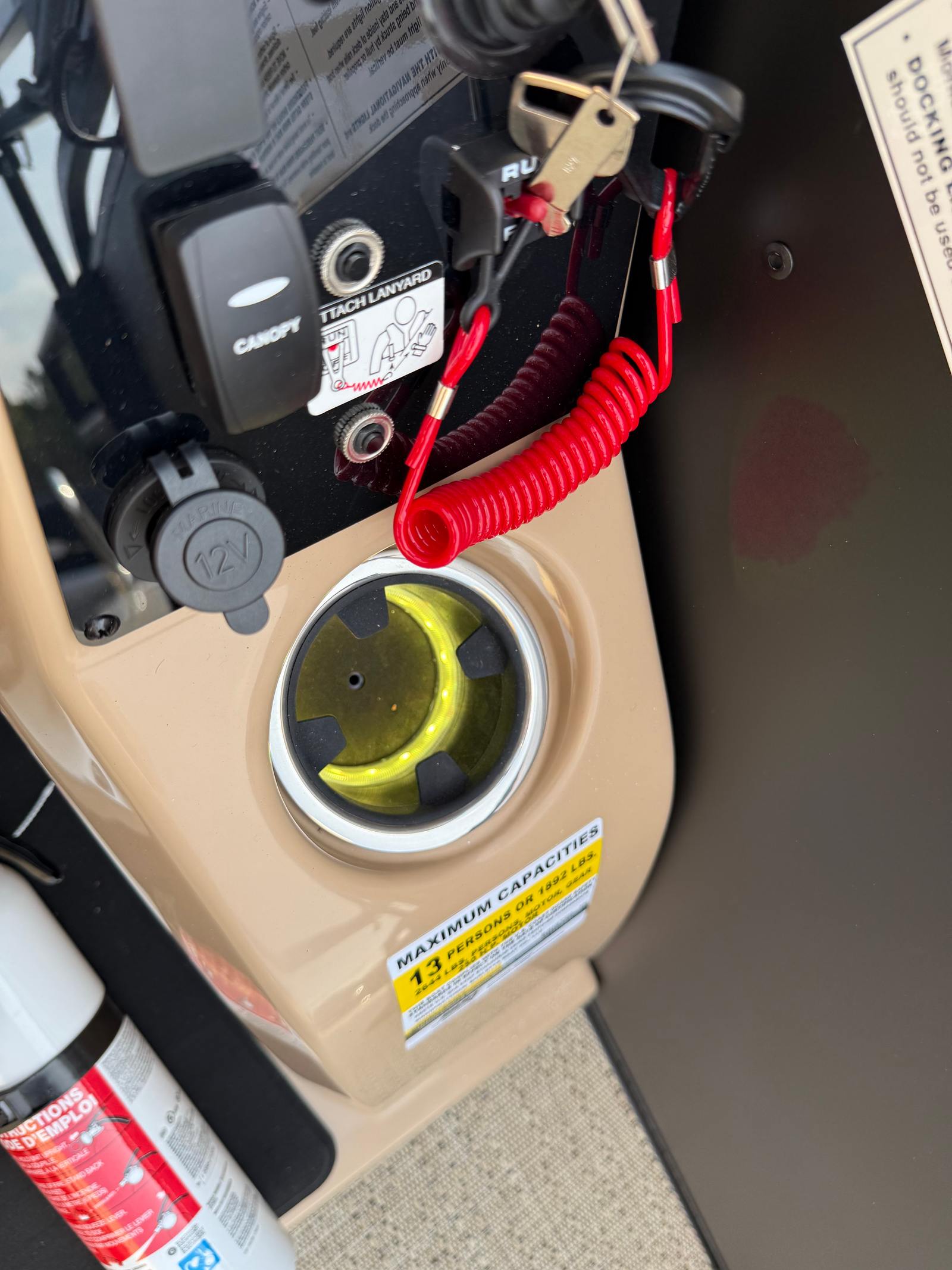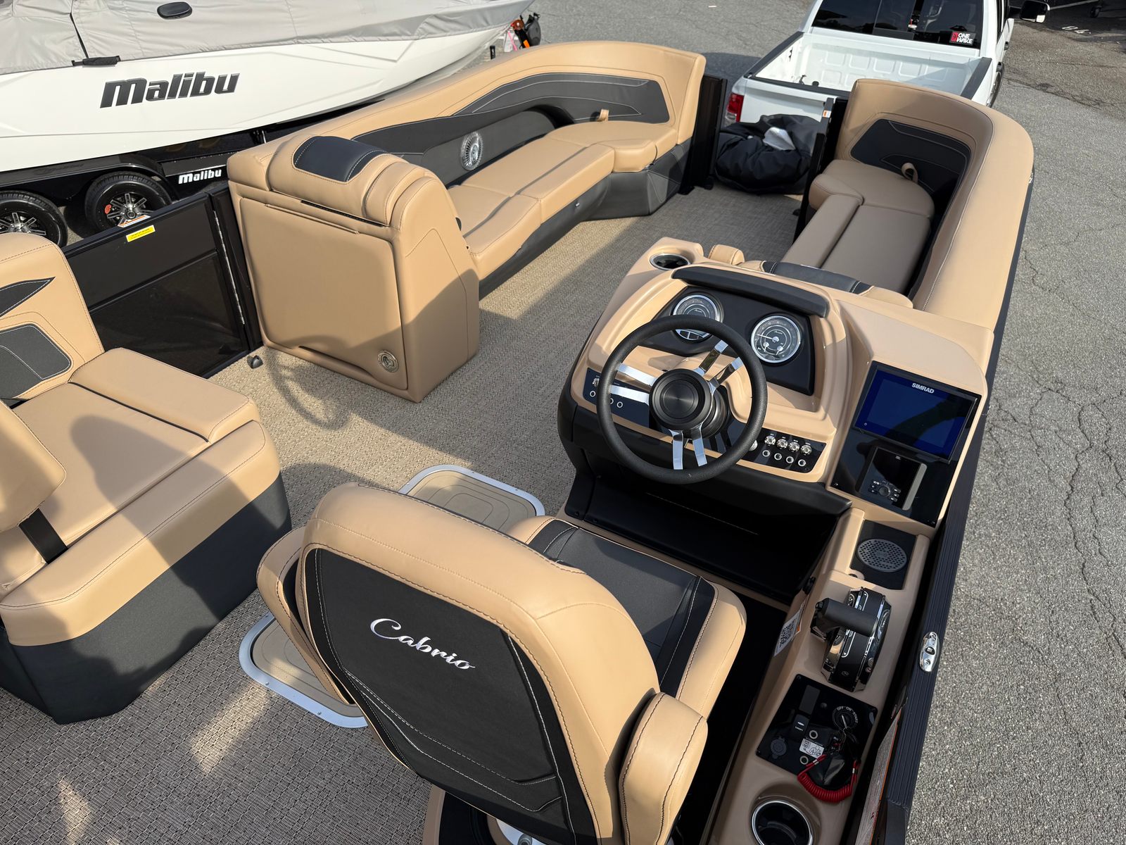 Step aboard and discover a world of premium features designed to enhance your boating experience. The Cabrio C24U boasts the striking Black Diamond railskin color, complemented by a Matte Black accent and the exclusive Blackout Package Cabrio, giving the boat a sleek, modern look that turns heads at every dock. Inside, the Carmella Tan furniture with Onyx accents creates a sophisticated and inviting atmosphere, while the Amore Tan flooring adds warmth and comfort underfoot.The Triple Toon Package with midship storage provides enhanced stability, superior ride quality, and ample space for your gear, making it easy to bring along everything you need for a day on the water. The onboard battery charger supports two batteries, ensuring reliable power for all your electronics and accessories. Every detail, from the furniture to the flooring, has been thoughtfully selected to create a harmonious and luxurious environment.